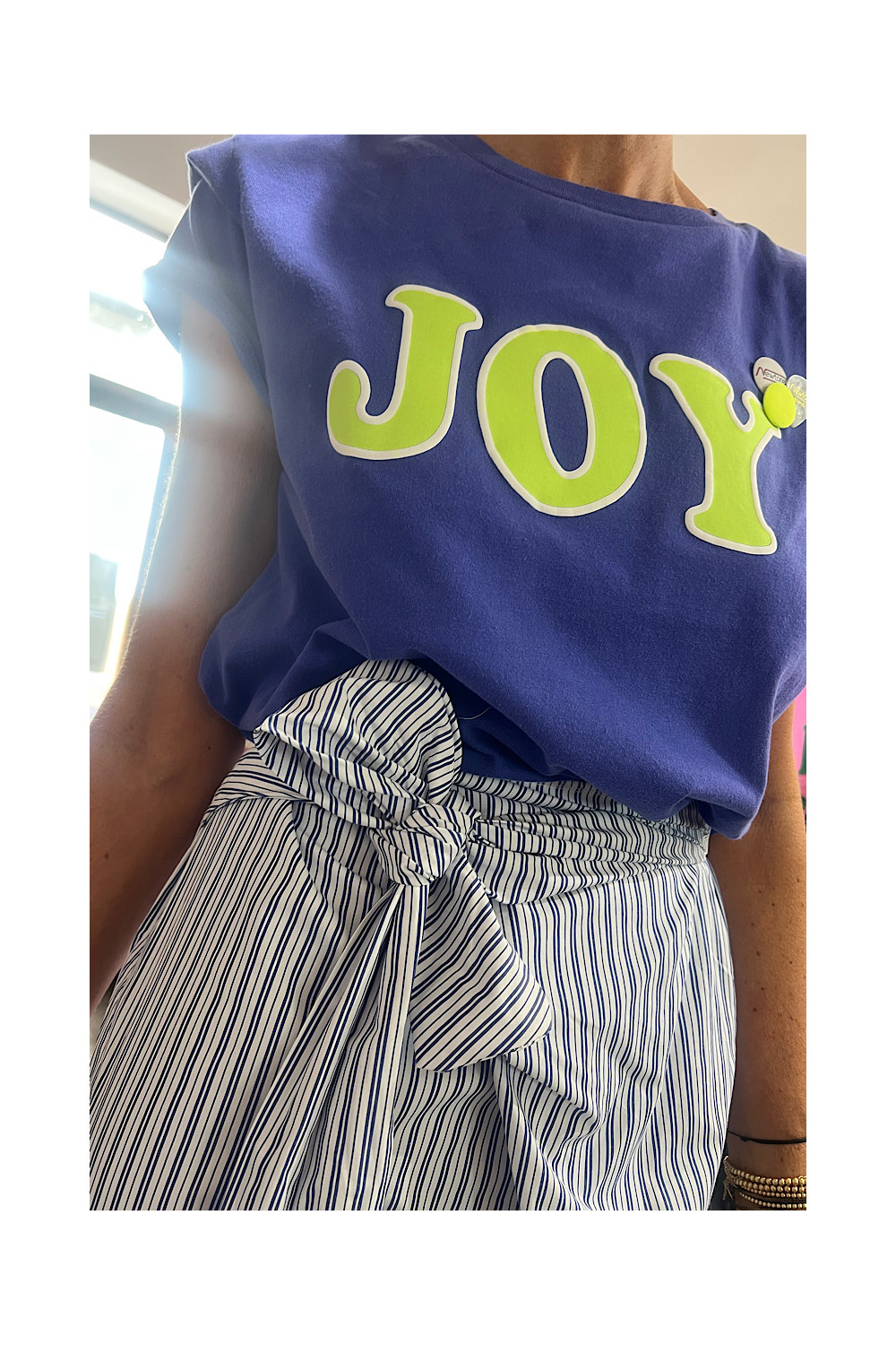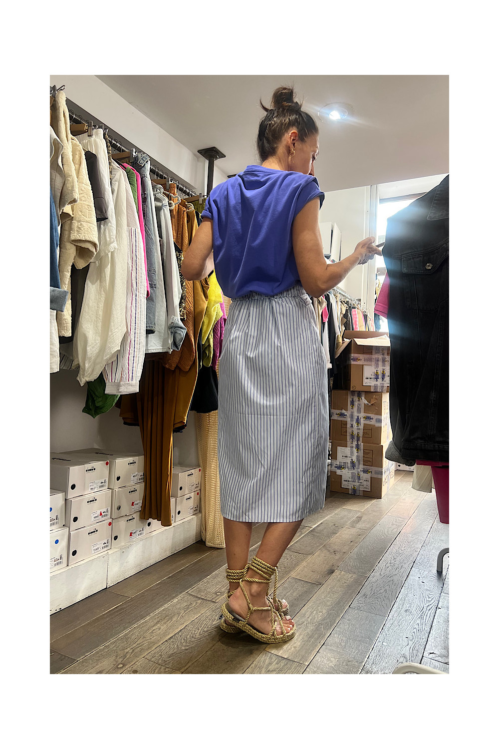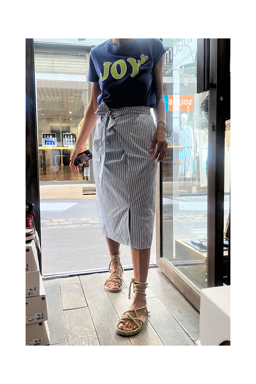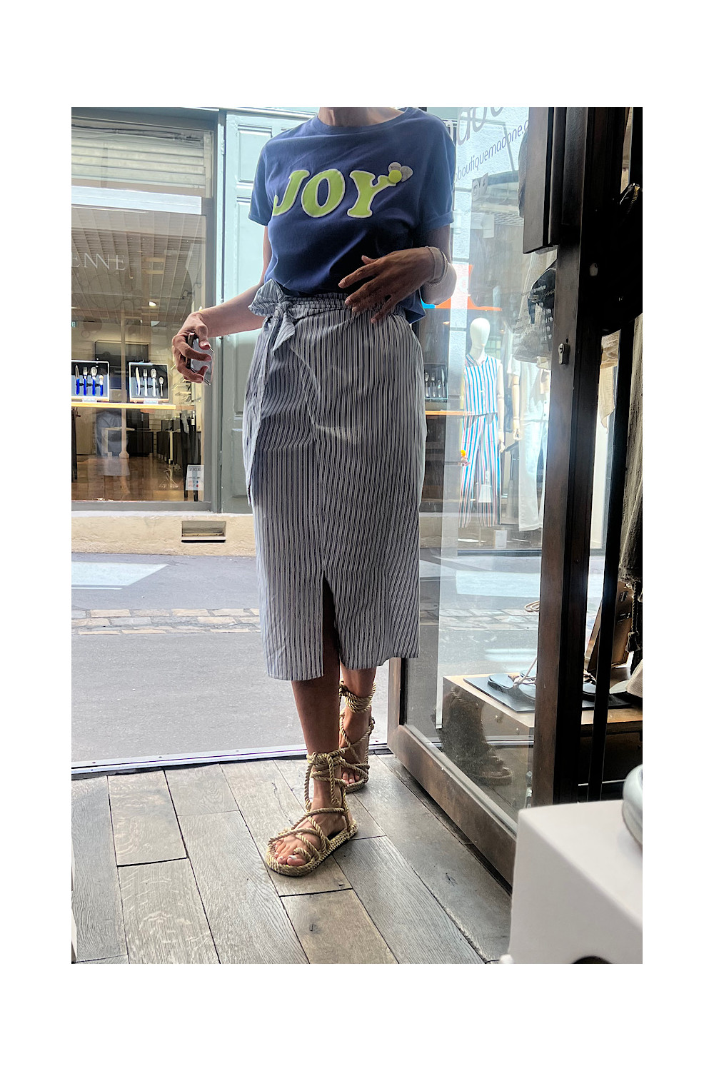 Caractéristiques : jupe droite a fines rayures bleu et blanc. Élastique à la taille, détail lien style noeud avec une fente en bas.