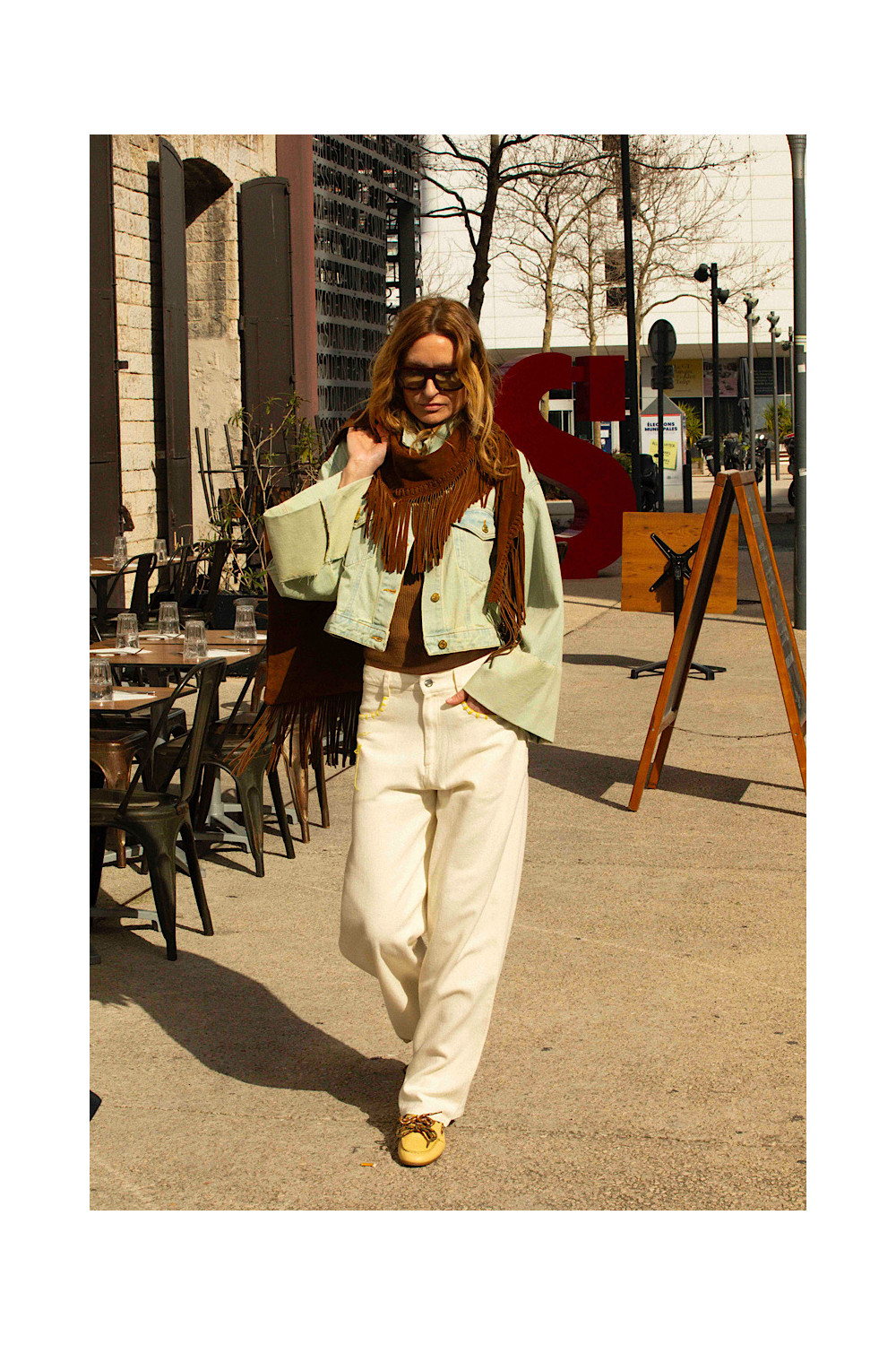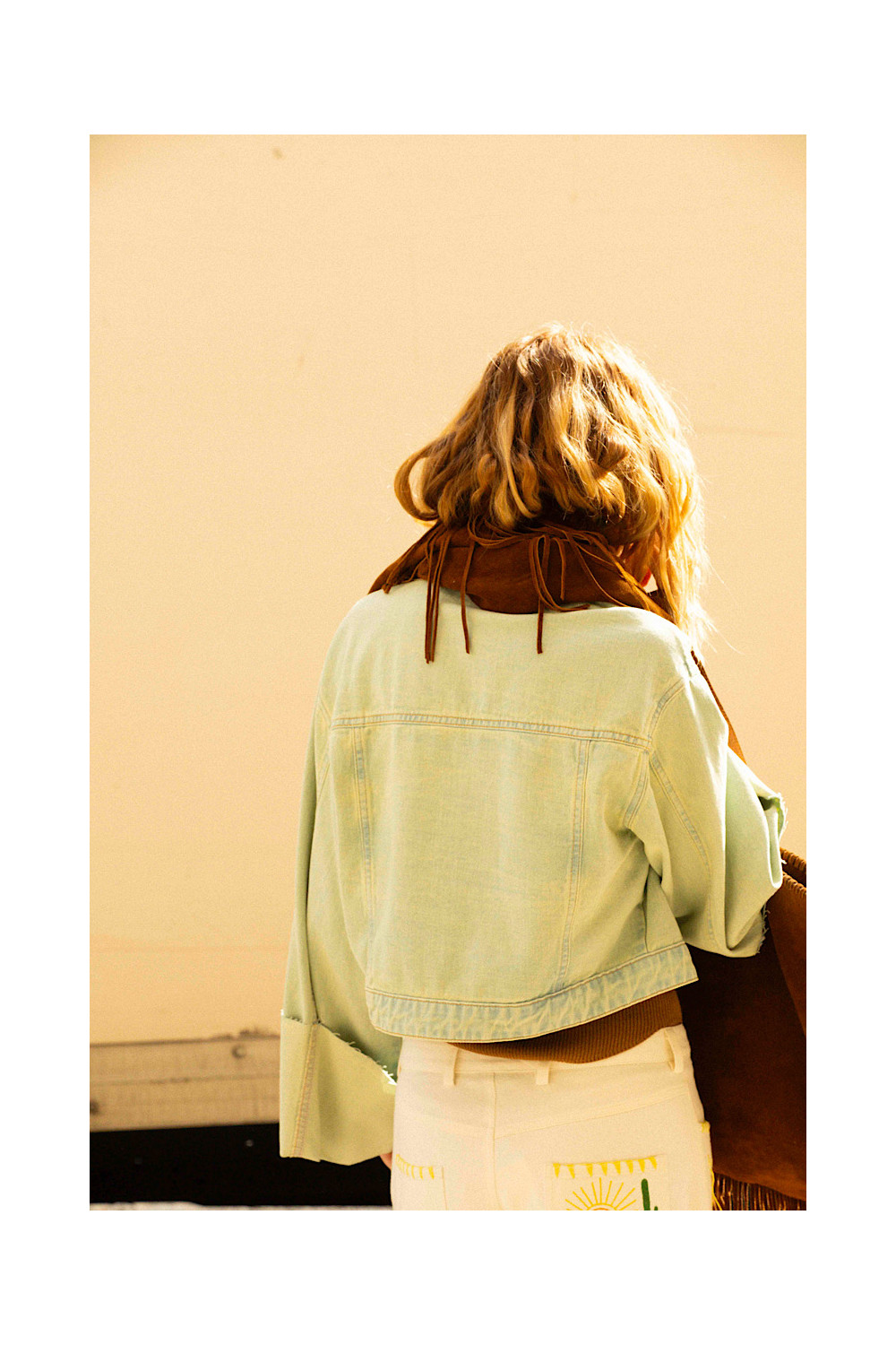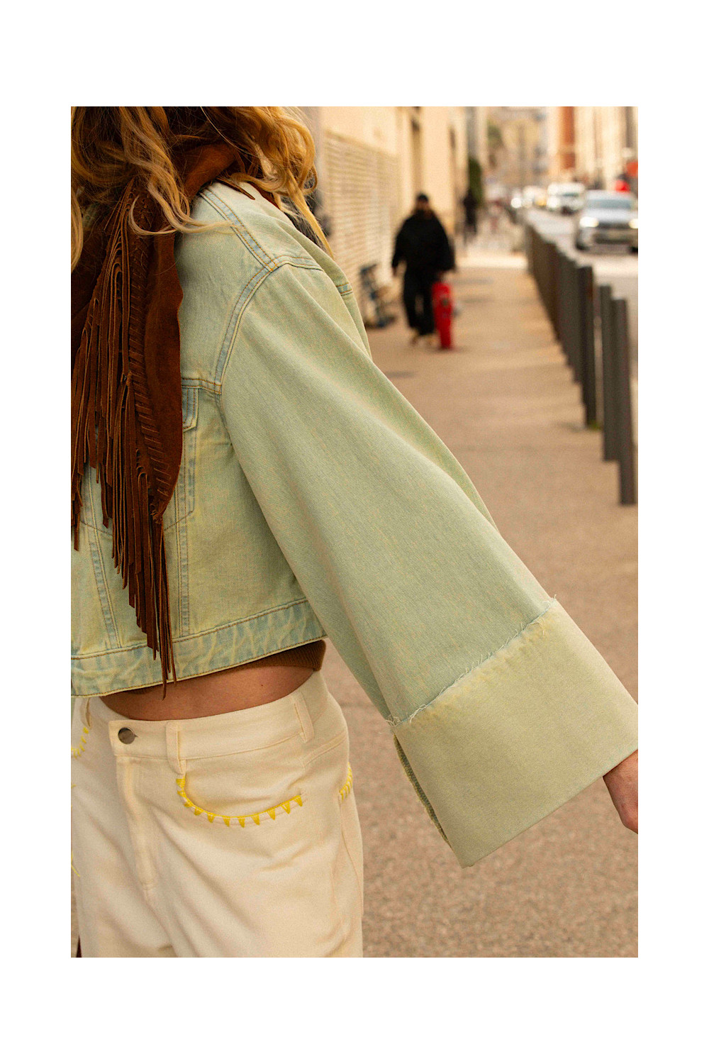 Veste ART en denim 100% coton délavé ; bleu clair avec un délavage vintage.