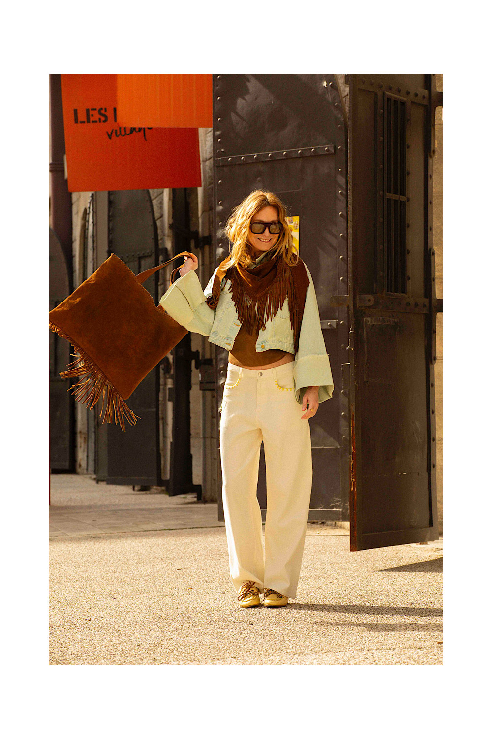 Coupe courte, large avec manches longues et larges, revers avec bords francs.