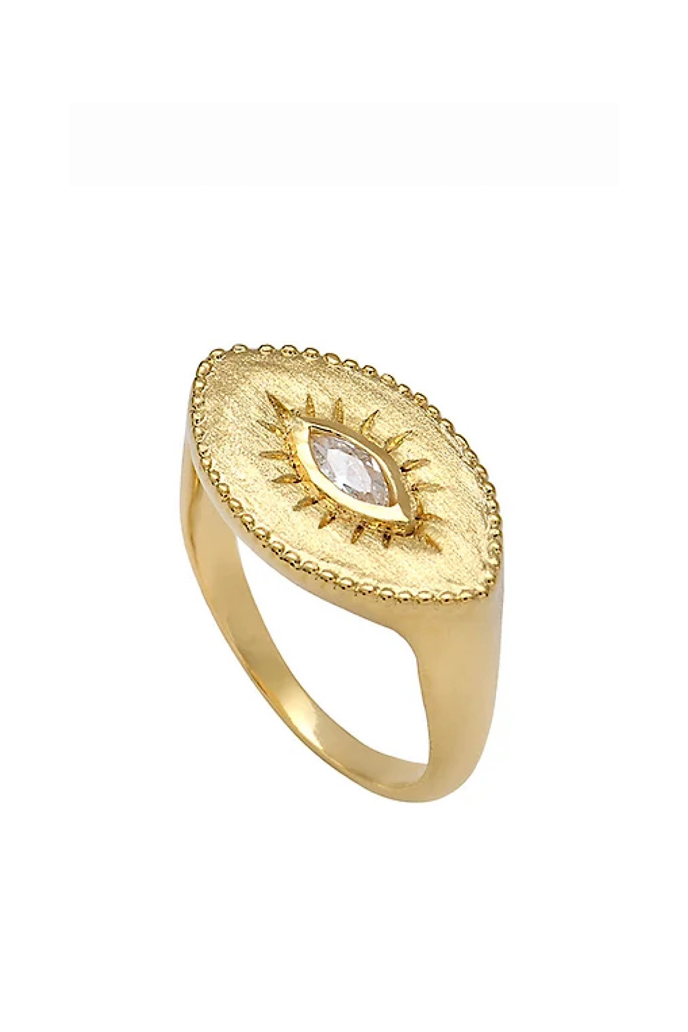Caractéristiques : Bague œil, gravée, brossée, sertie d’un zircon taille marquise en plaqué en or 3 microns.