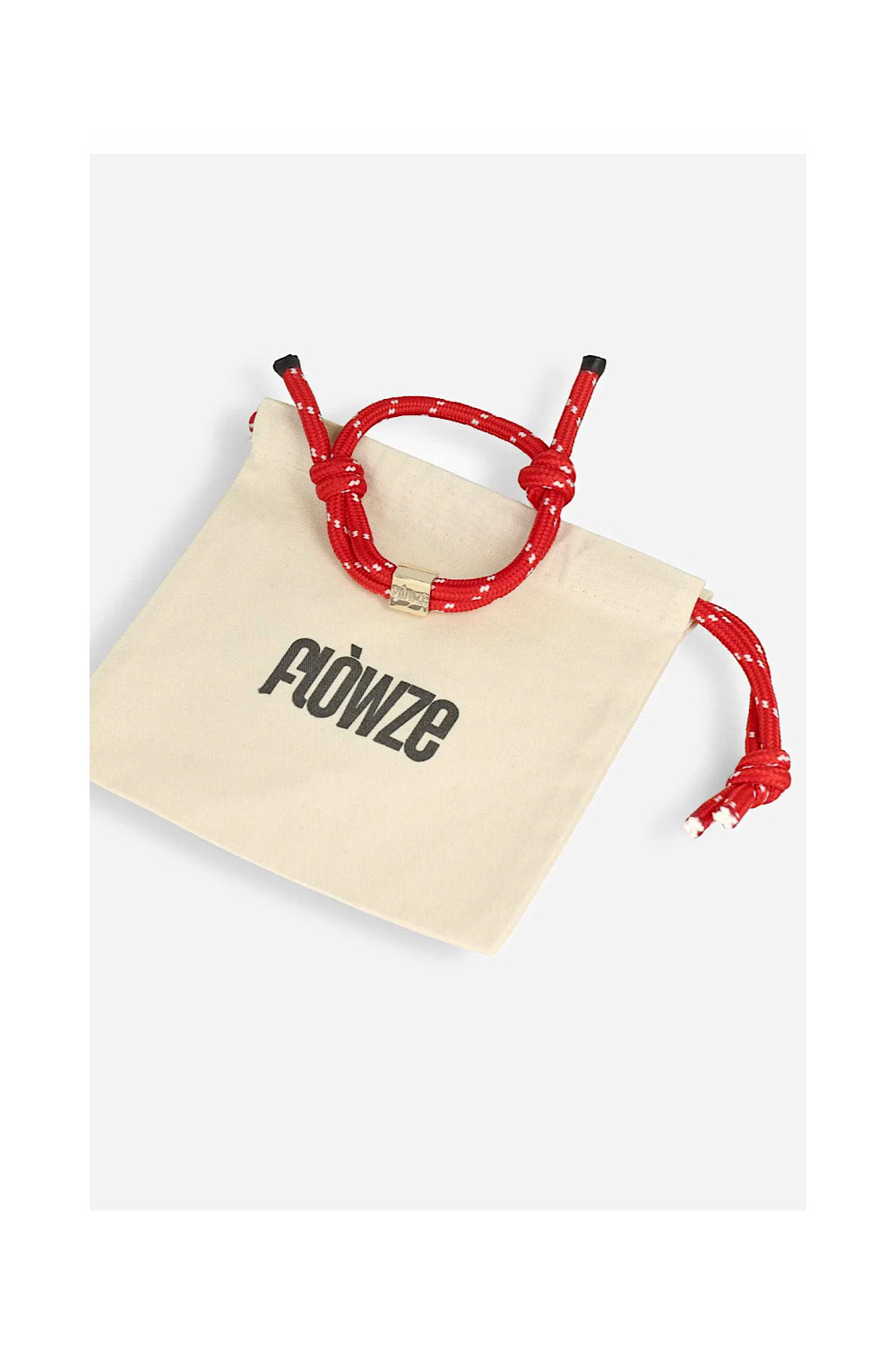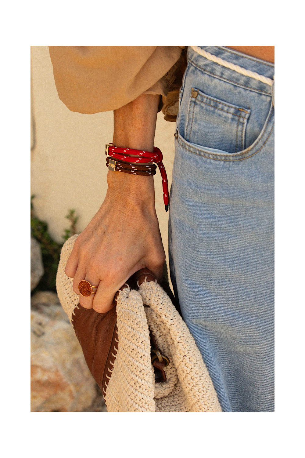 Caractéristiques : bracelet lacet rouge, carré doré avec inscription de la marque, bracelet réglable