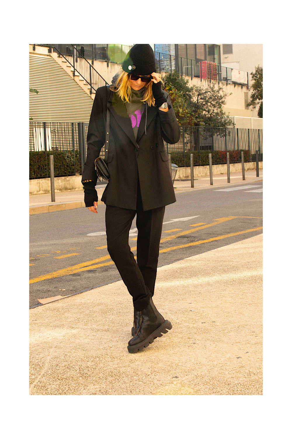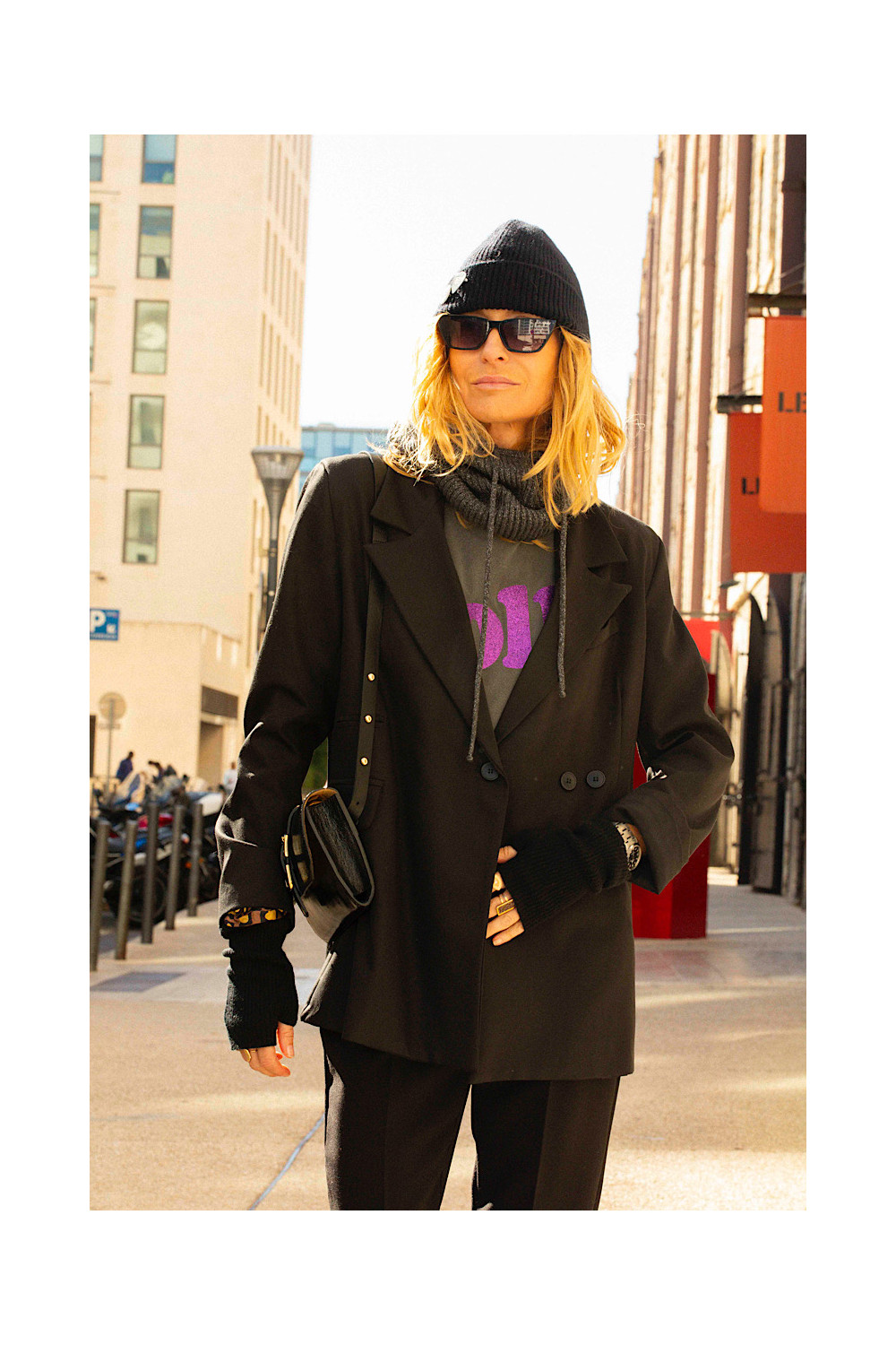Caractéristiques : blazer noir, oversize, manches longues, 3 boutons, 2 fausses poches et une plus haut à droite, fente ouverture à l'arrière