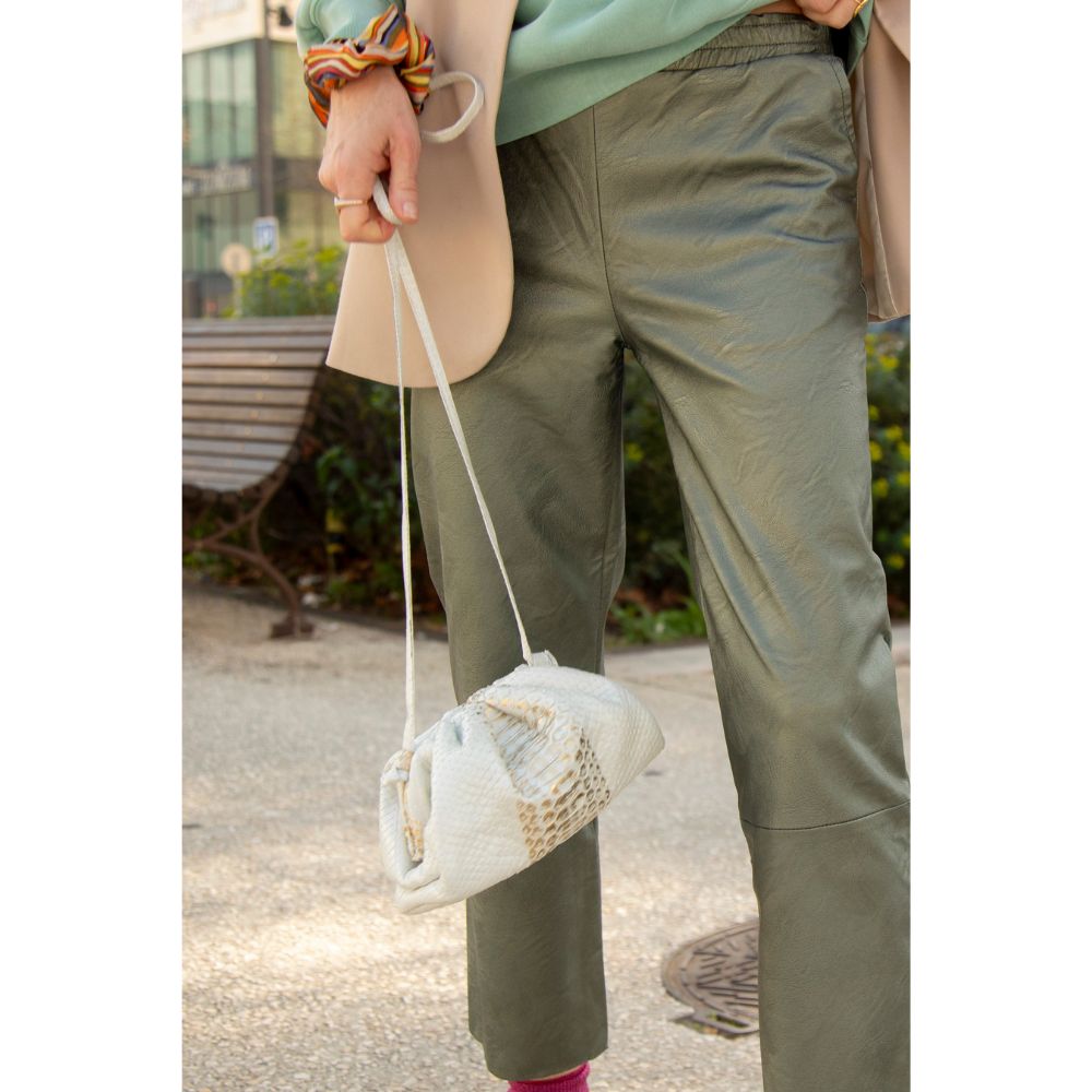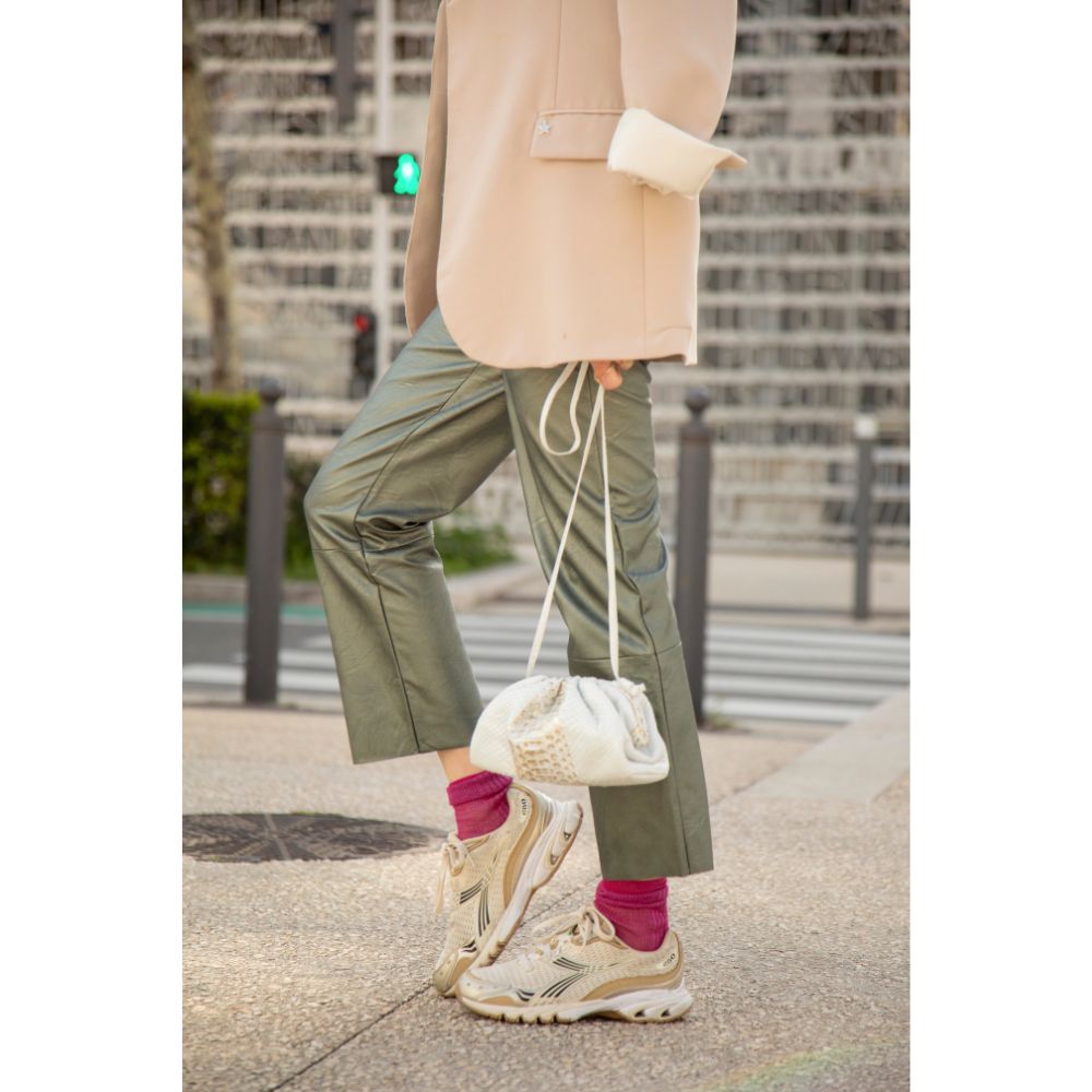 Notre look de la semaine est accessoirisé, cette fois-ci, par un Sac Baby Uniq White & Gold de la marque Sista Paris. Il vient rappeler les tons clairs de du blazer beige et donne une touche de doré qui se marie totalement avec les basket Diadora ! Le python rajoute de la classe et de la féminité à votre tenue…