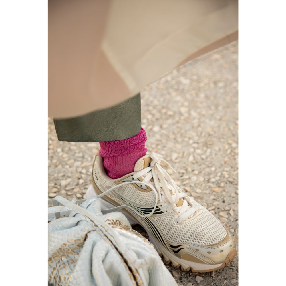 Pour aller complètement avec le Sweat-shirt Newtone, Élodie porte les Chaussettes Camilla Rosa Geranio, de la marque Alto Milano. On adore les touches subtiles de paillettes dans nos looks, à l’arrivée des beaux jours !
