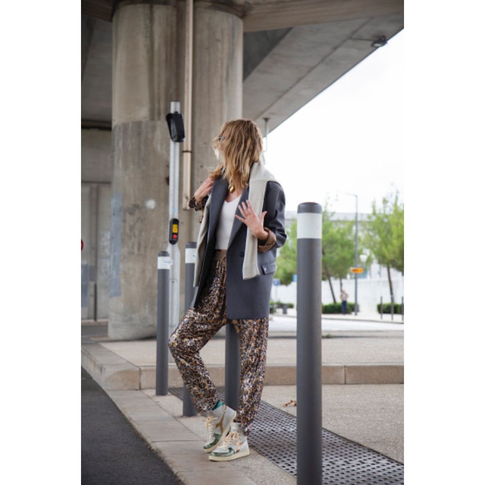 Madone opte pour le mélange de deux tendances, le sequin et le léopard, réunies dans un pantalon fluide. En plus de son confort, c’est sûr vous ne passerez pas inaperçu ! Élodie opte, quant à elle, pour un blazer de la marque Souvenir et le Marcel blanc et jamais sans ses Diadora !