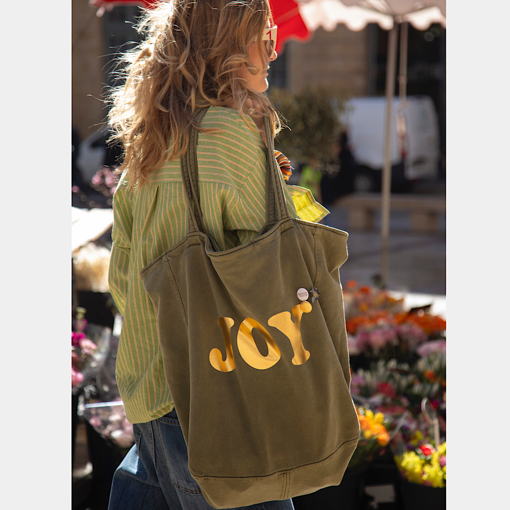 Pour son look casual, Élodie opte pour un sac cabas, de la marque Newtone ! Orné du Joy qu’on aime tant, floqué doré, vous serez stylé jusqu’au sac … en plus d’être pratique évidemment !