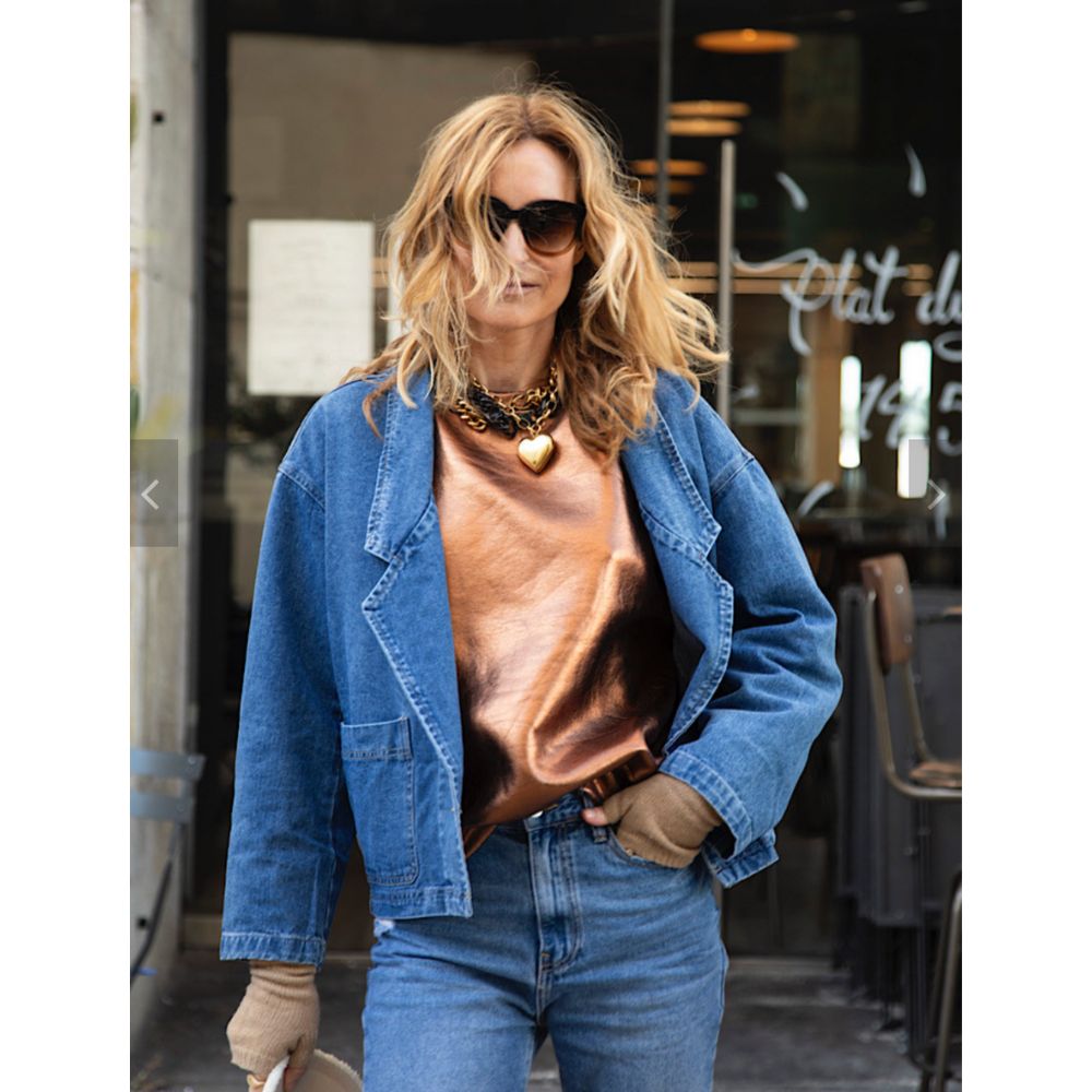 La Veste Denim Max, de la marque Madone, une interprétation moderne du classique blazer en jean, avec sa coupe large cette pièce offre un style audacieux et tendance. La veste est le choix parfait pour celles qui aiment l’oversize.