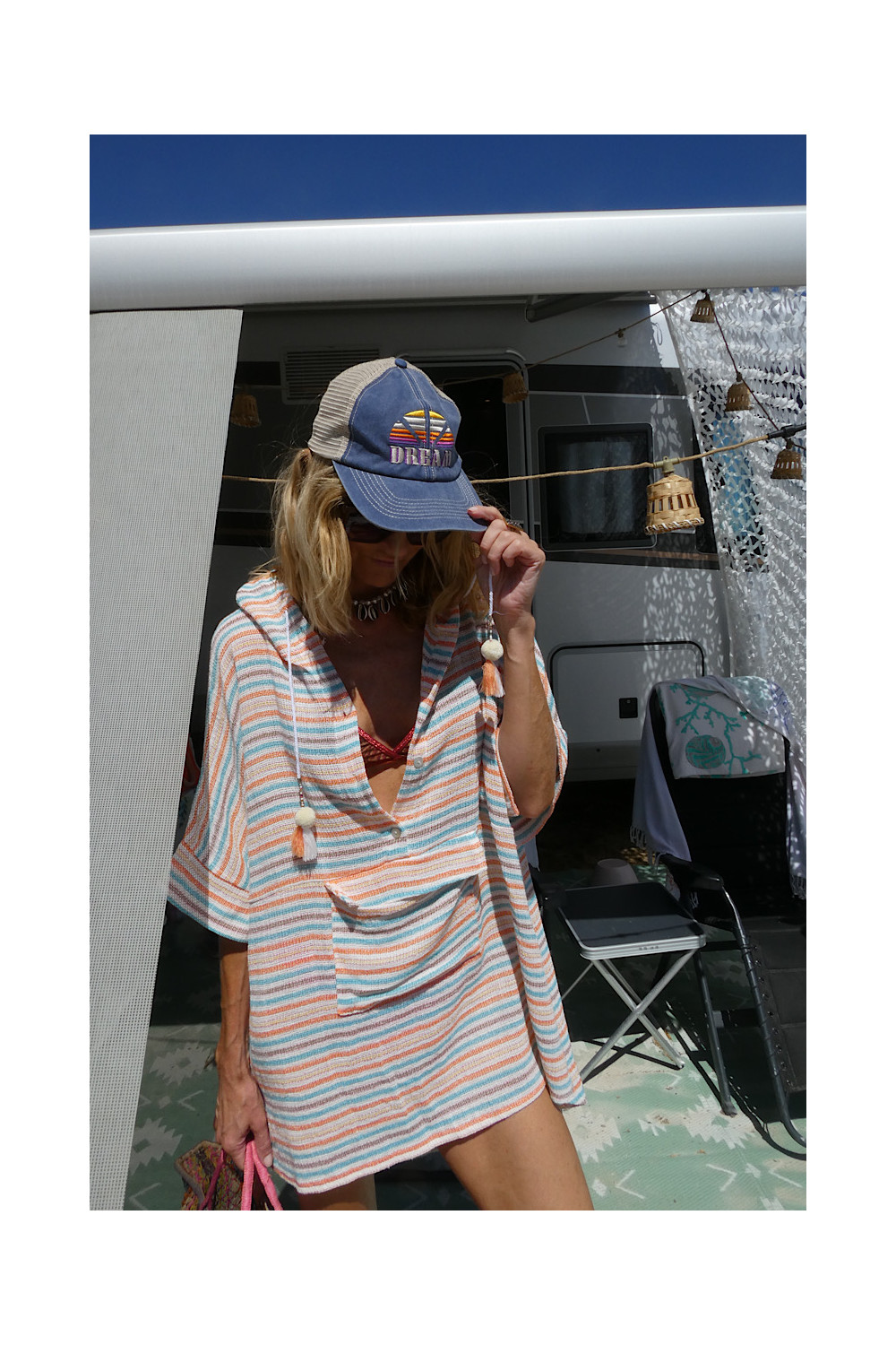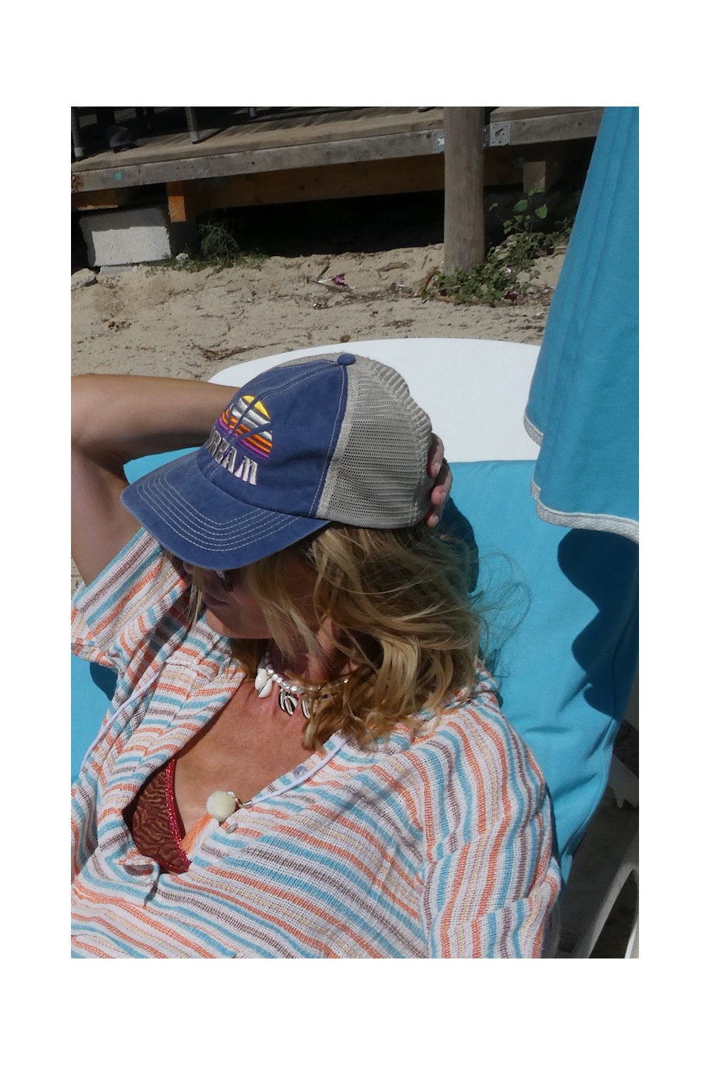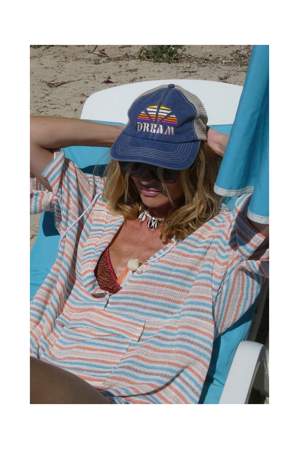Caractéristiques : casquette, écriture "DREAM" rose pastel/blanc, effet rayon de soleil de couleurs, casquette bleu, effet filet blanc à l'arrière, fabriquée en France par Madone