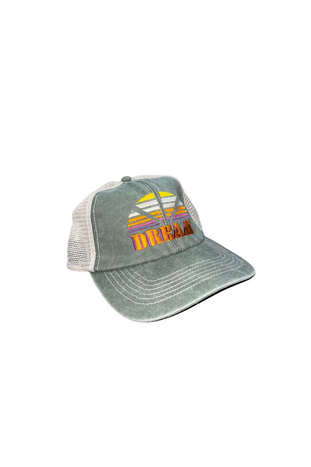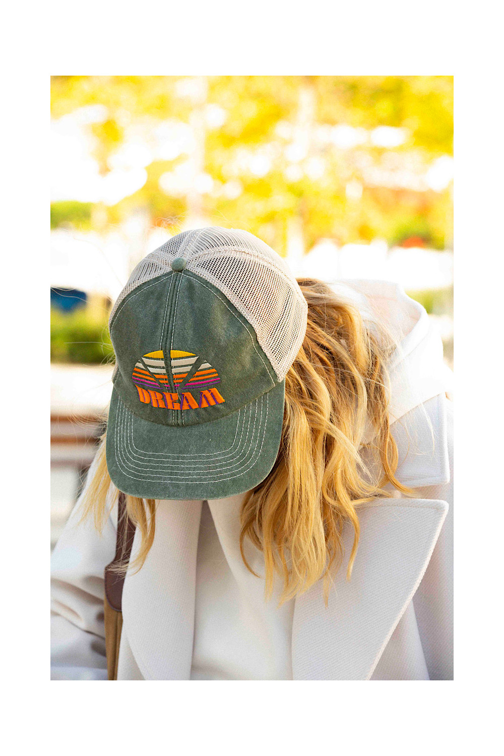 Caractéristiques : casquette, écriture "DREAM" orange, effet rayon de soleil de couleurs, casquette kaki, effet filet blanc à l'arrière, fabriquée en France par Madone