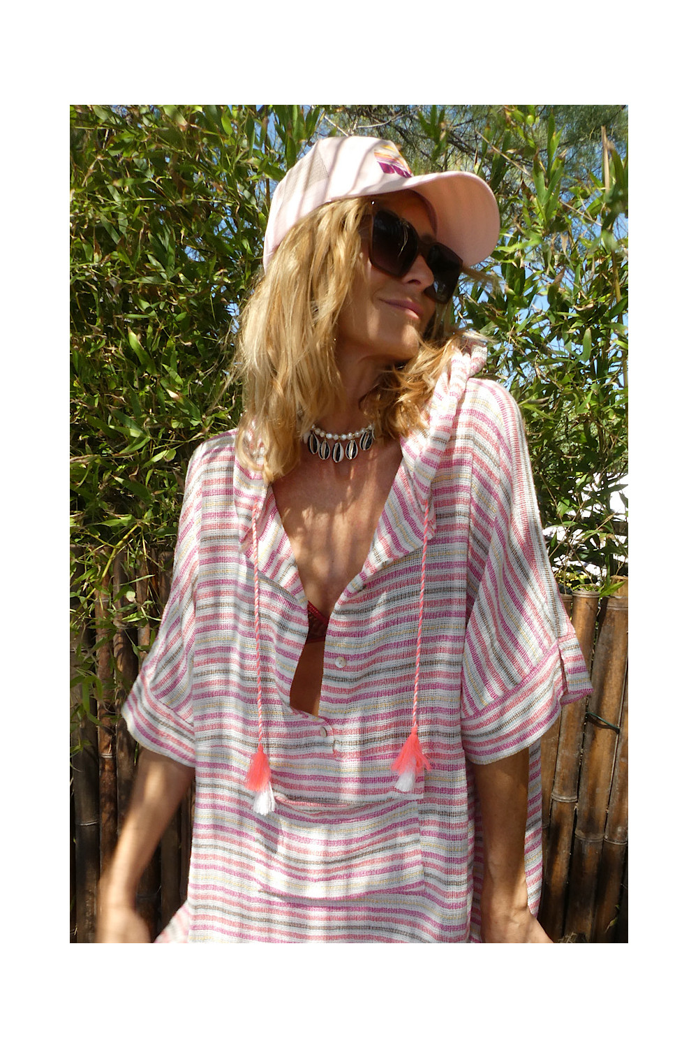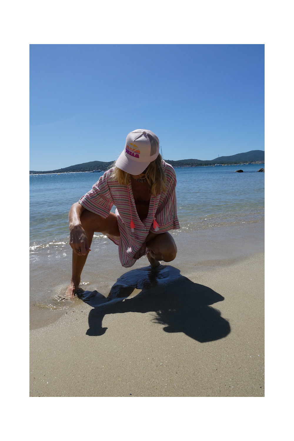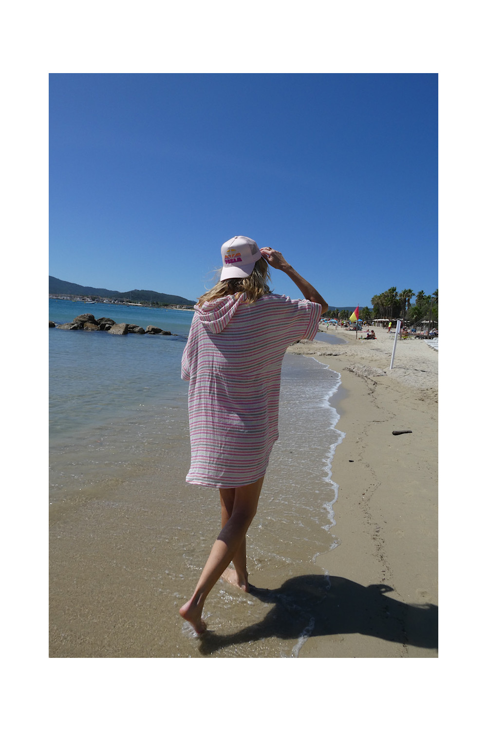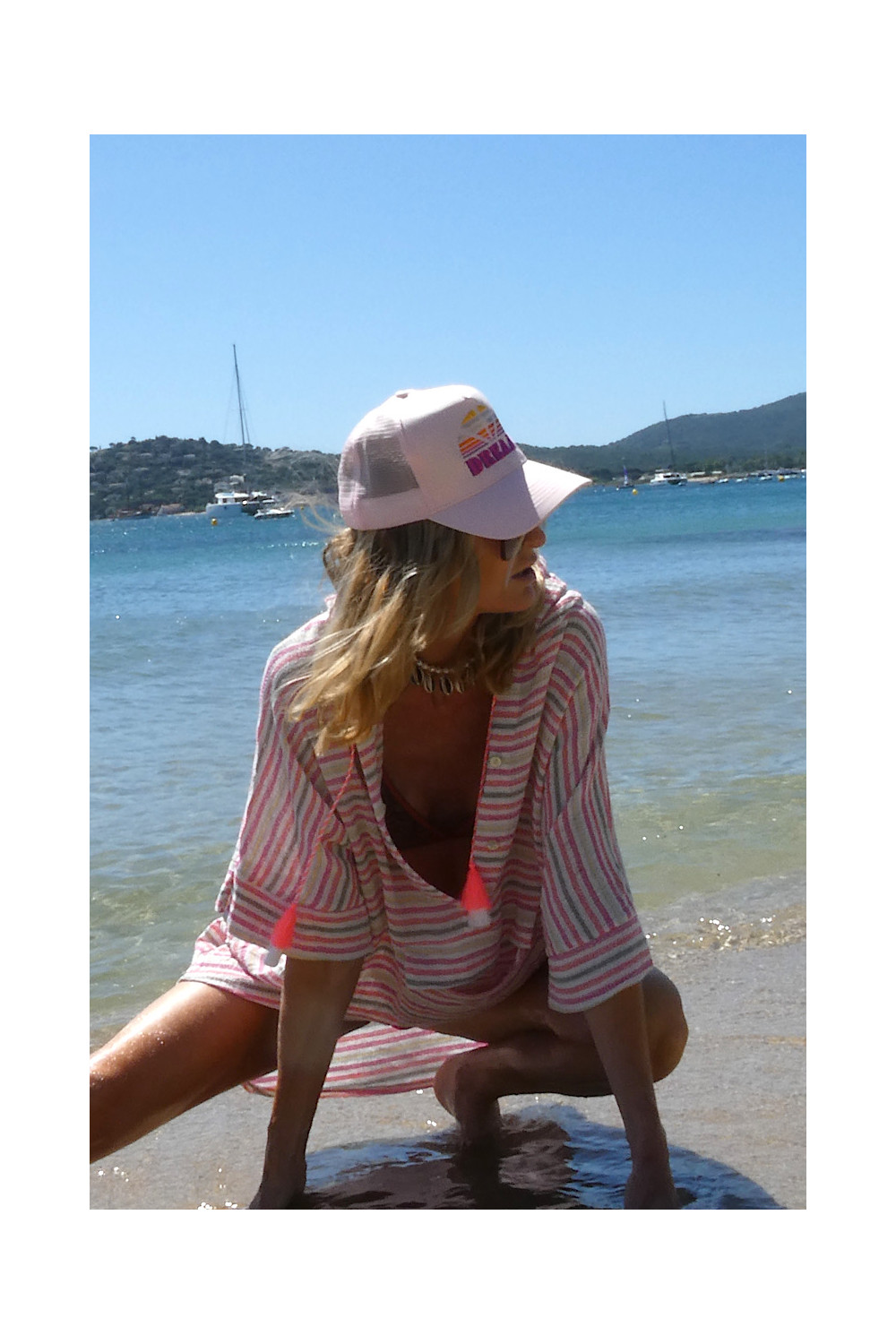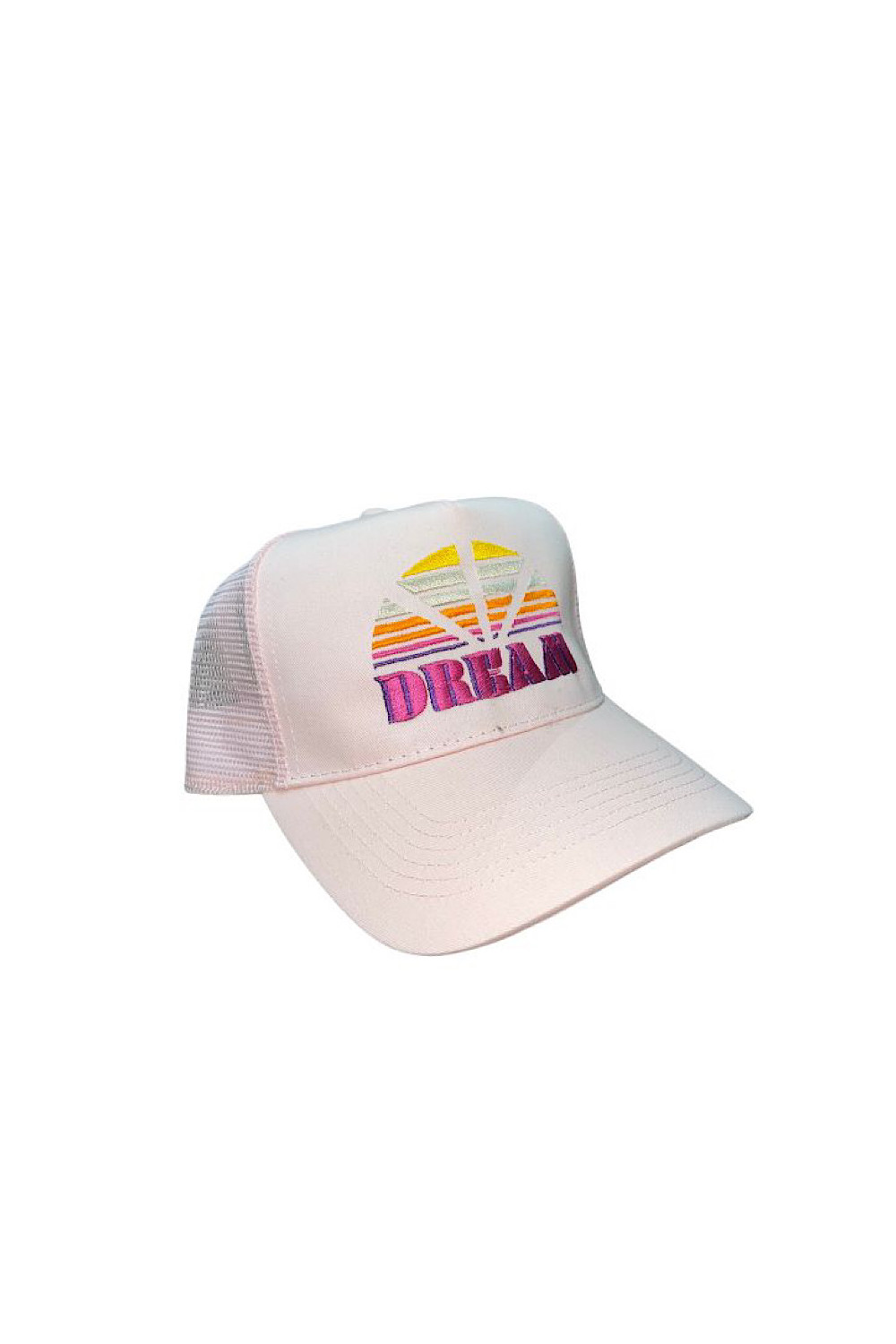 Caractéristiques : casquette, écriture "DREAM" fuschia, effet rayon de soleil de couleurs, casquette rose pastel, effet filet à l'arrière, fabriquée en France par Madone