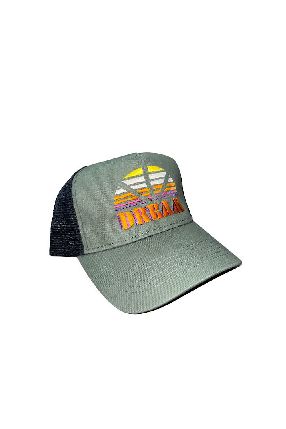 Caractéristiques : casquette, écriture "DREAM" orange, effet rayon de soleil de couleurs, casquette kaki, effet filet noir à l'arrière, fabriquée en France par Madone
