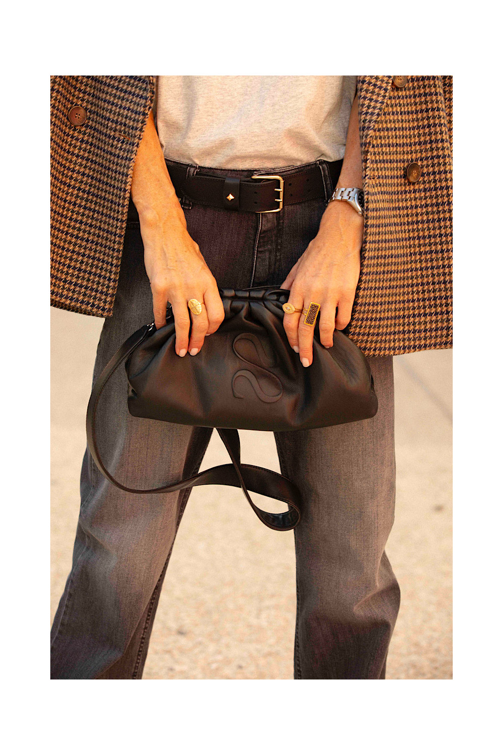 Caractéristiques : Cuir de vachette noir, Bijouterie dorée