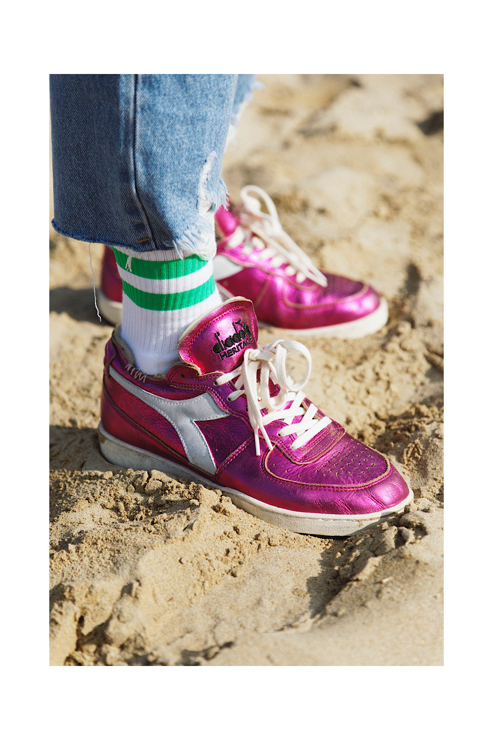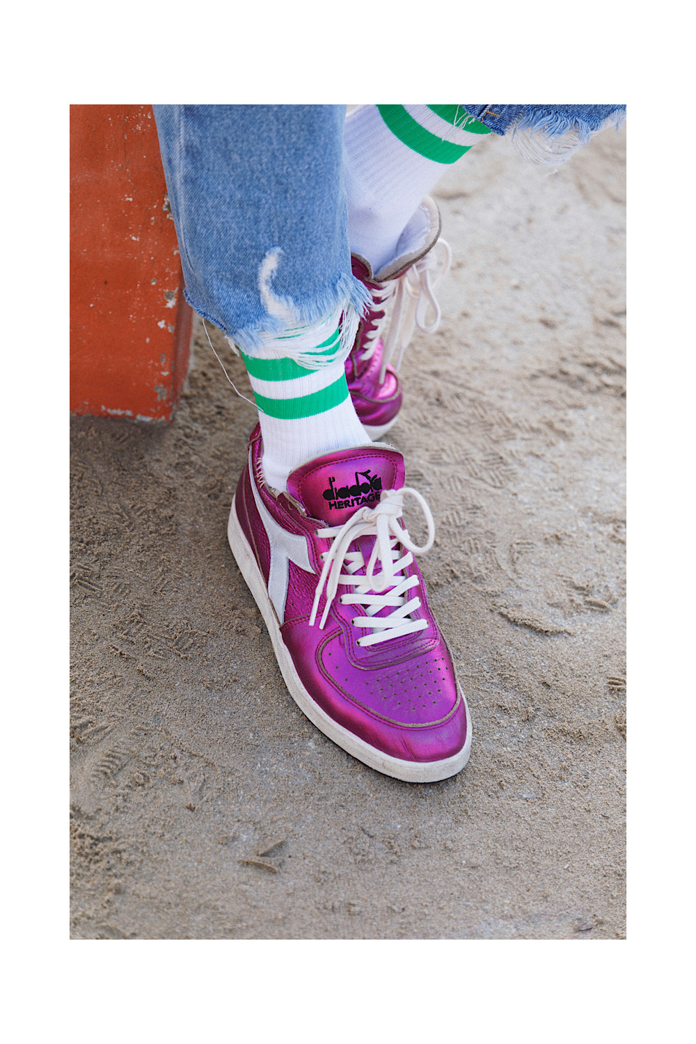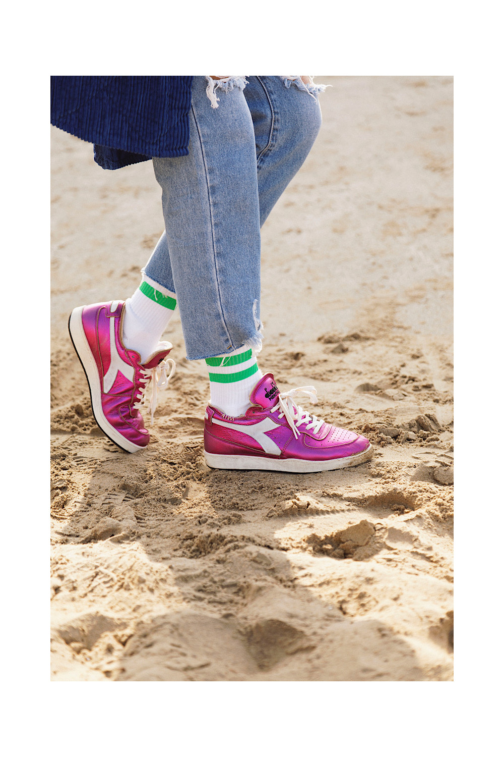 Caractéristique : chaussette haute avec bandes vertes et talons à paillettes, fine
