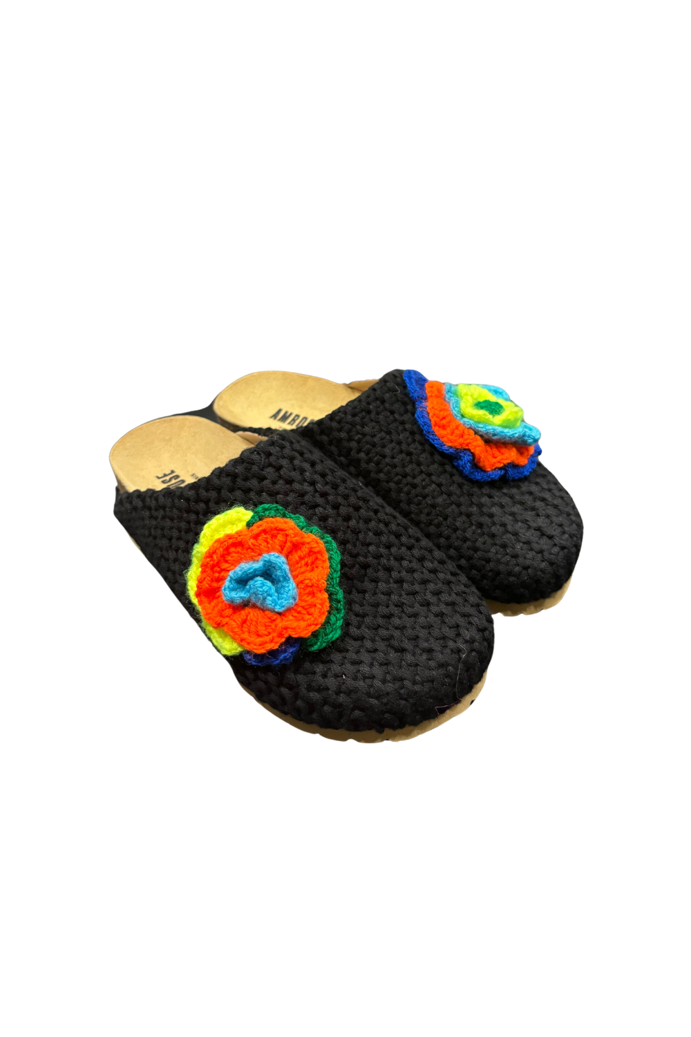 Composition : crochet en laine, tige en coton, semelle intérieure en liège et cuir