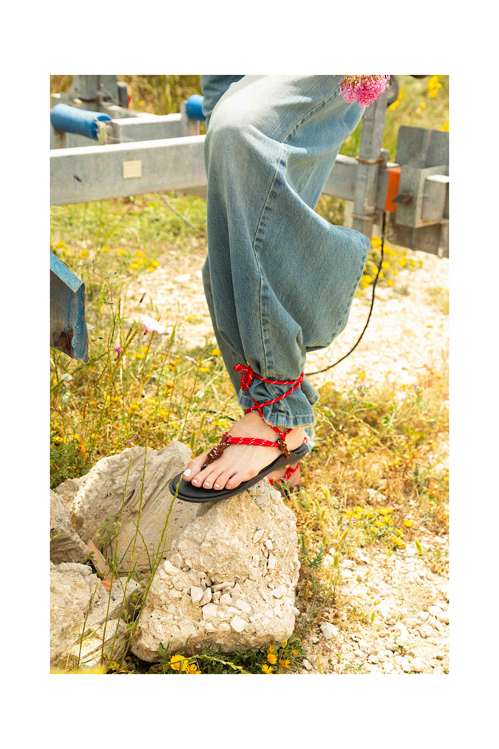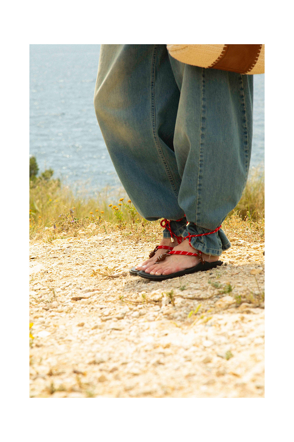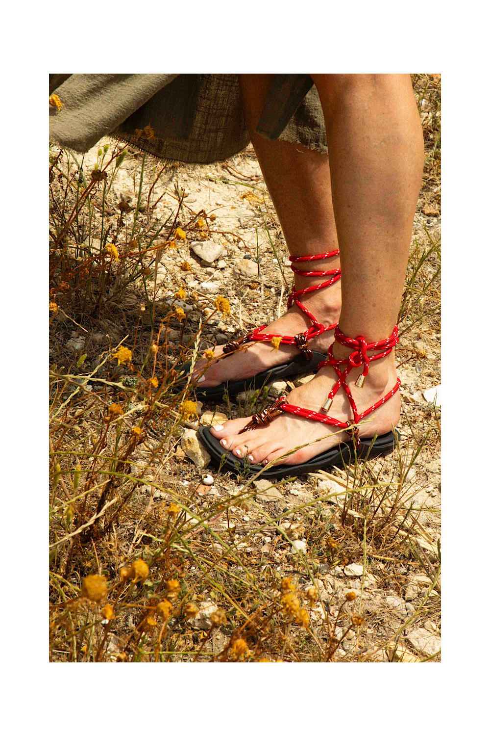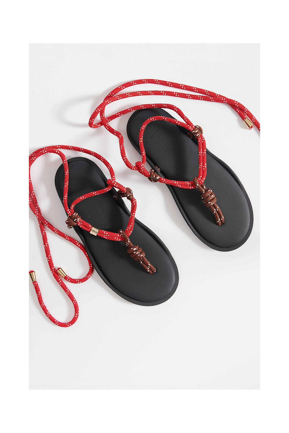 Caractéristiques : sandales à cordes, rouge et marron, semelle noir