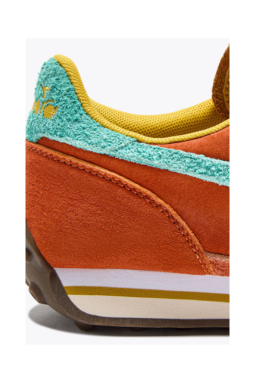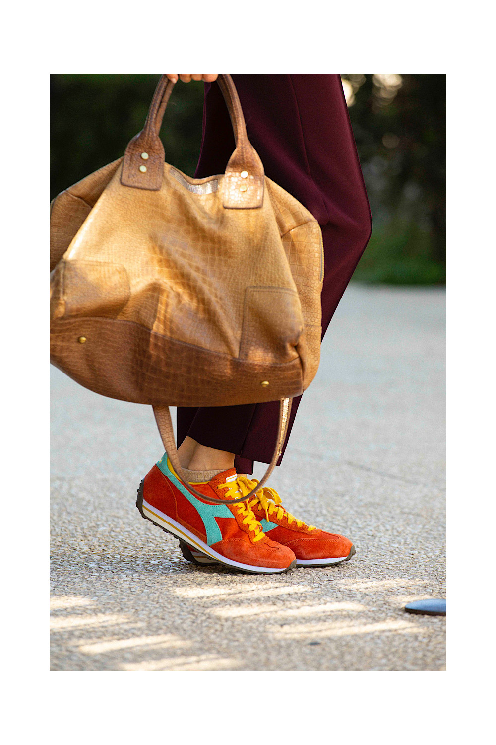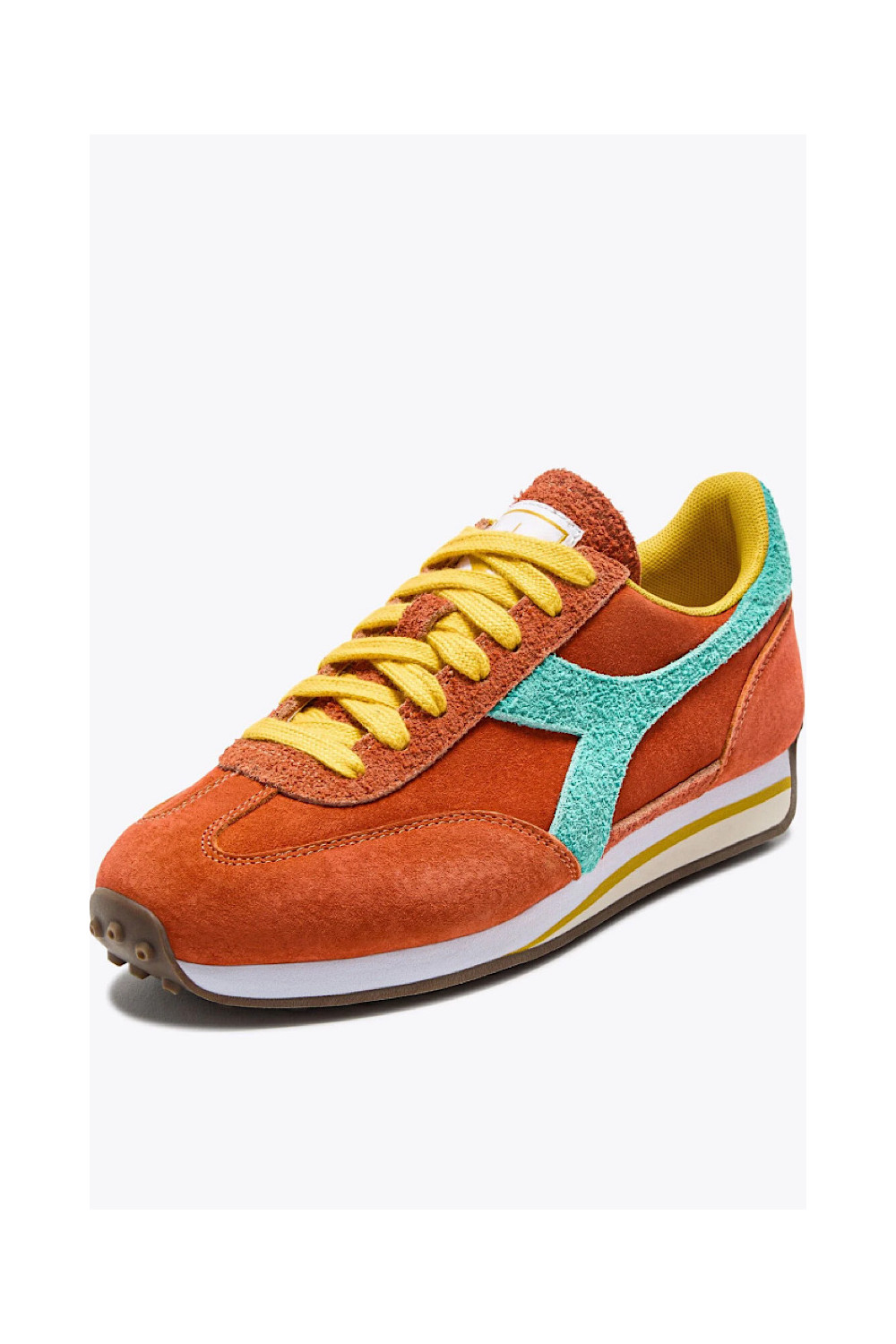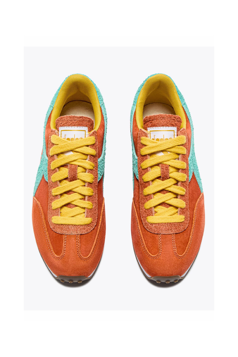Caractéristiques : baskets orange, lacets jaune, détails bleu lagon