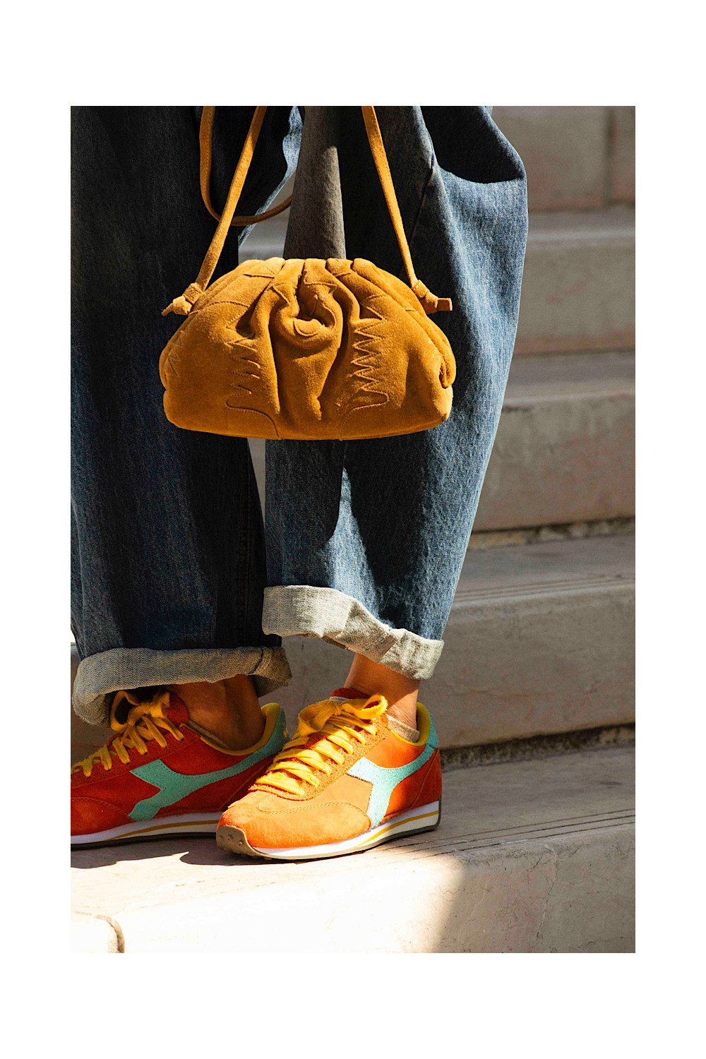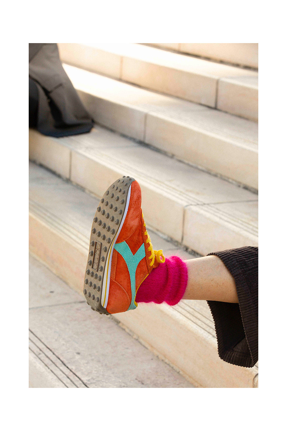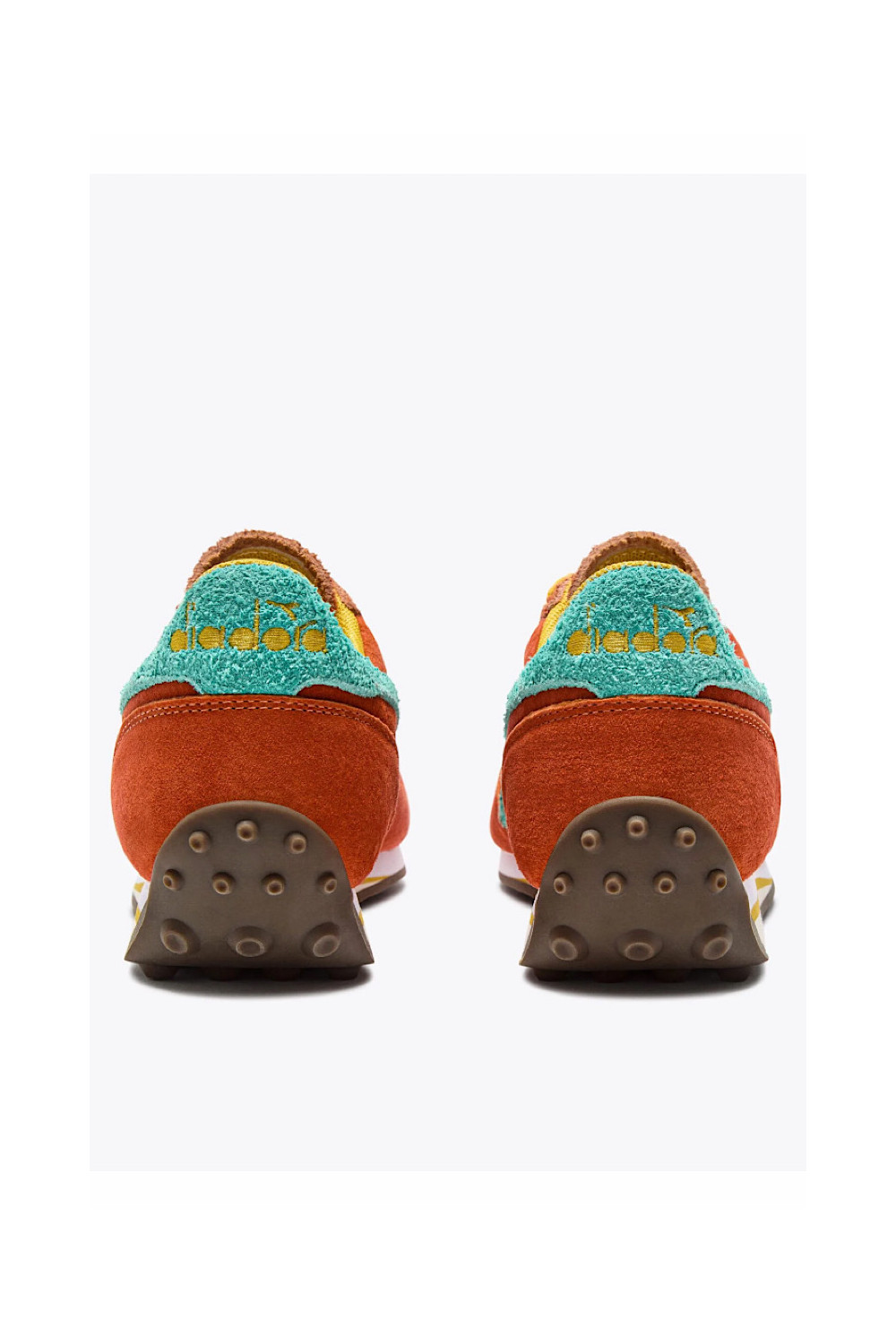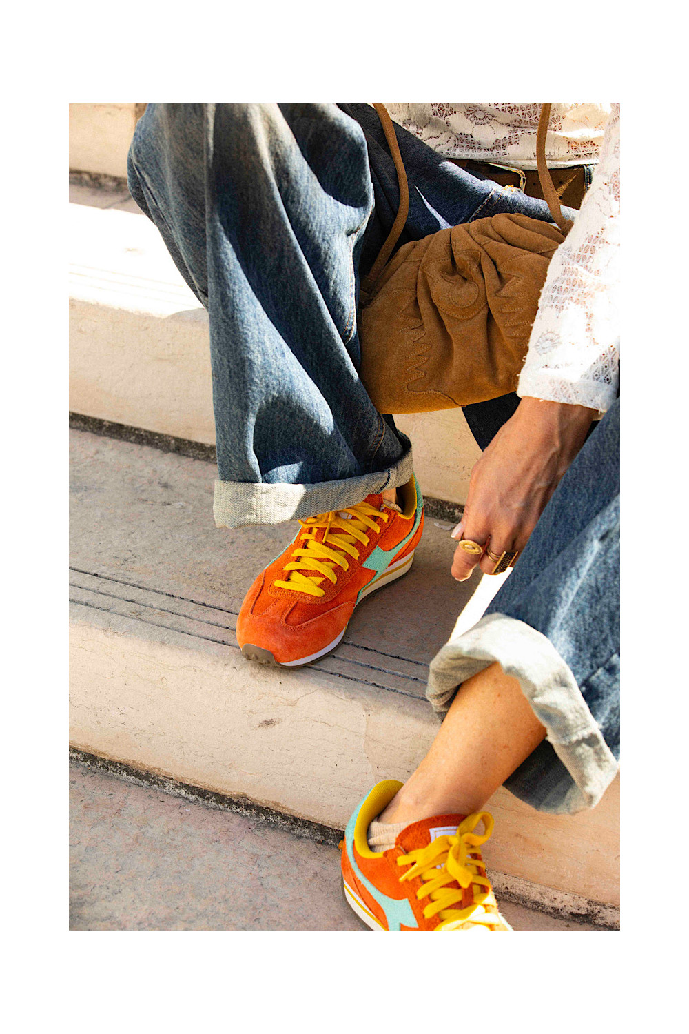 Caractéristiques : baskets orange, lacets jaune, détails bleu lagon