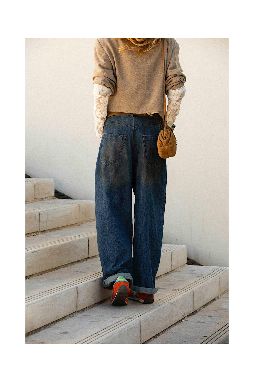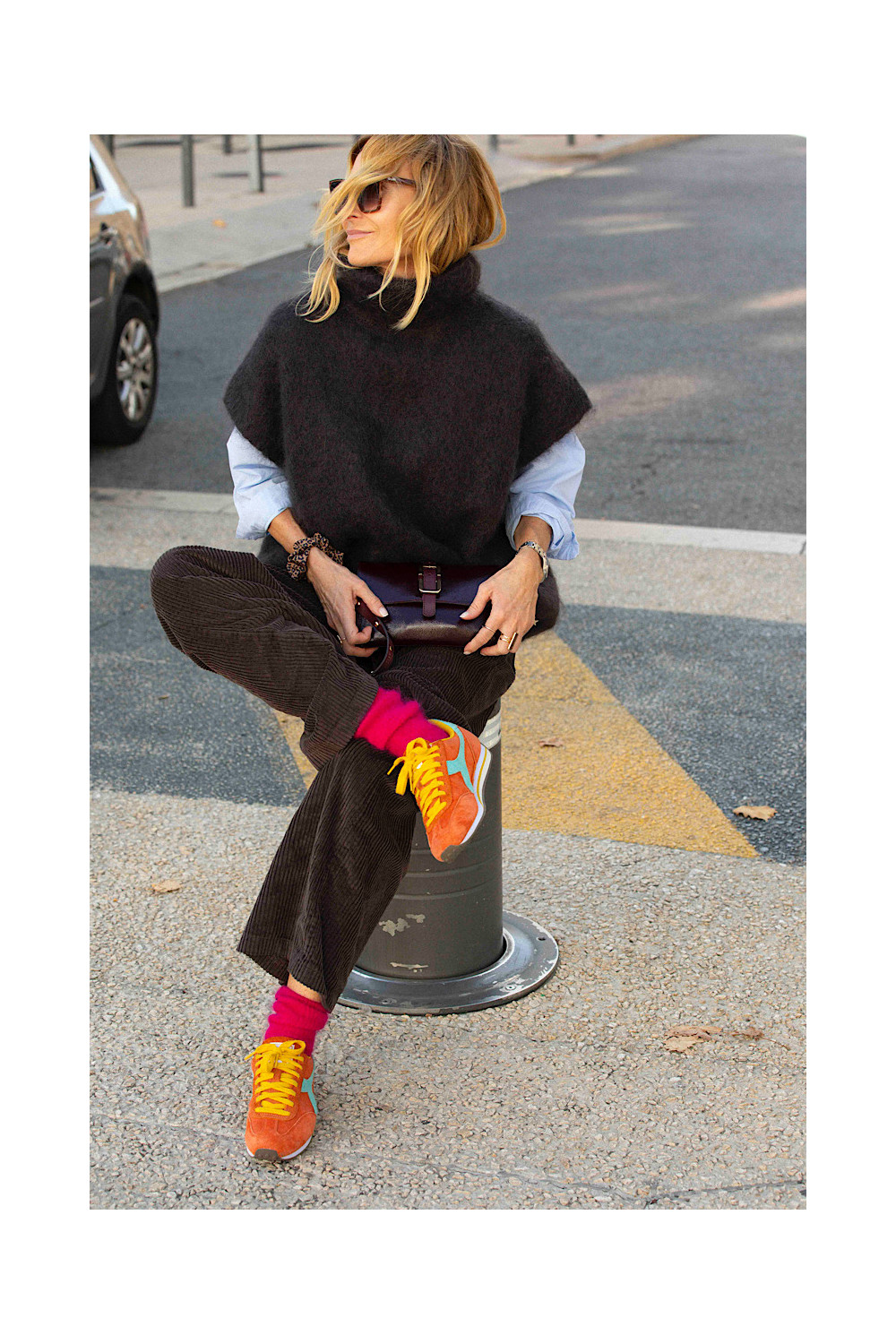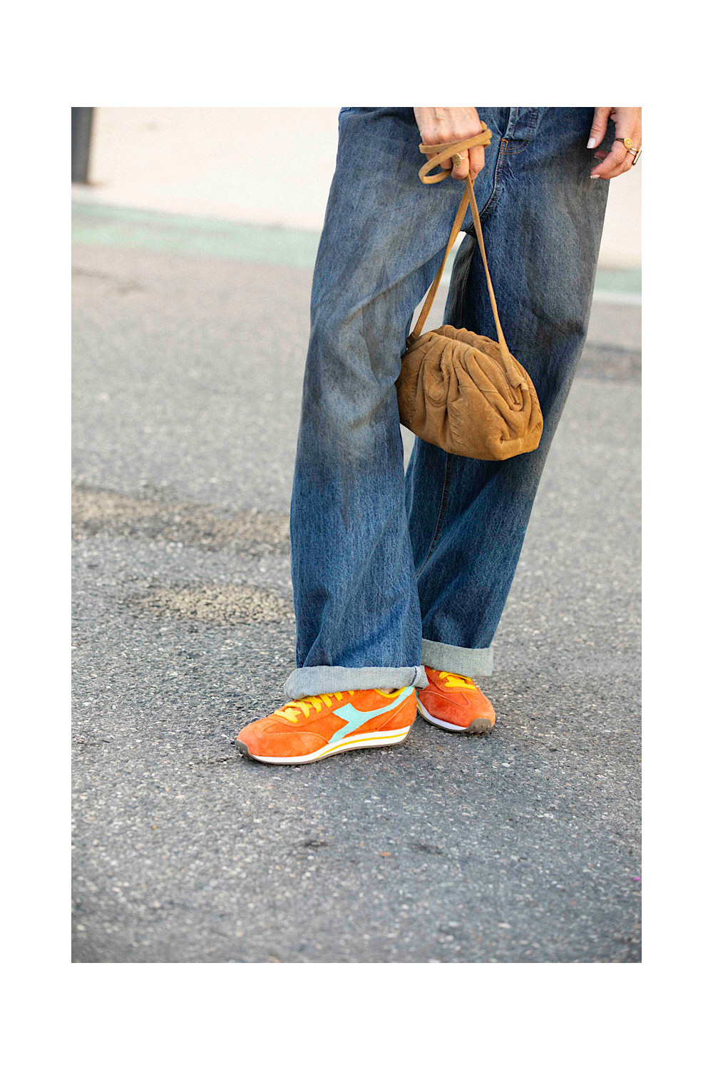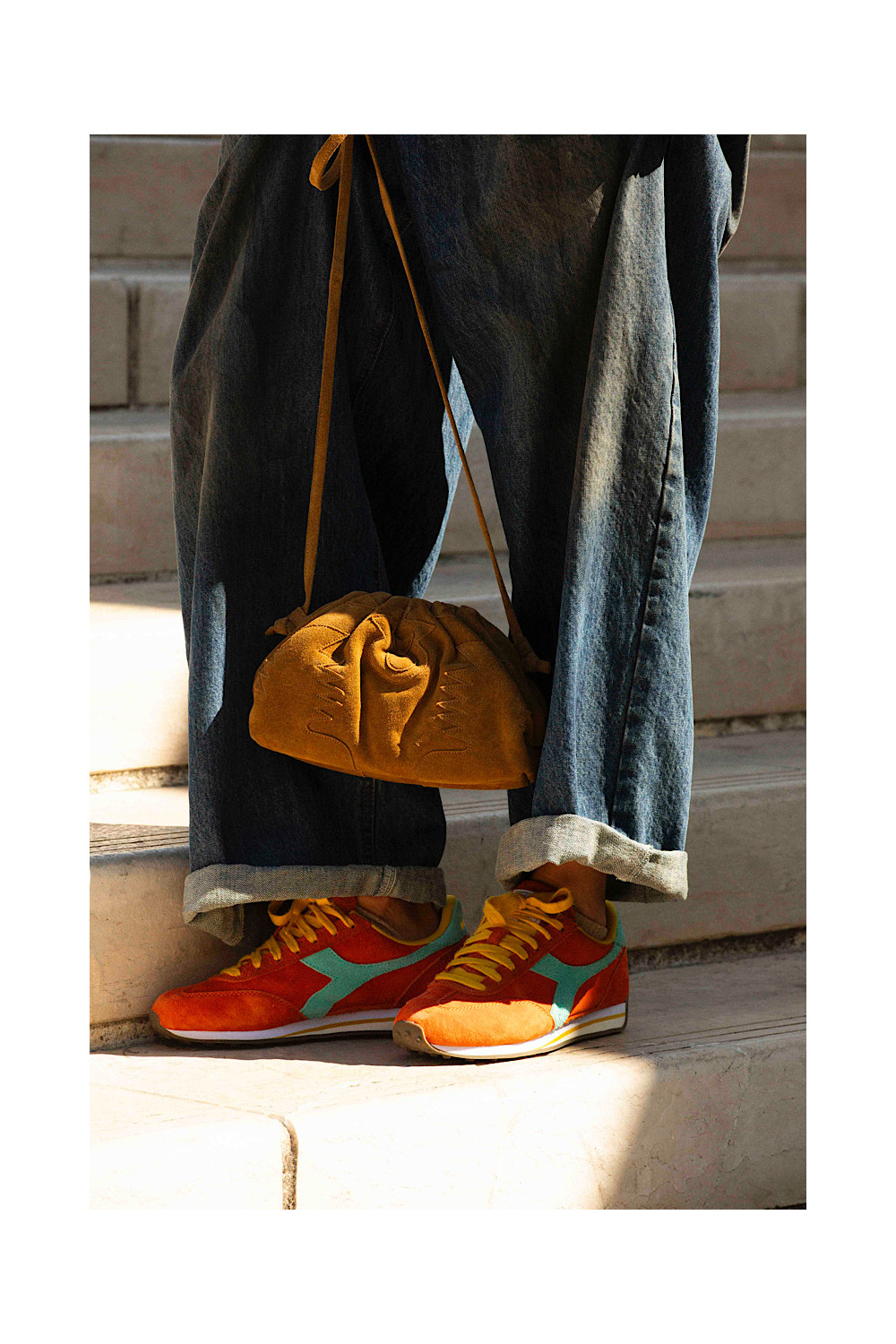 Caractéristiques : baskets orange, lacets jaune, détails bleu lagon