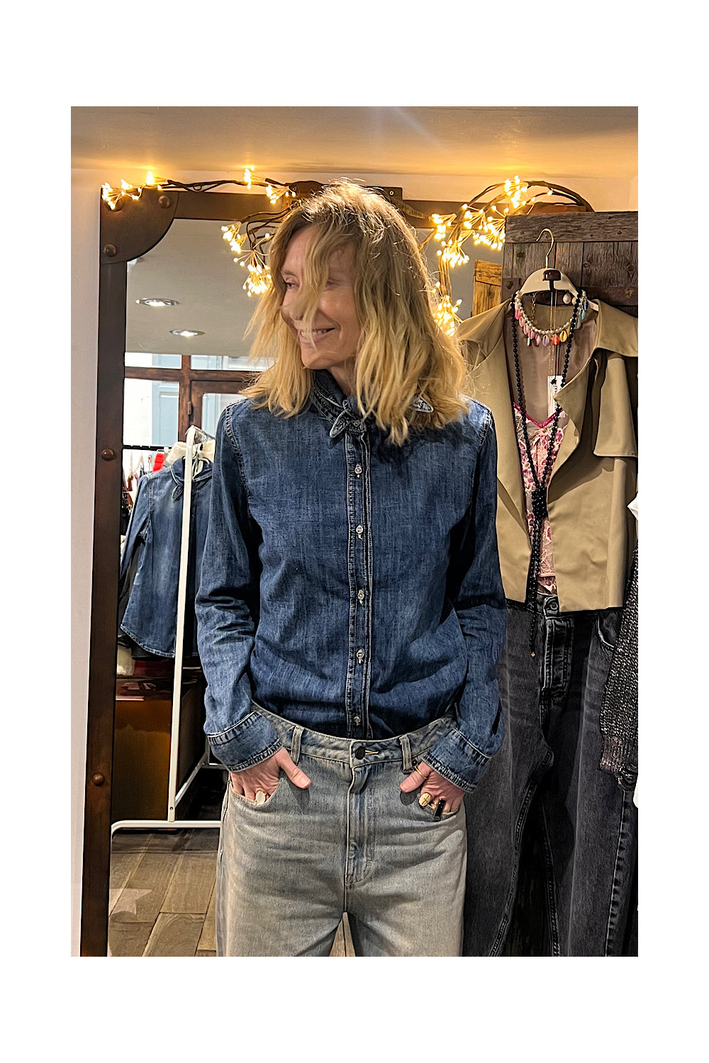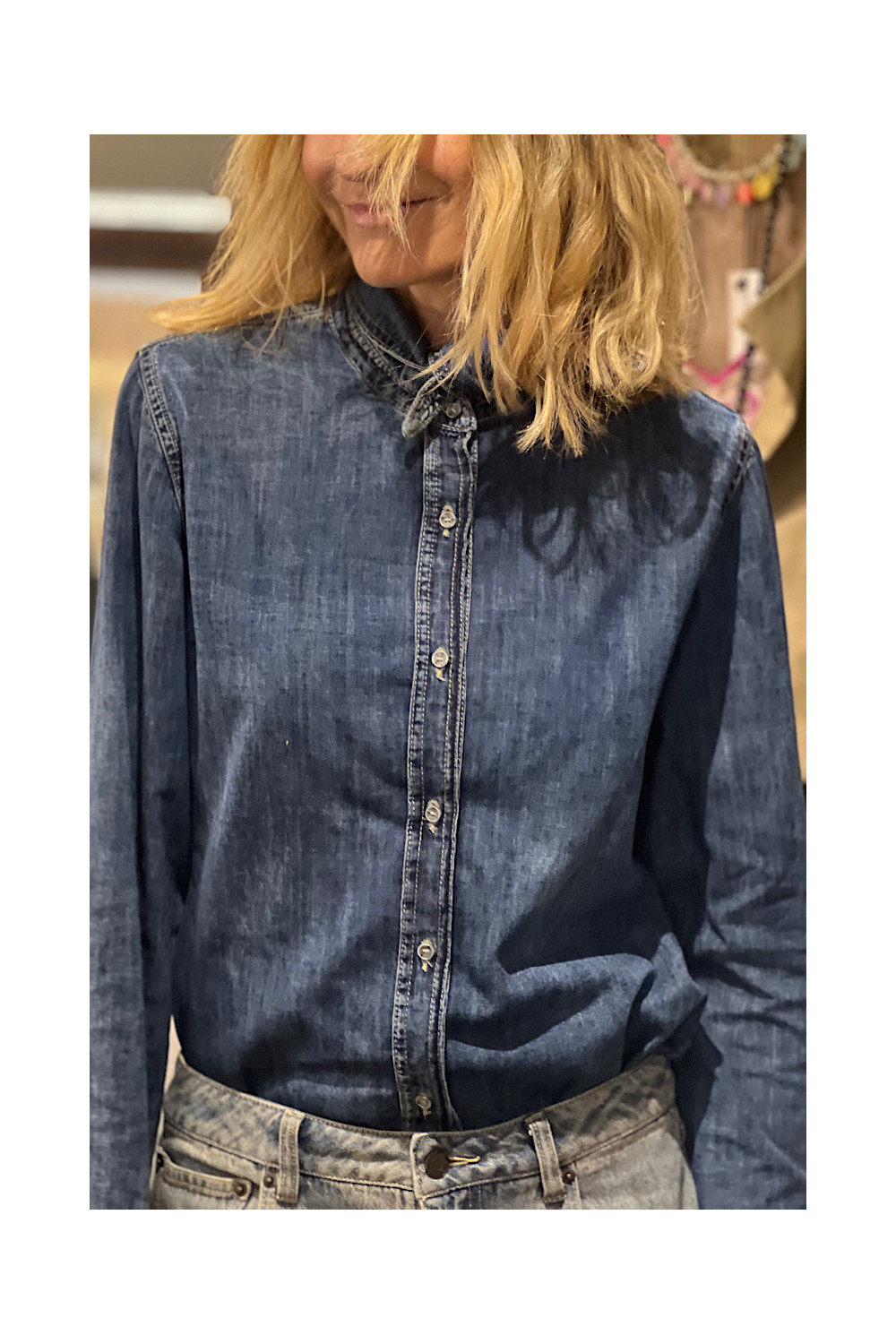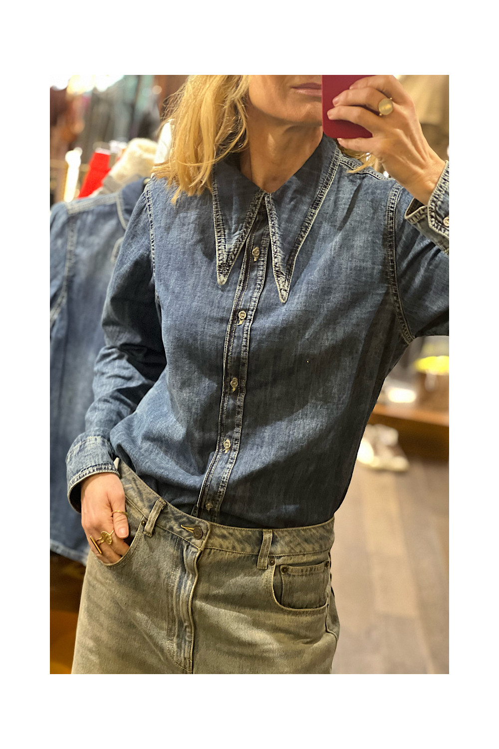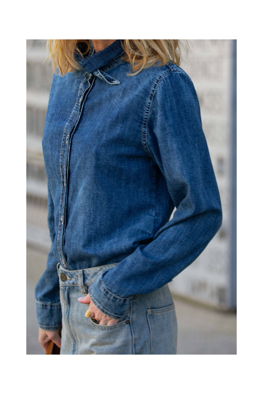 Caractéristiques : chemise en jean, col chemise original, possibilité de nouer le col, manches longues, 7 boutons, 1 bouton sur chaque manche