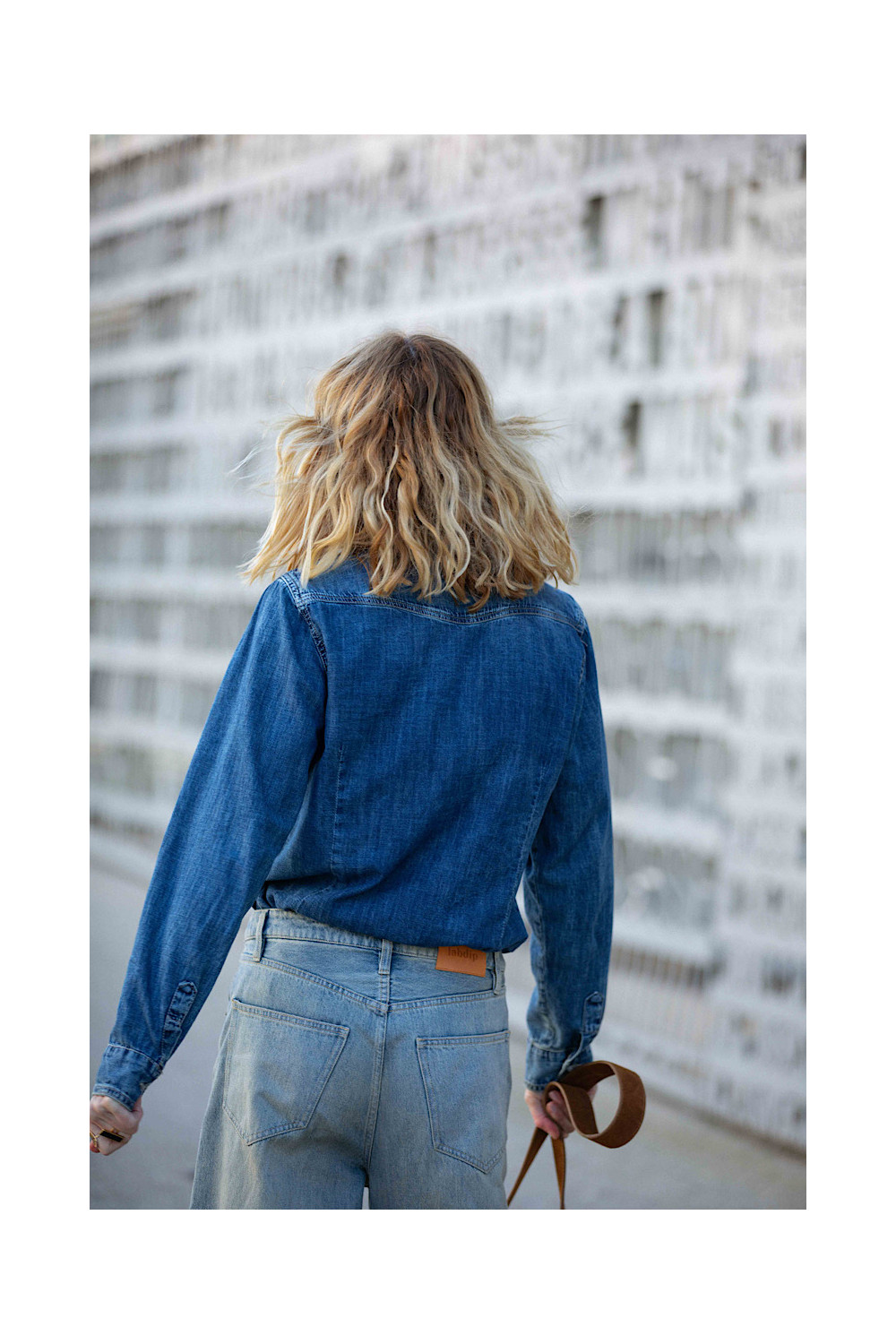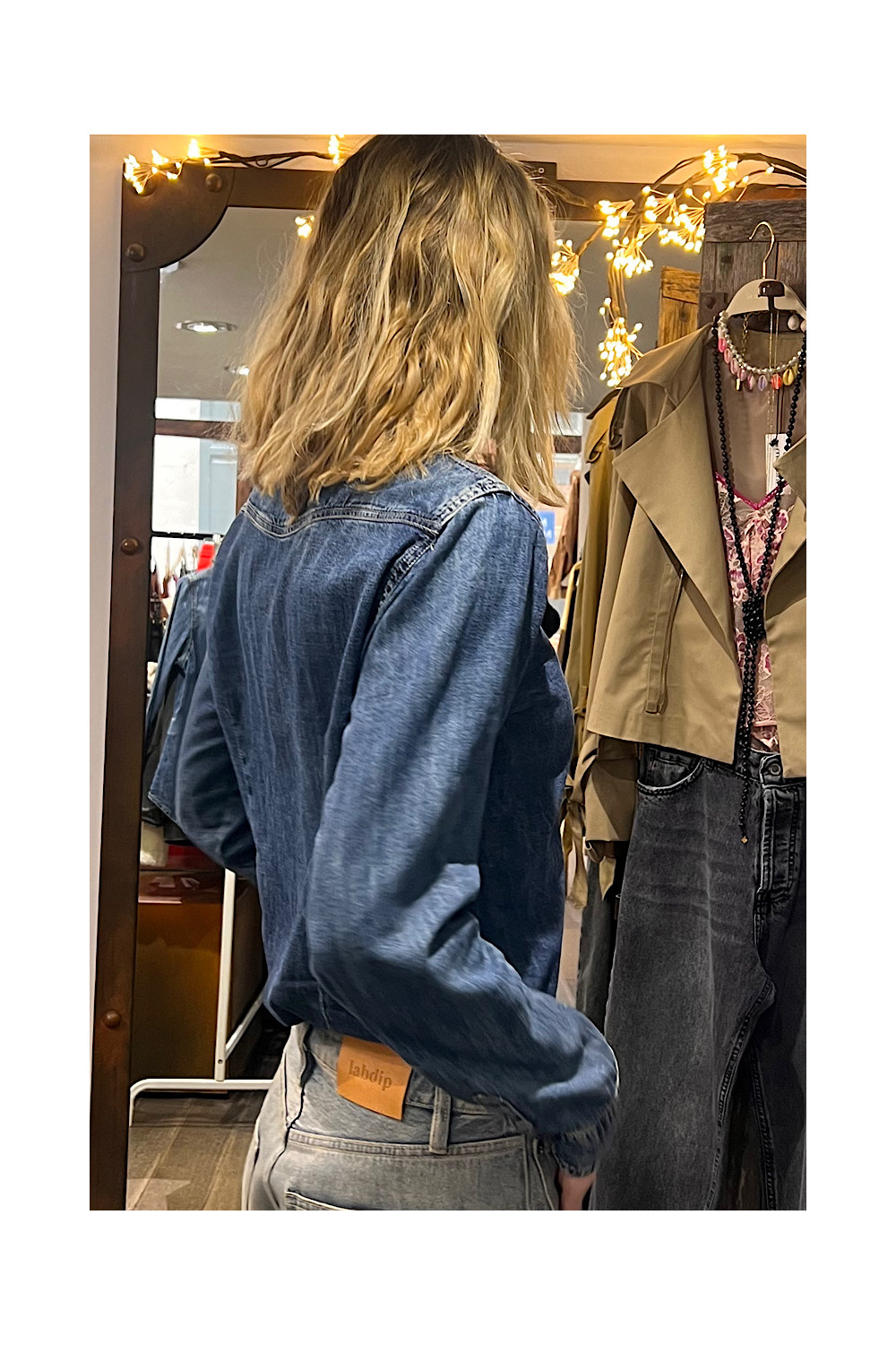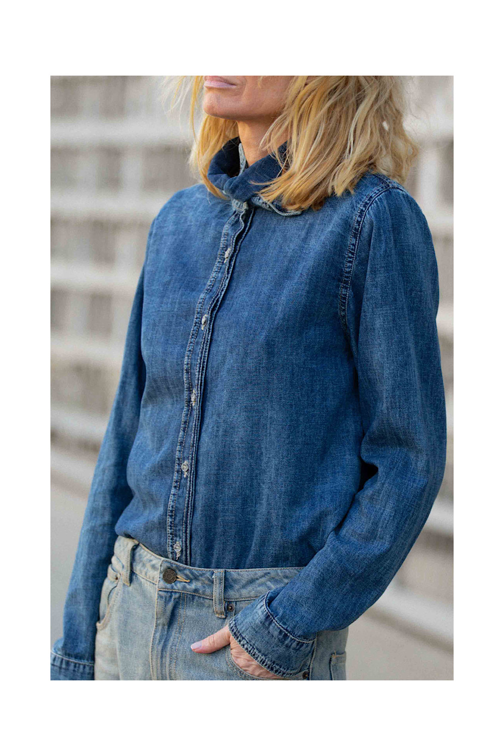 Caractéristiques : chemise en jean, col chemise original, possibilité de nouer le col, manches longues, 7 boutons, 1 bouton sur chaque manche