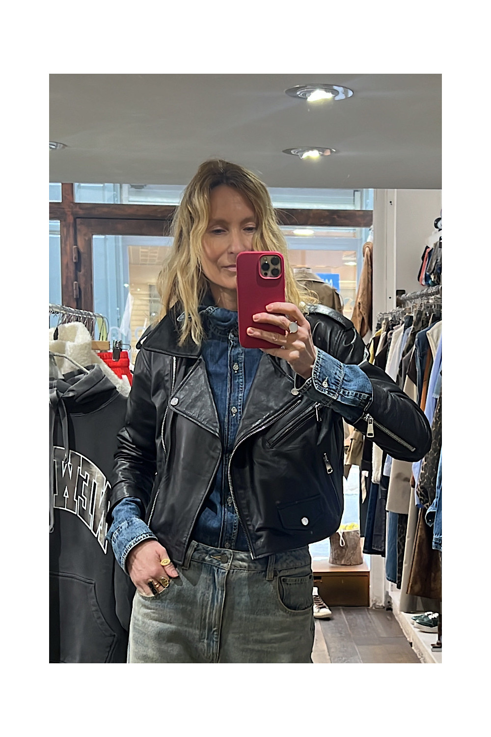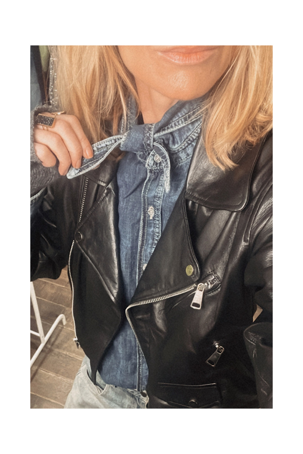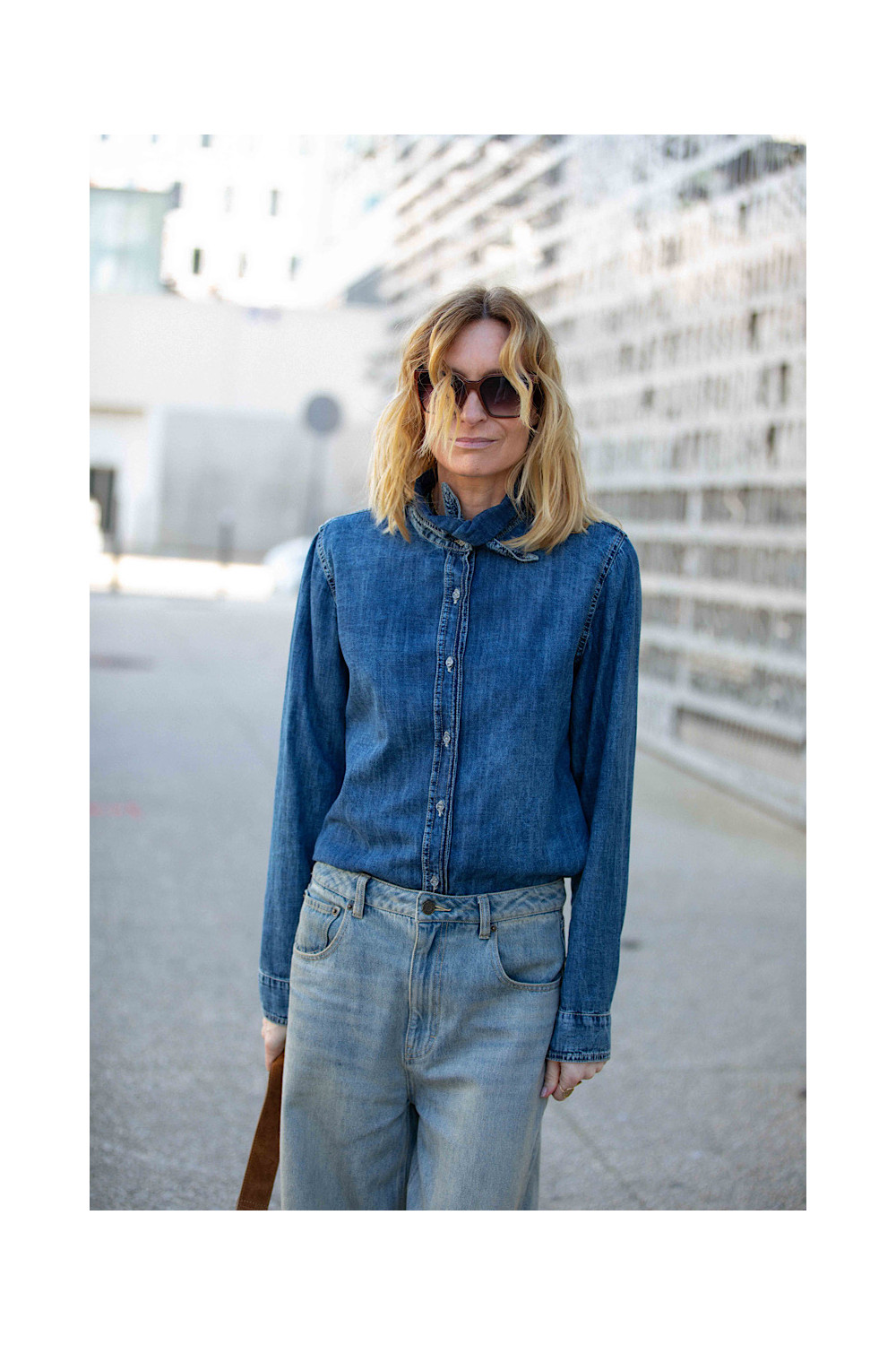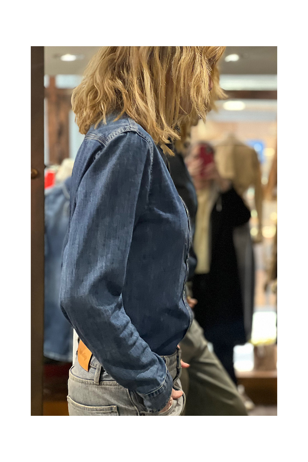 Caractéristiques : chemise en jean, col chemise original, possibilité de nouer le col, manches longues, 7 boutons, 1 bouton sur chaque manche