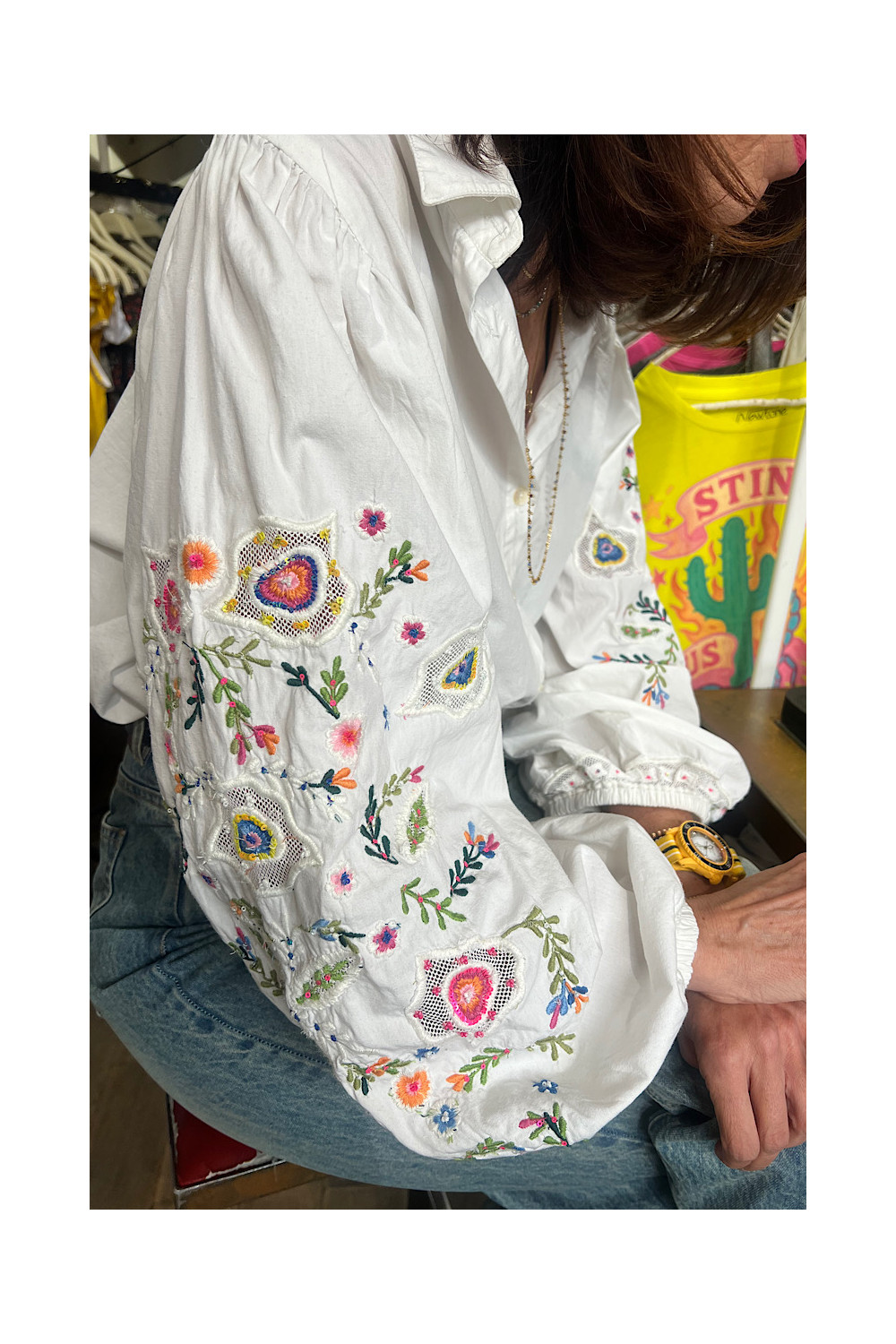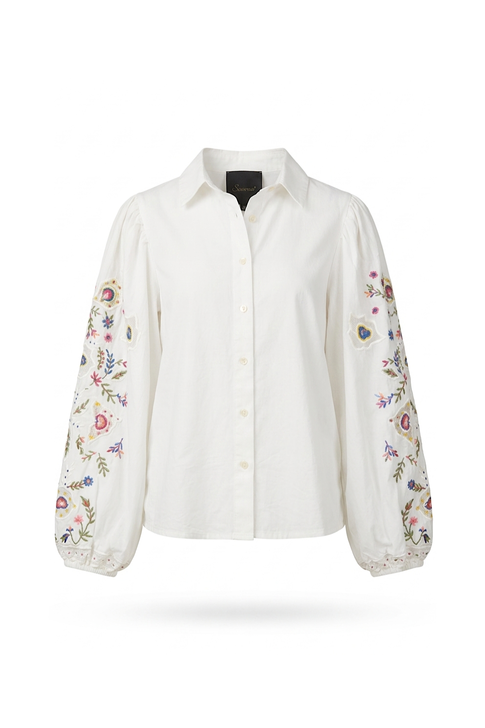 Des manches ballons ornées des détails brodés uniques.
