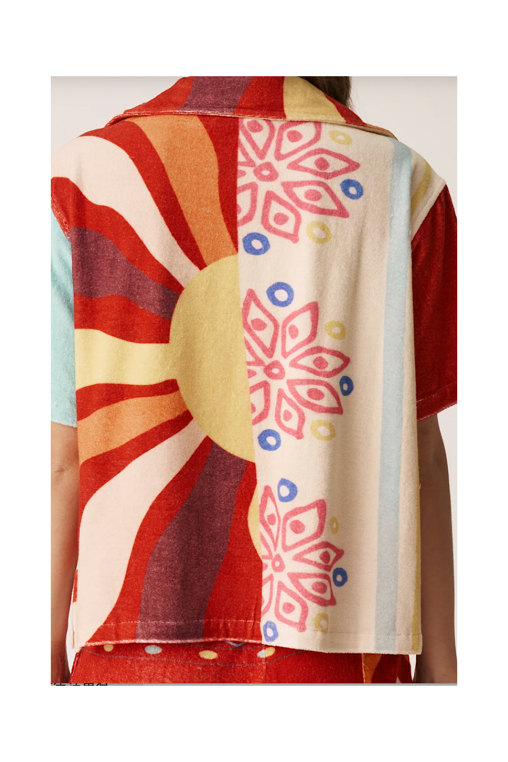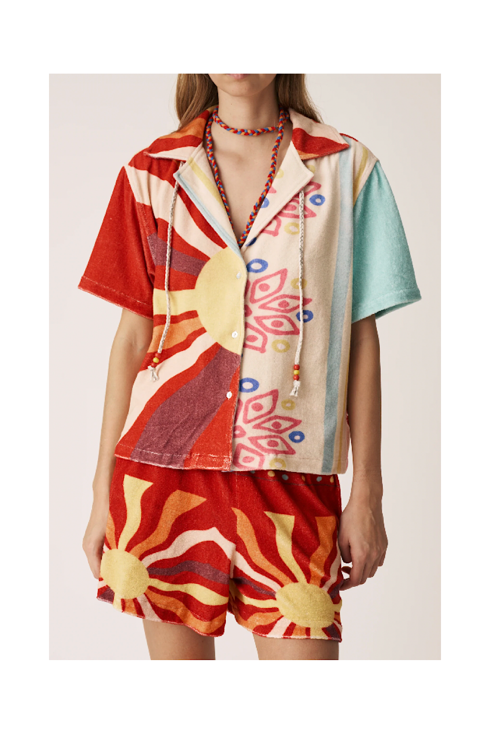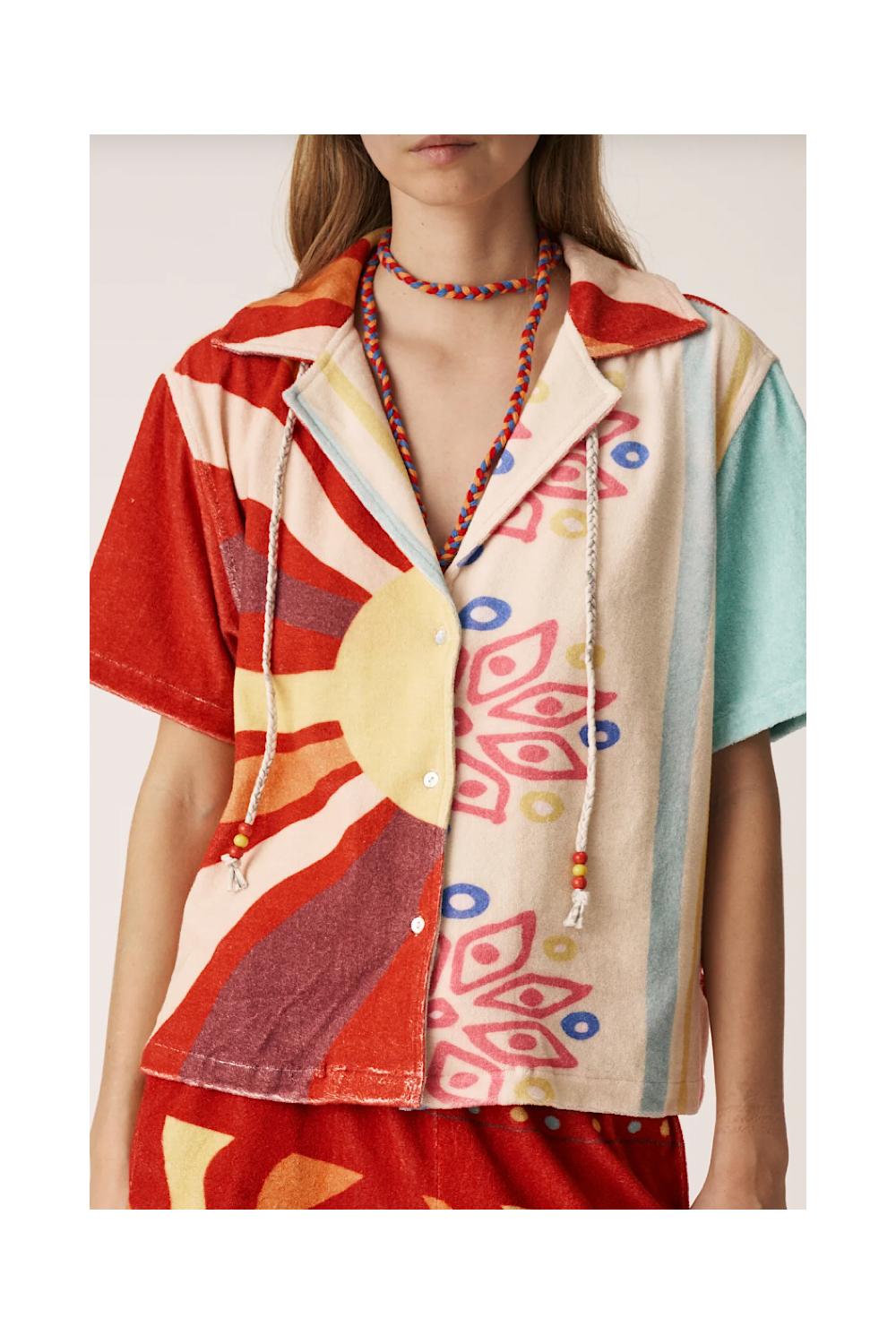 Coupe droite, fluide et decontractée avec une touche "retro" avec boutons devant. Couleurs orange et jaune avec details cordon tressé niveau col.
