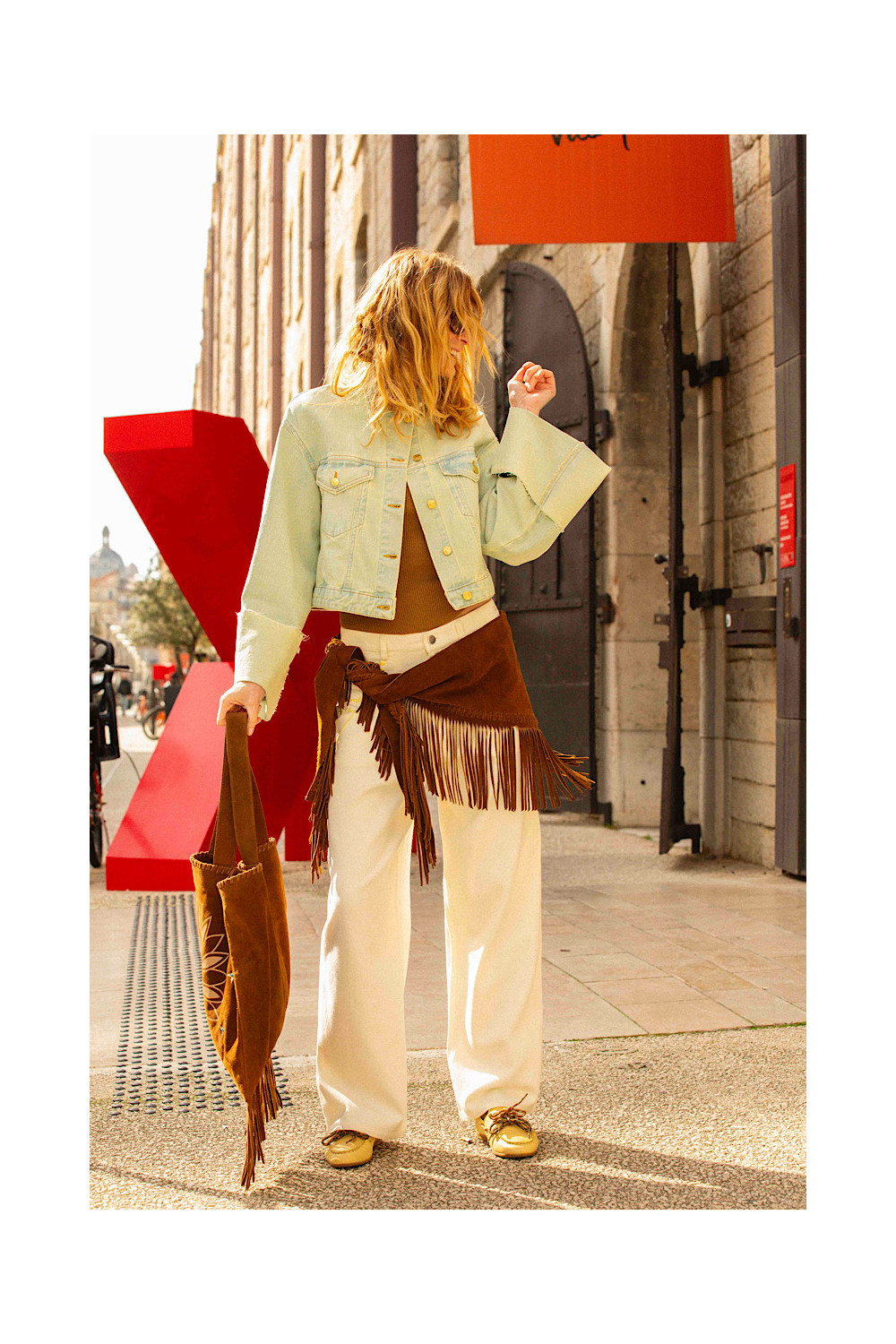 Caractéristiques : écharpe à frange, marron, dessin en relief au centre