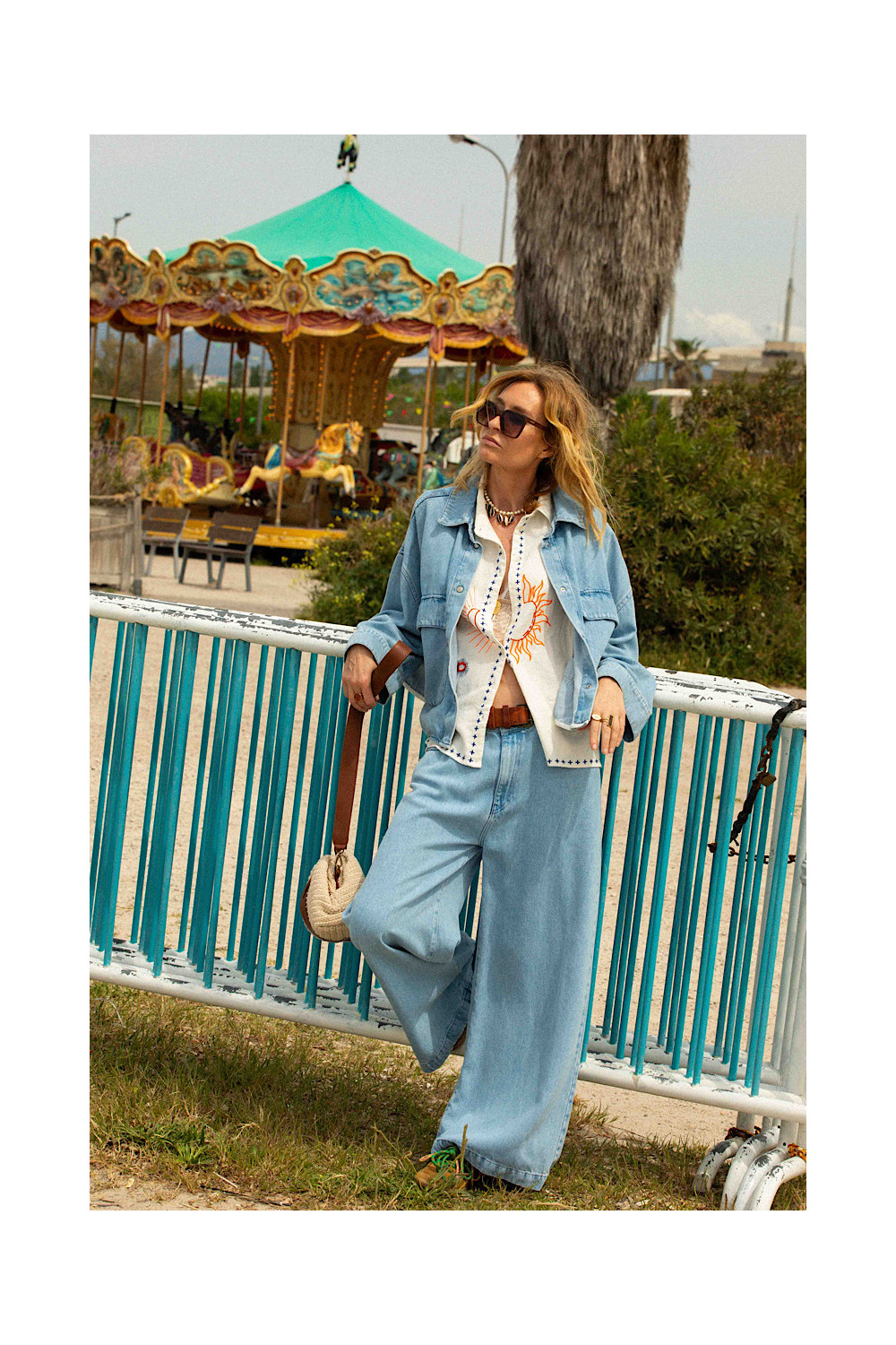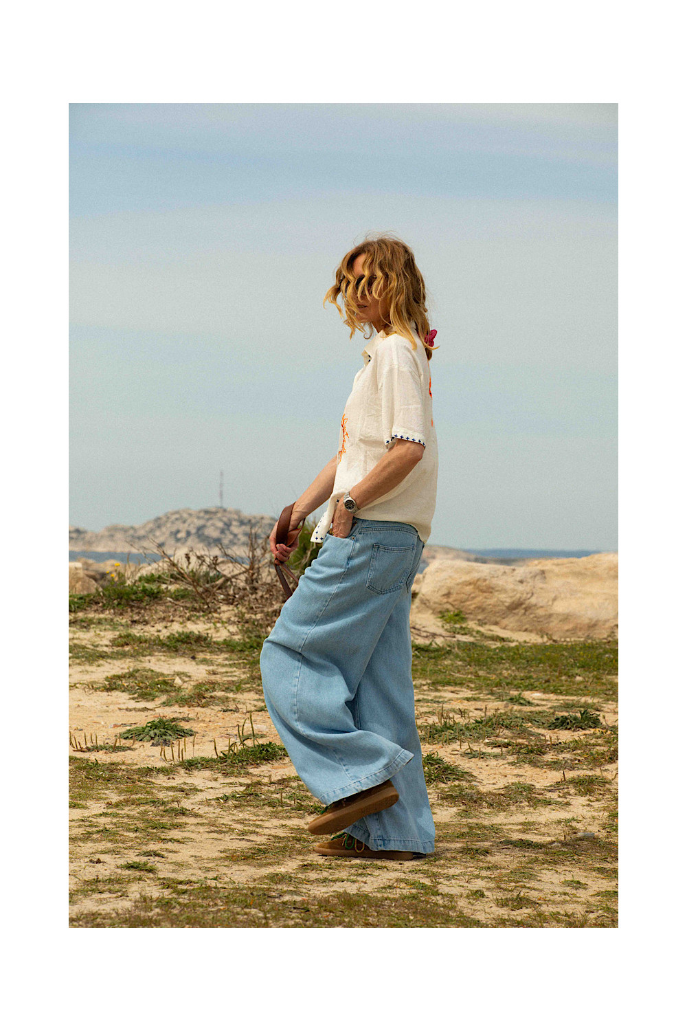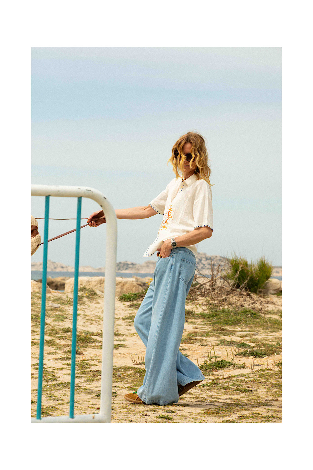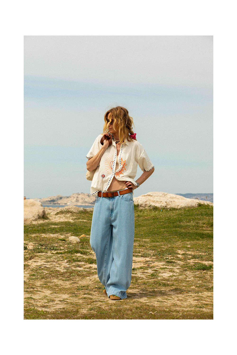 Caractéristiques : jean bleu large, fermeture éclair, 5 poches