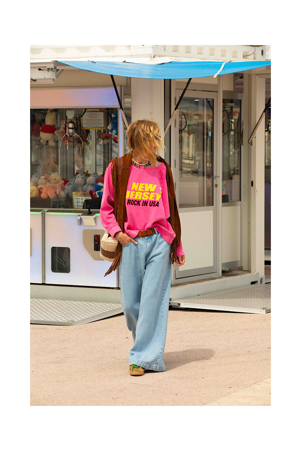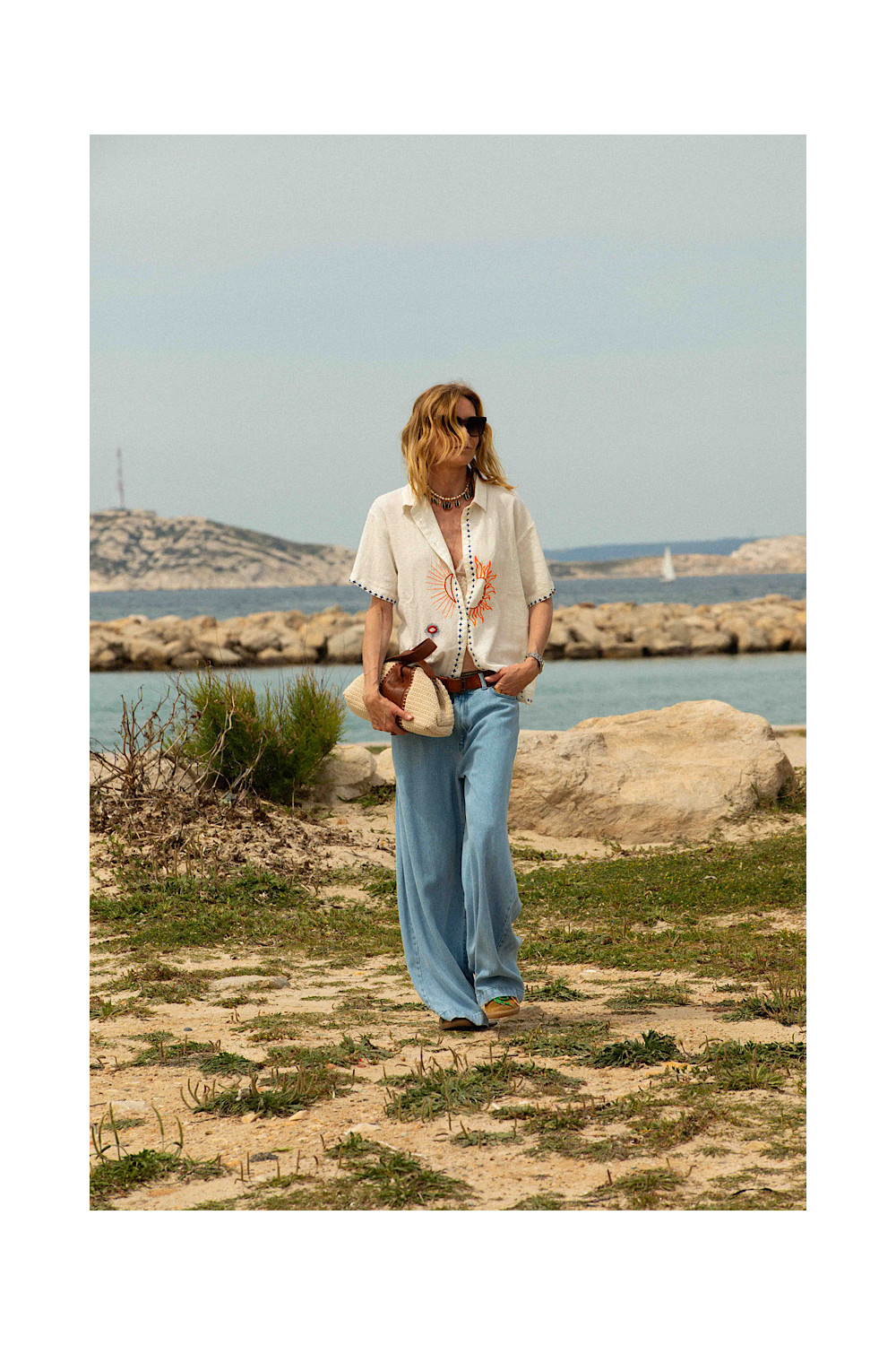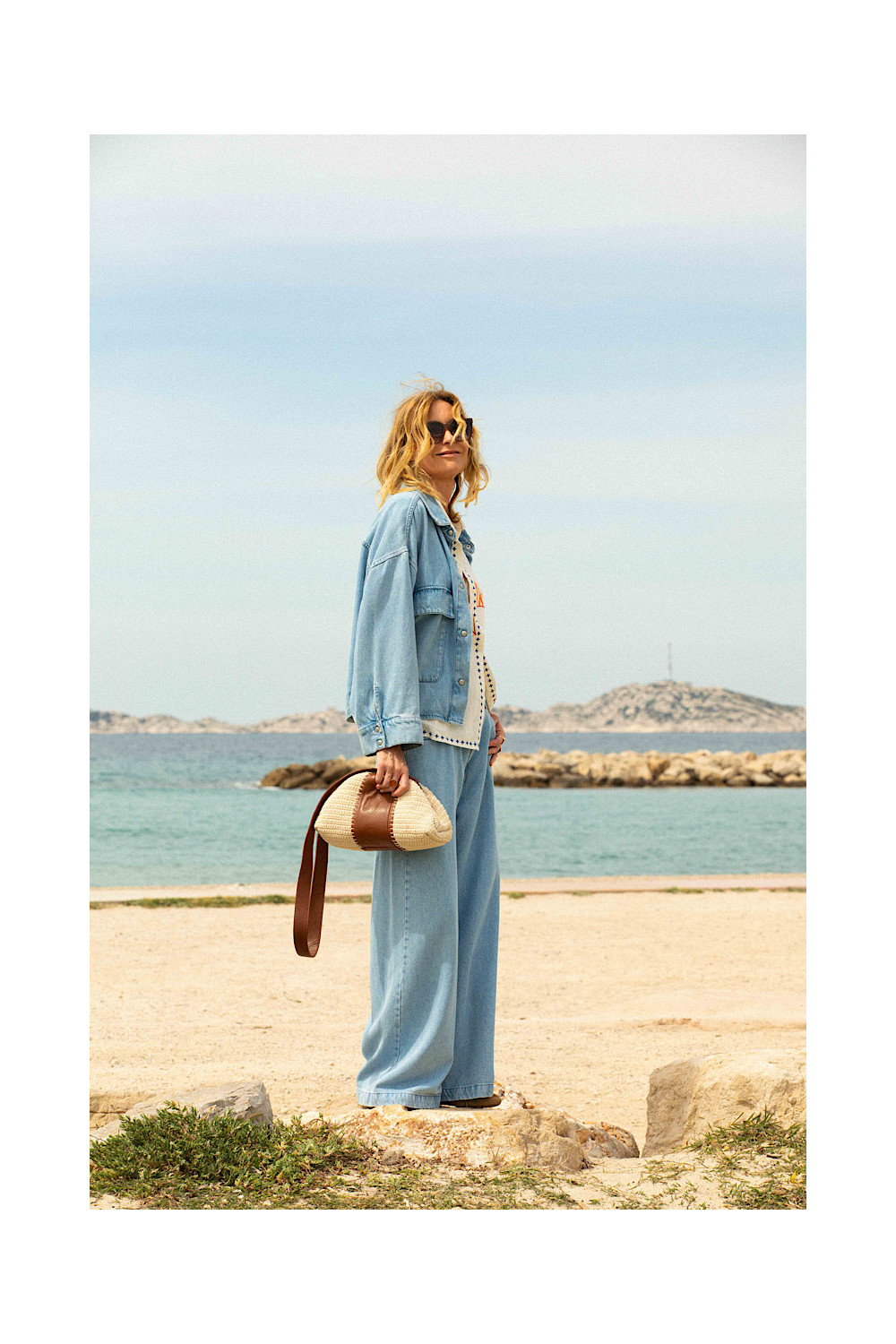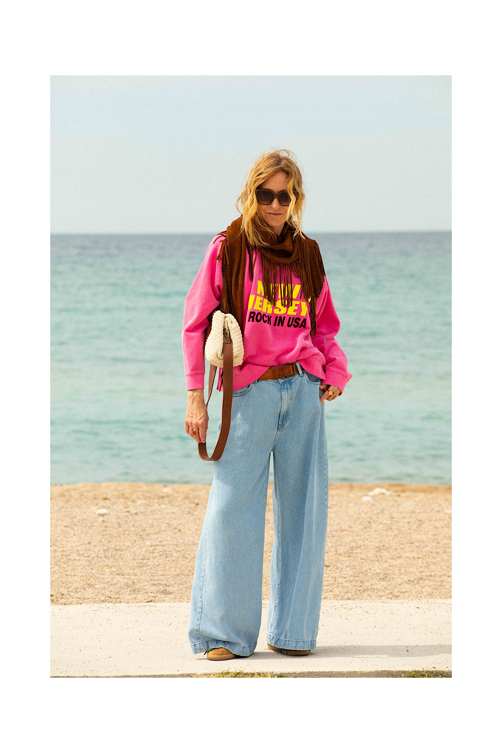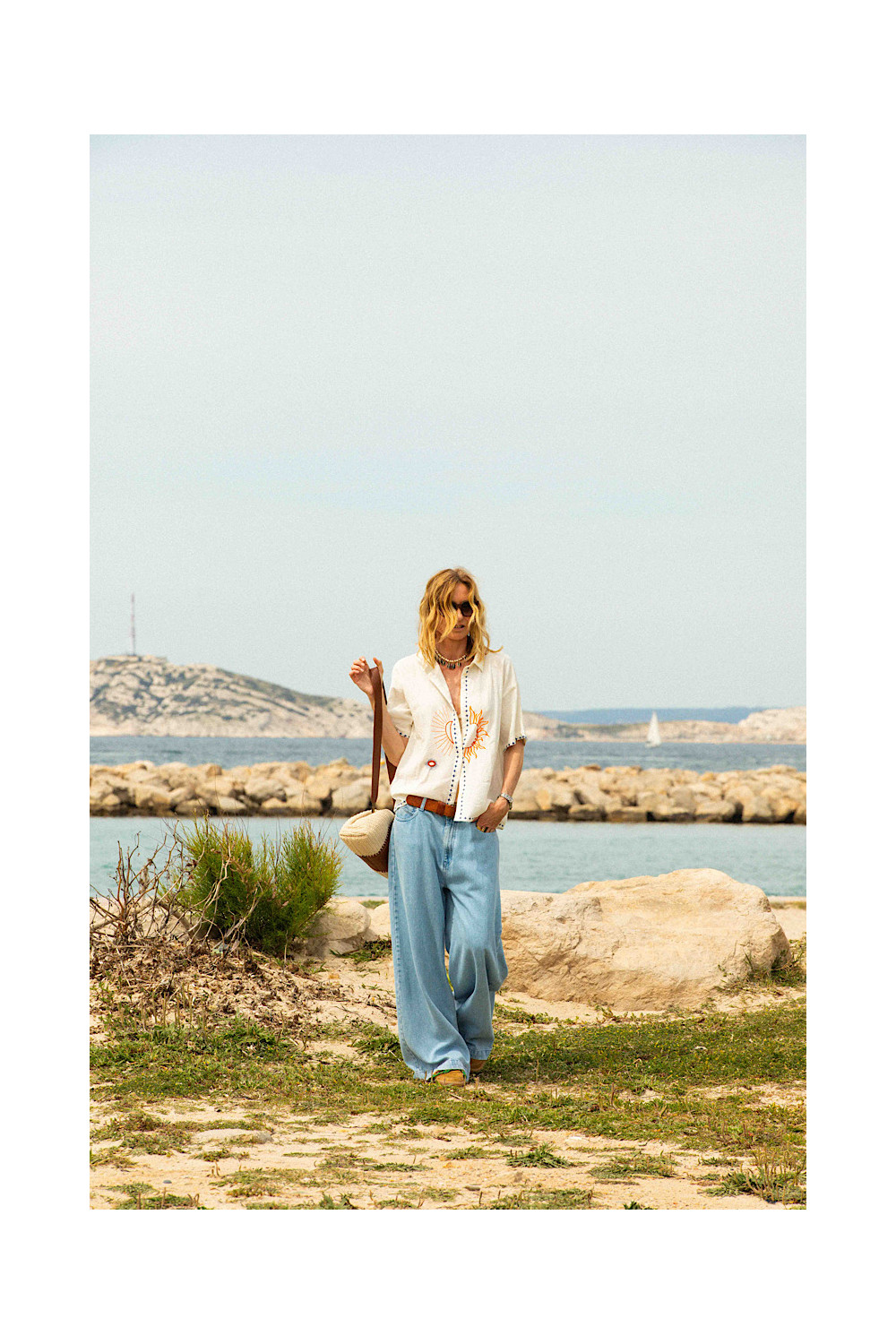 Caractéristiques : jean bleu large, fermeture éclair, 5 poches