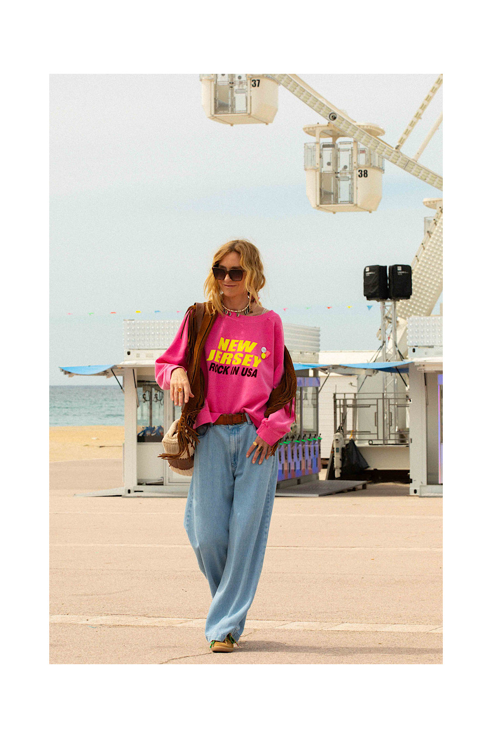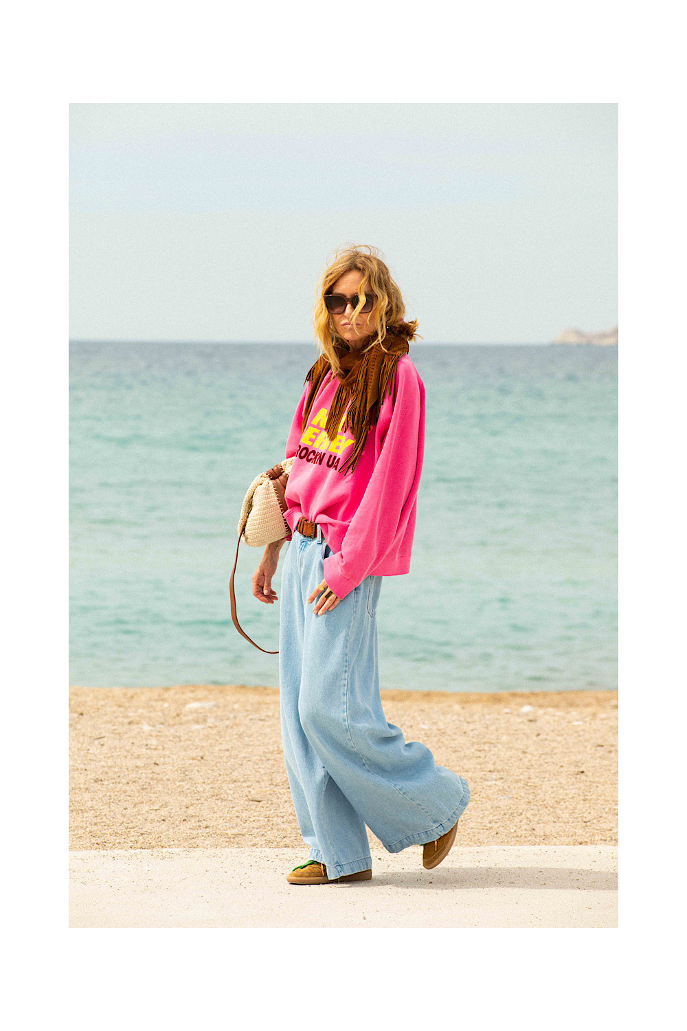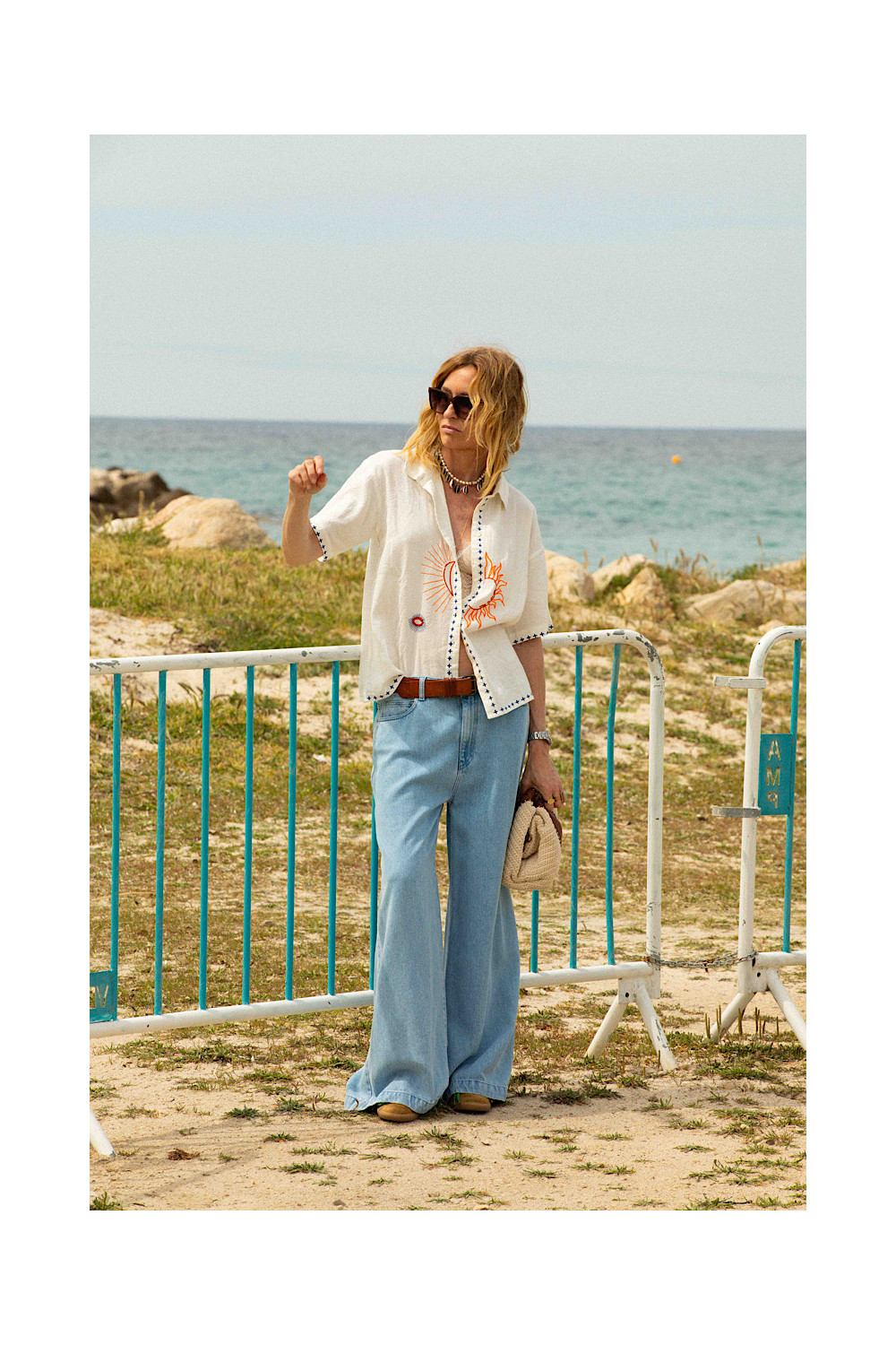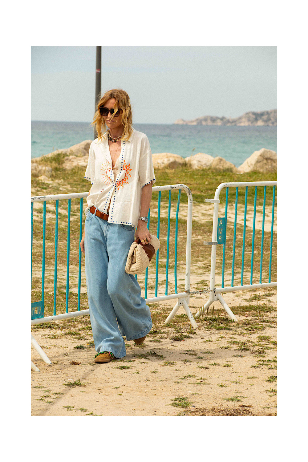 Caractéristiques : jean bleu large, fermeture éclair, 5 poches