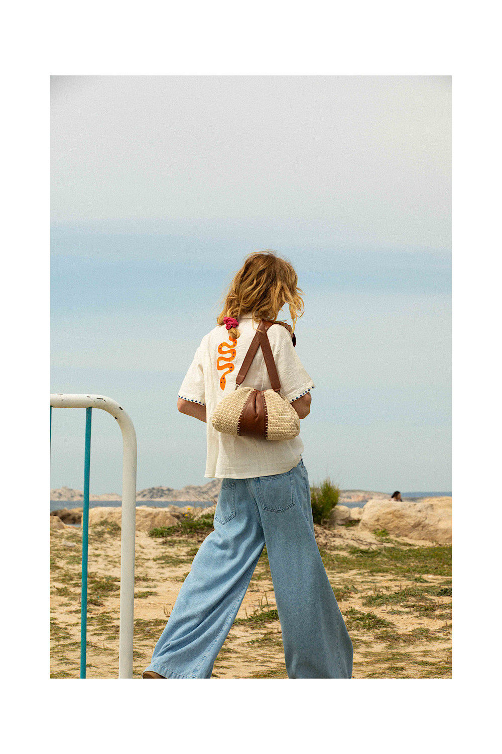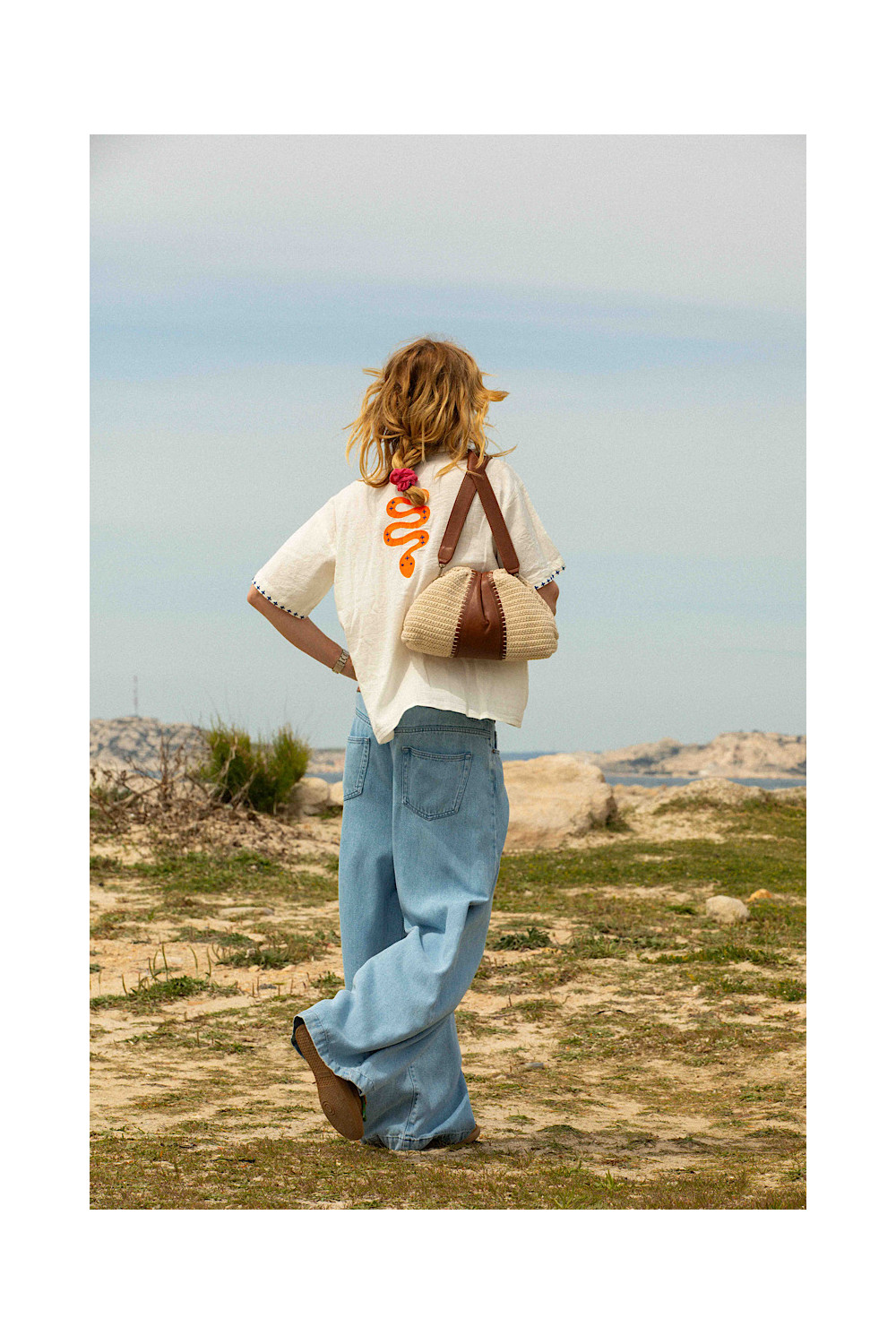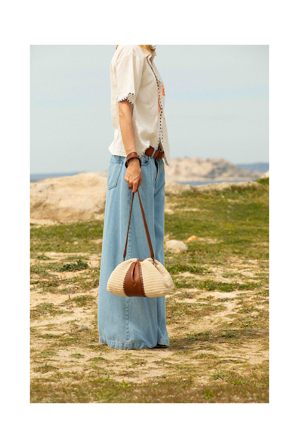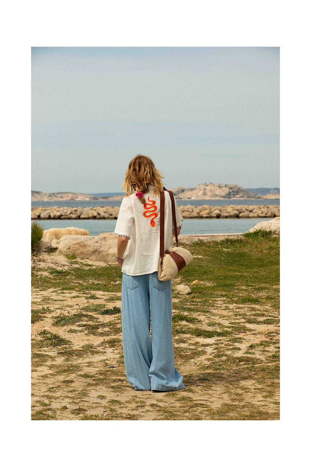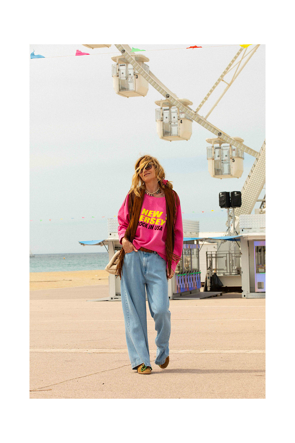 Caractéristiques : jean bleu large, fermeture éclair, 5 poches