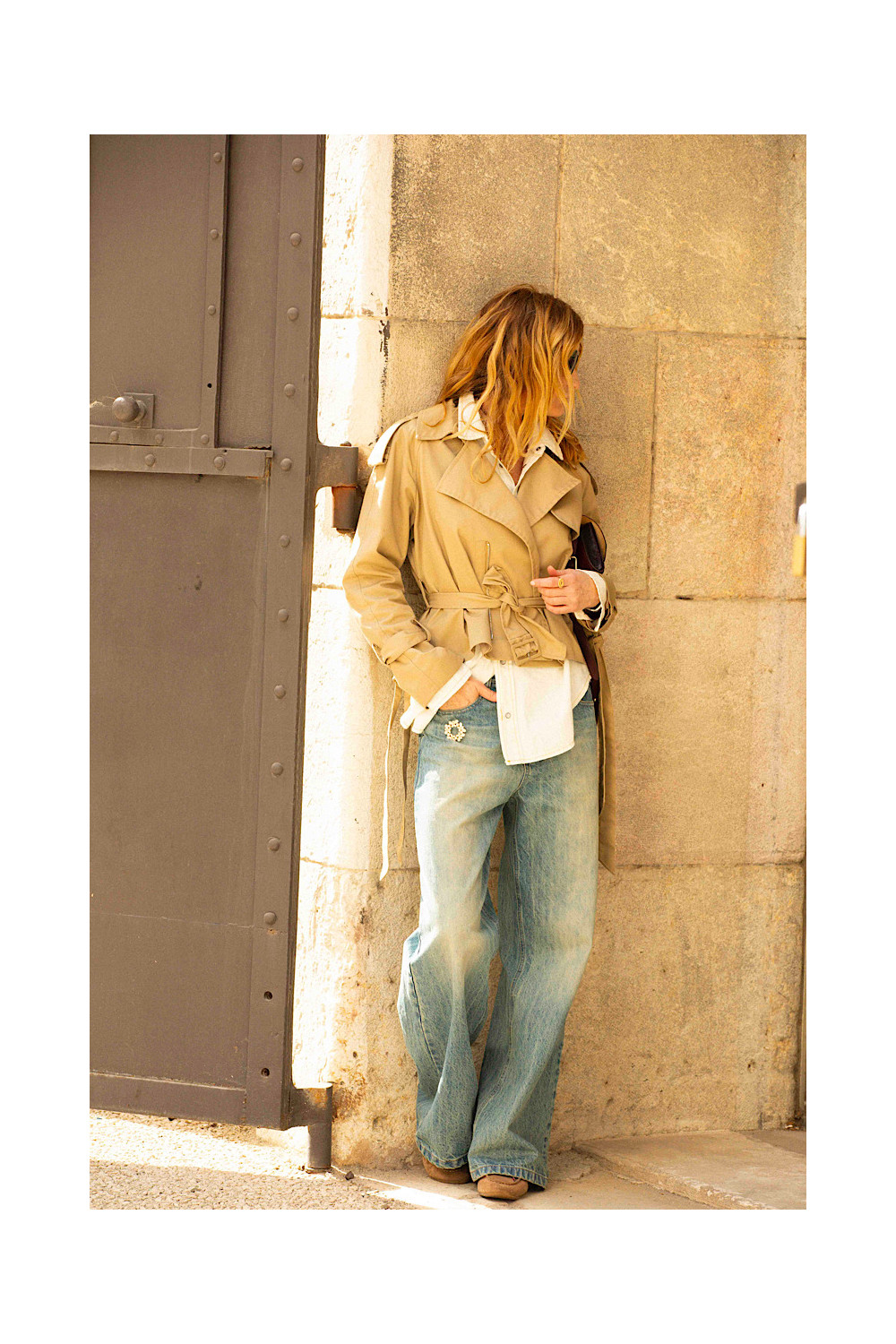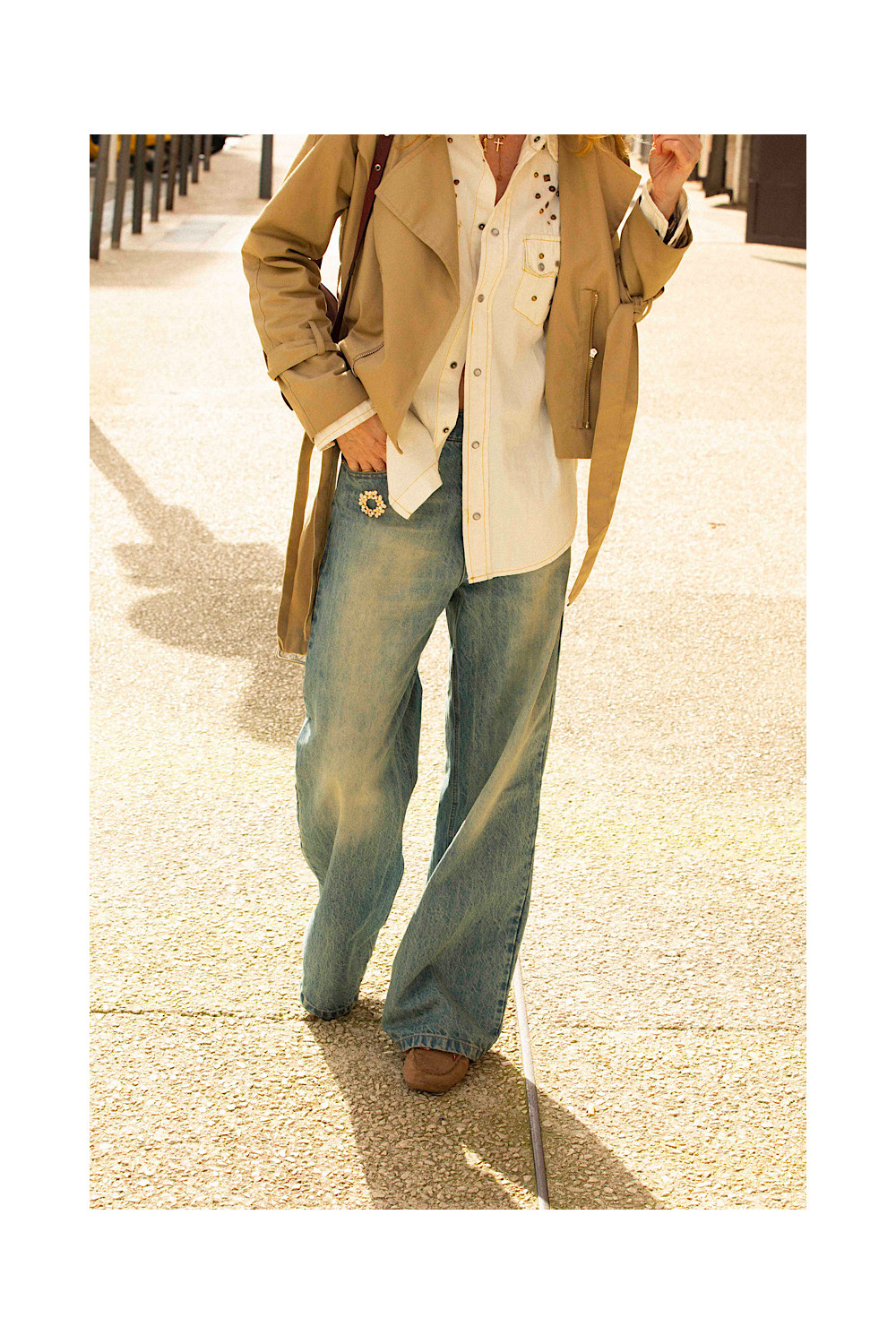 Fermeture 1 bouton et zip. Taille fixe avec passants ceinture. 5 poches.