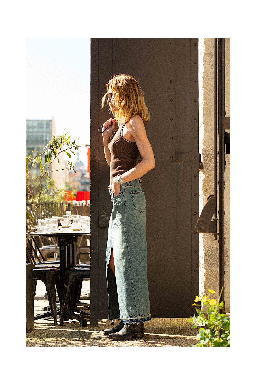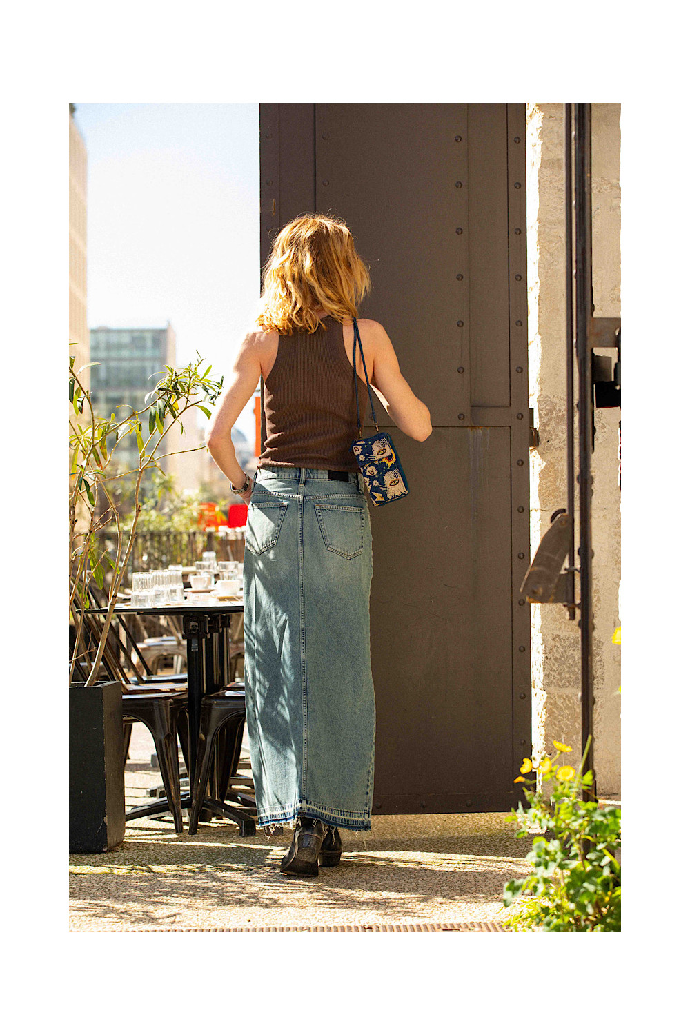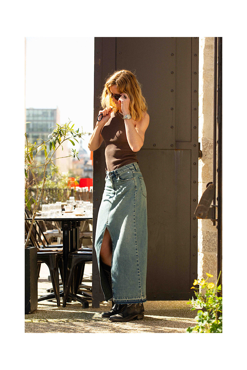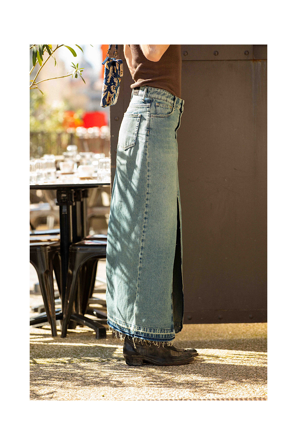 Caractéristiques : jupe jean longue bleu, 5 poches, fermeture éclair, bouton, fente à l'avant