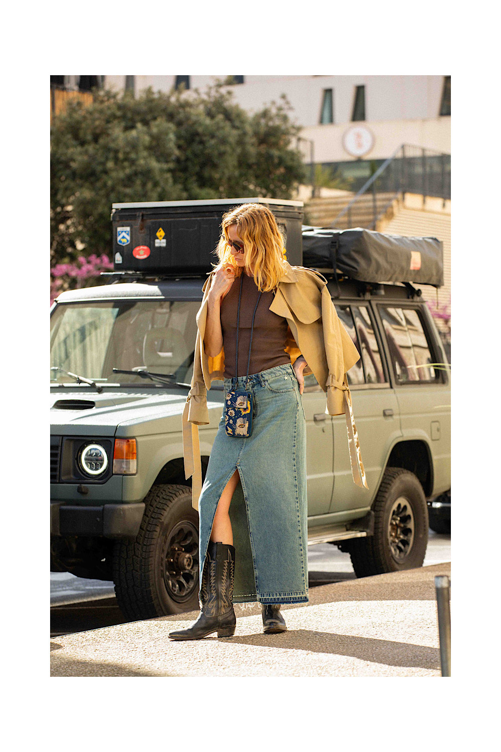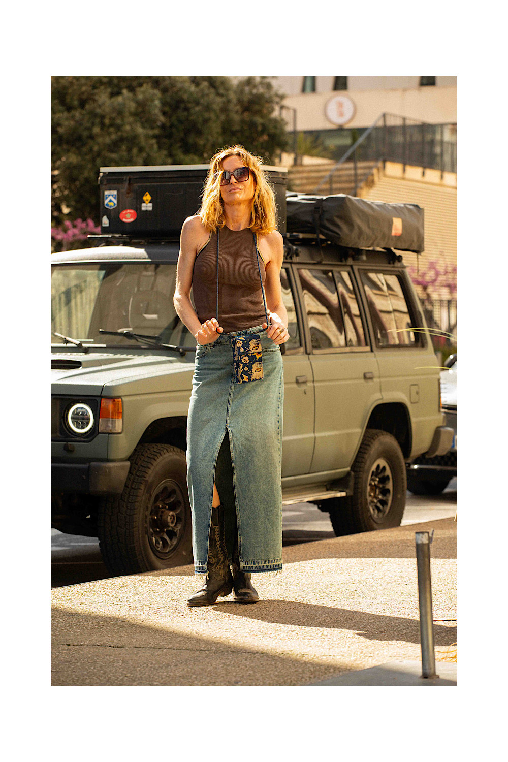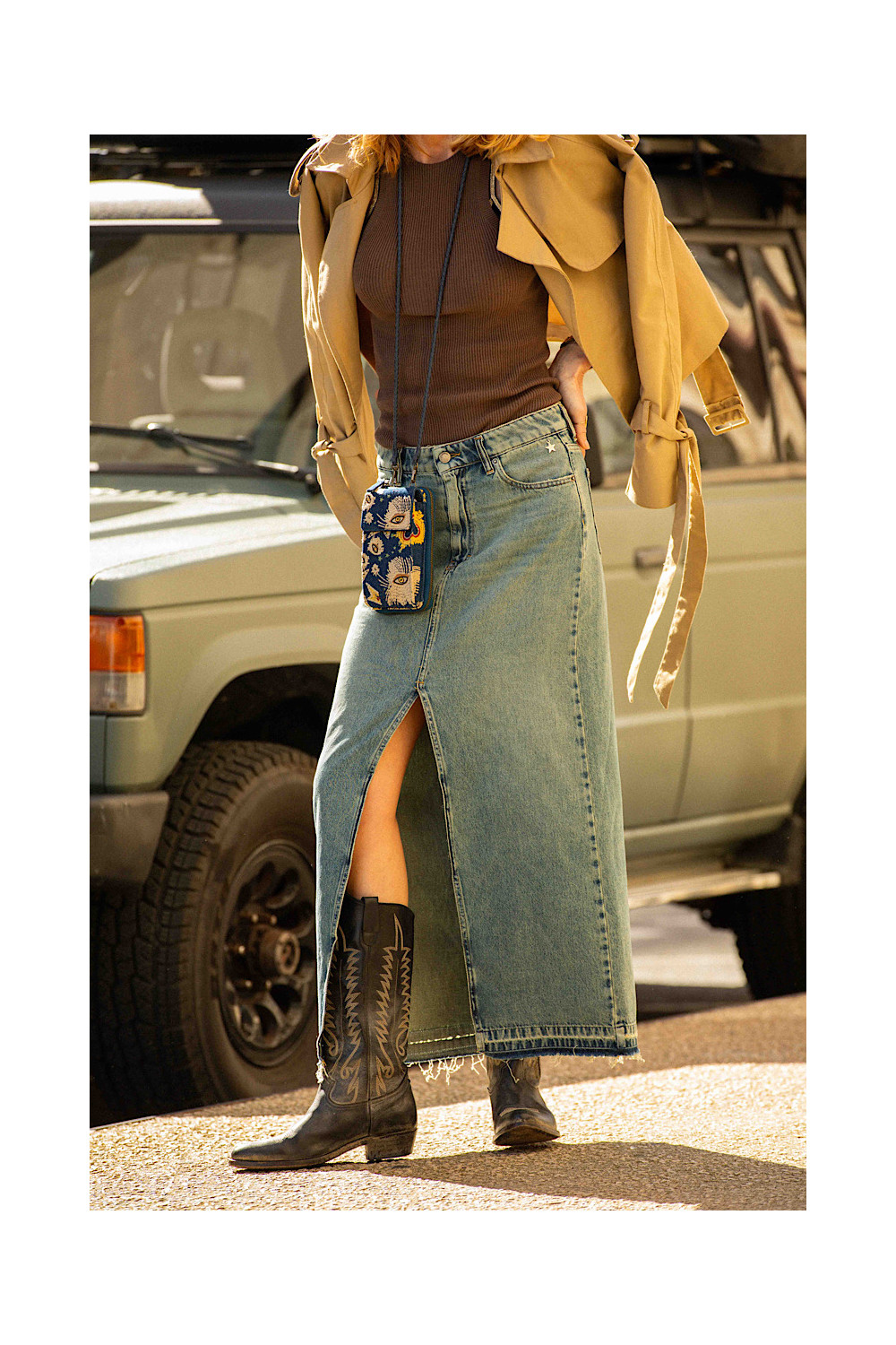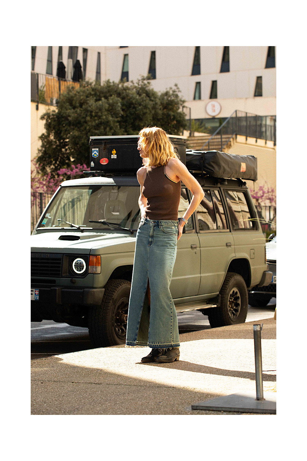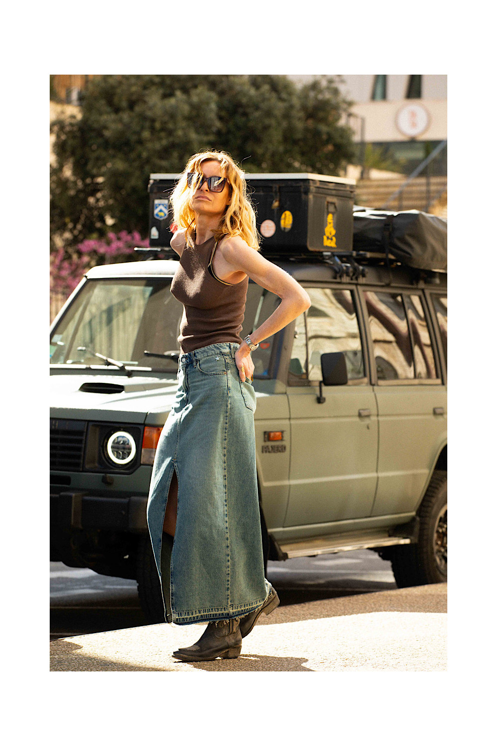 Caractéristiques : jupe jean longue bleu, 5 poches, fermeture éclair, bouton, fente à l'avant
