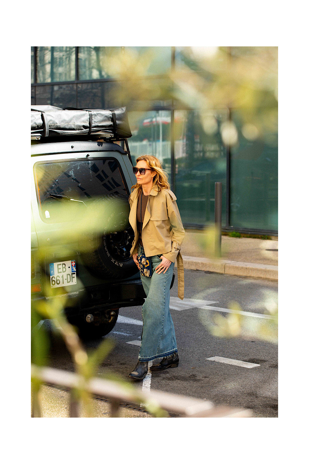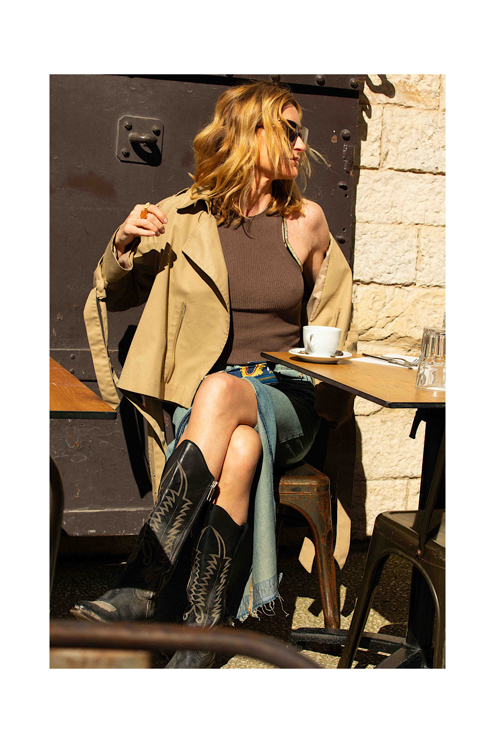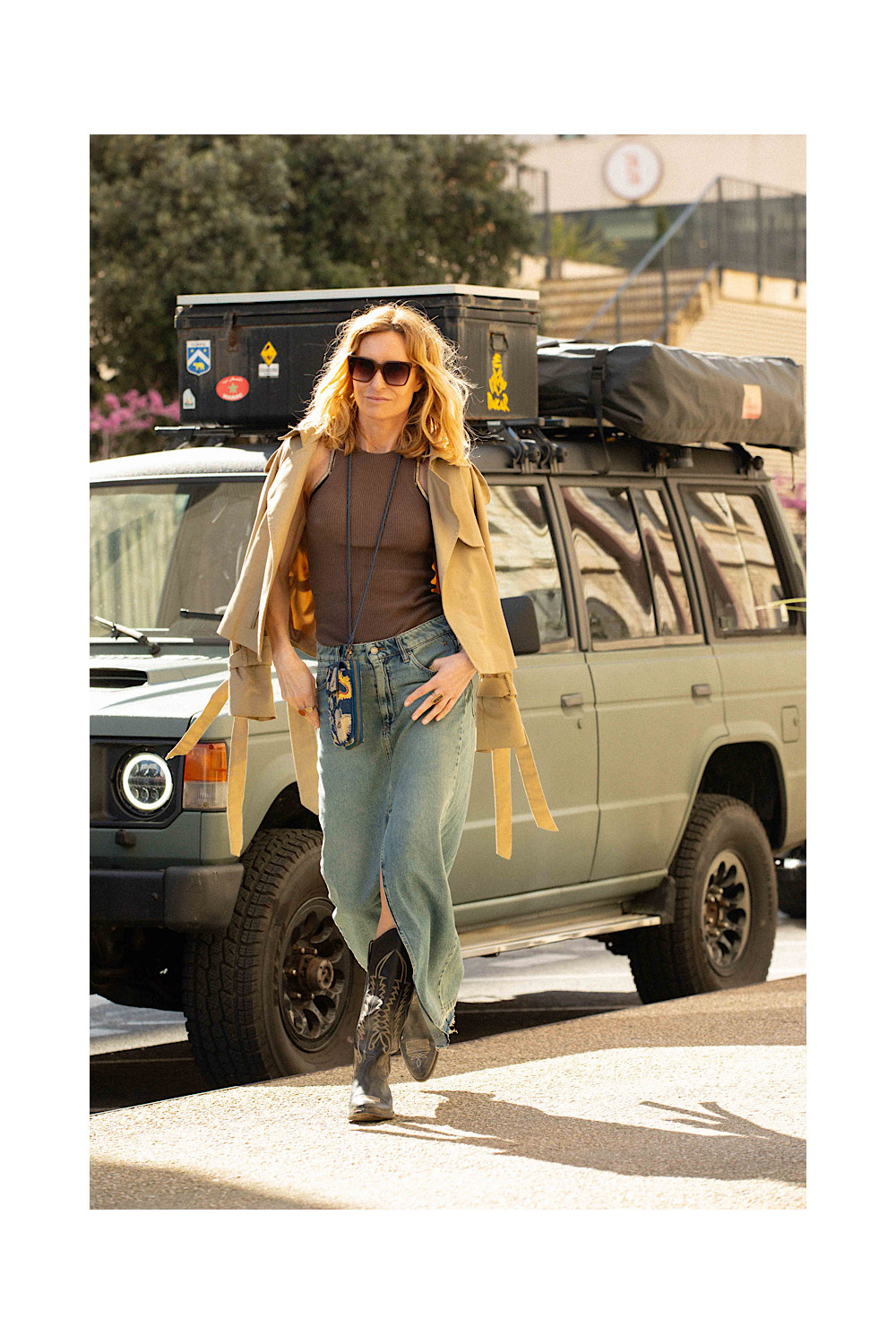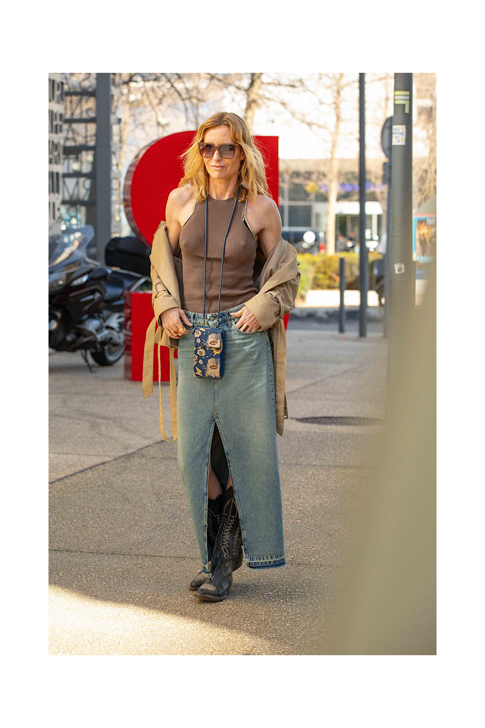 Caractéristiques : jupe jean longue bleu, 5 poches, fermeture éclair, bouton, fente à l'avant