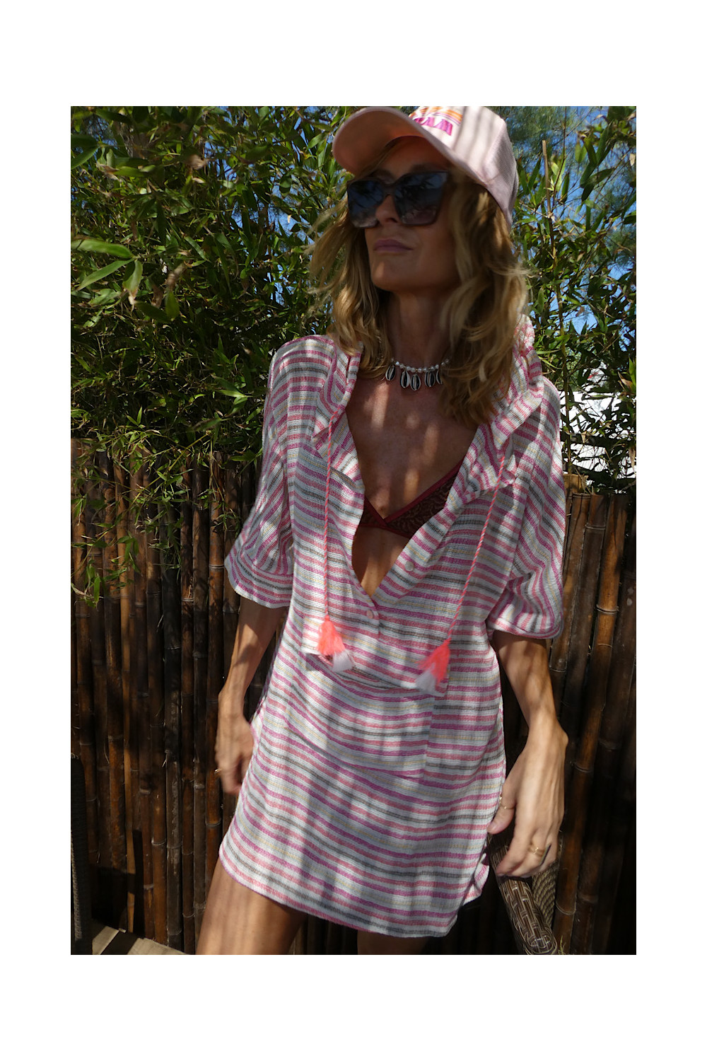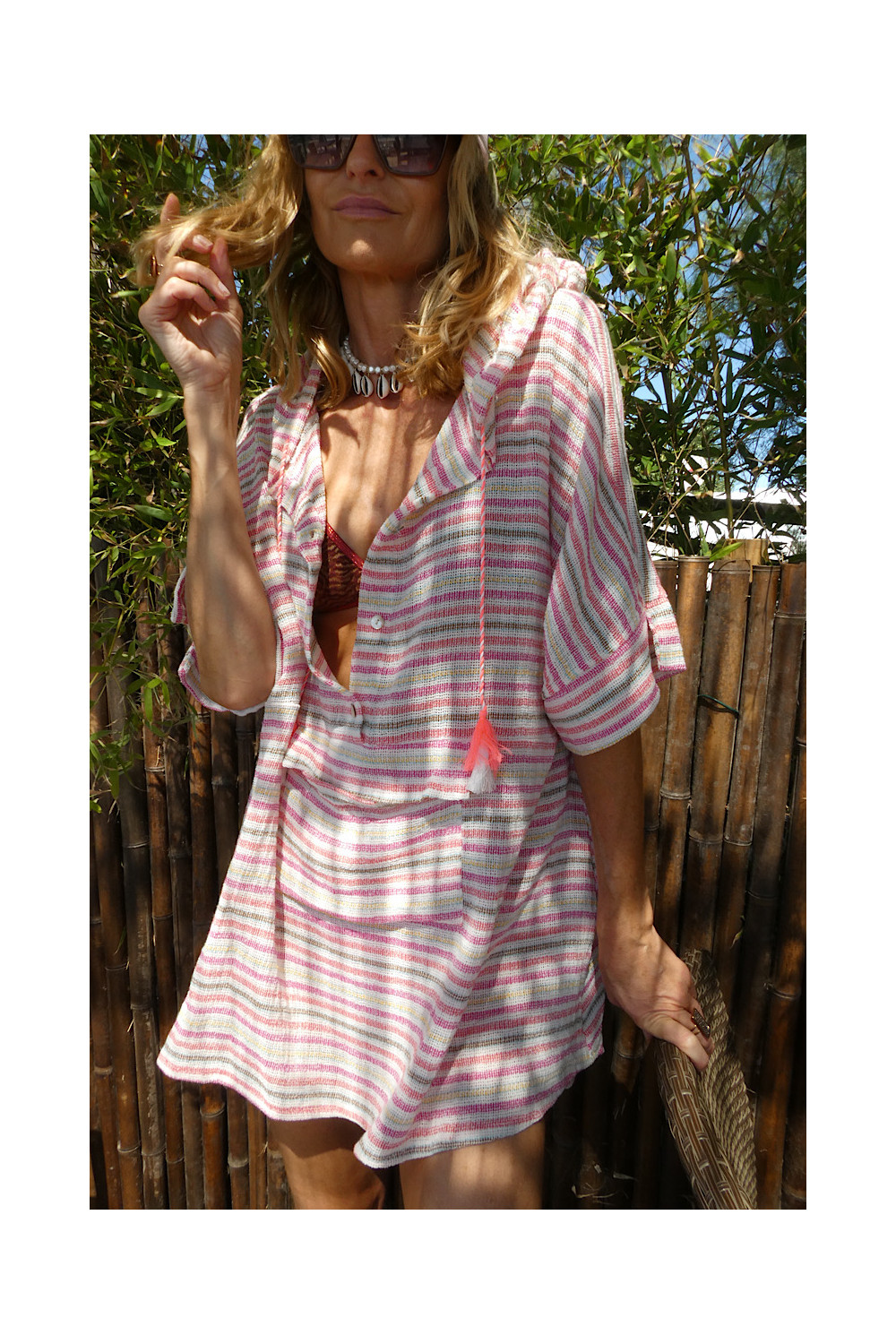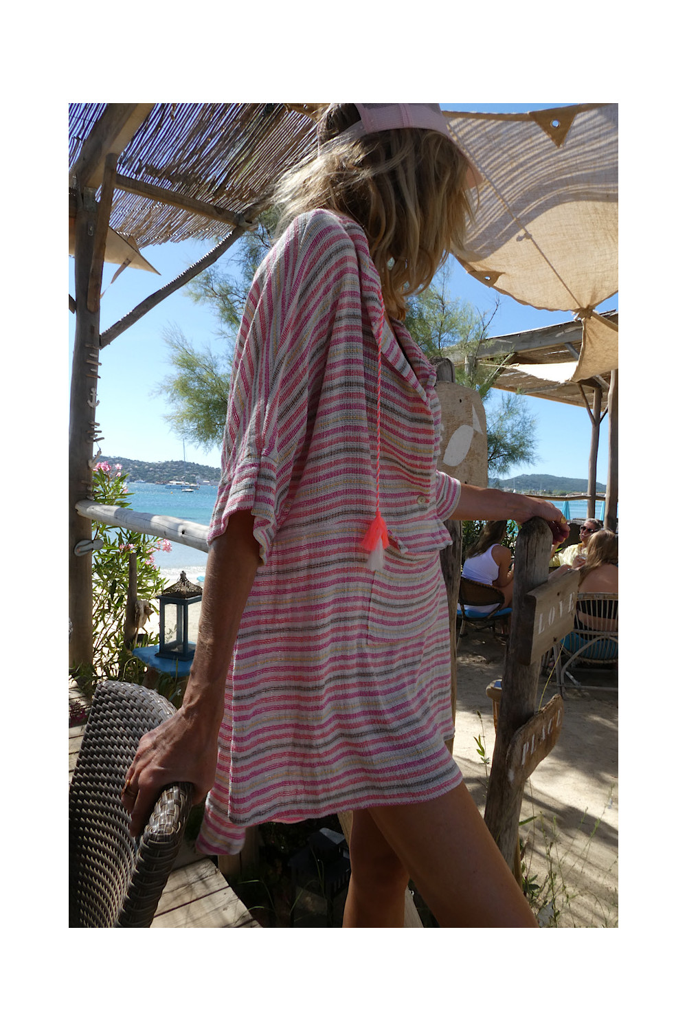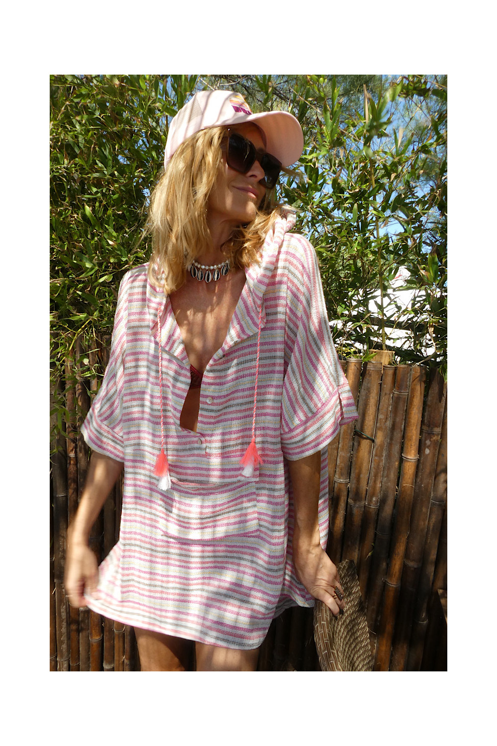 Caractéristiques : poncho à rayures colorées rose, marron, rouge, jaune... , 4 boutons, une poche à l'avant manches courtes, large, 2 pompons, capuche.