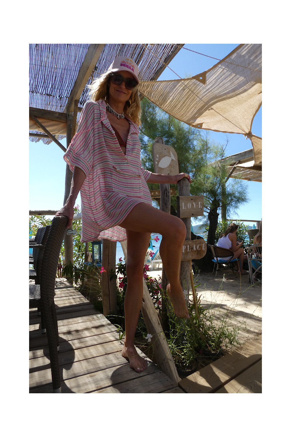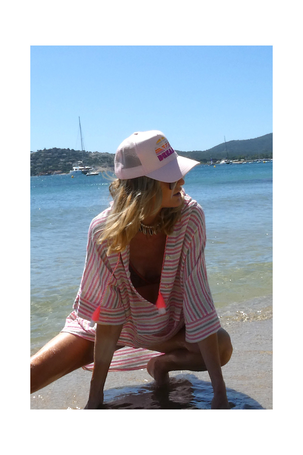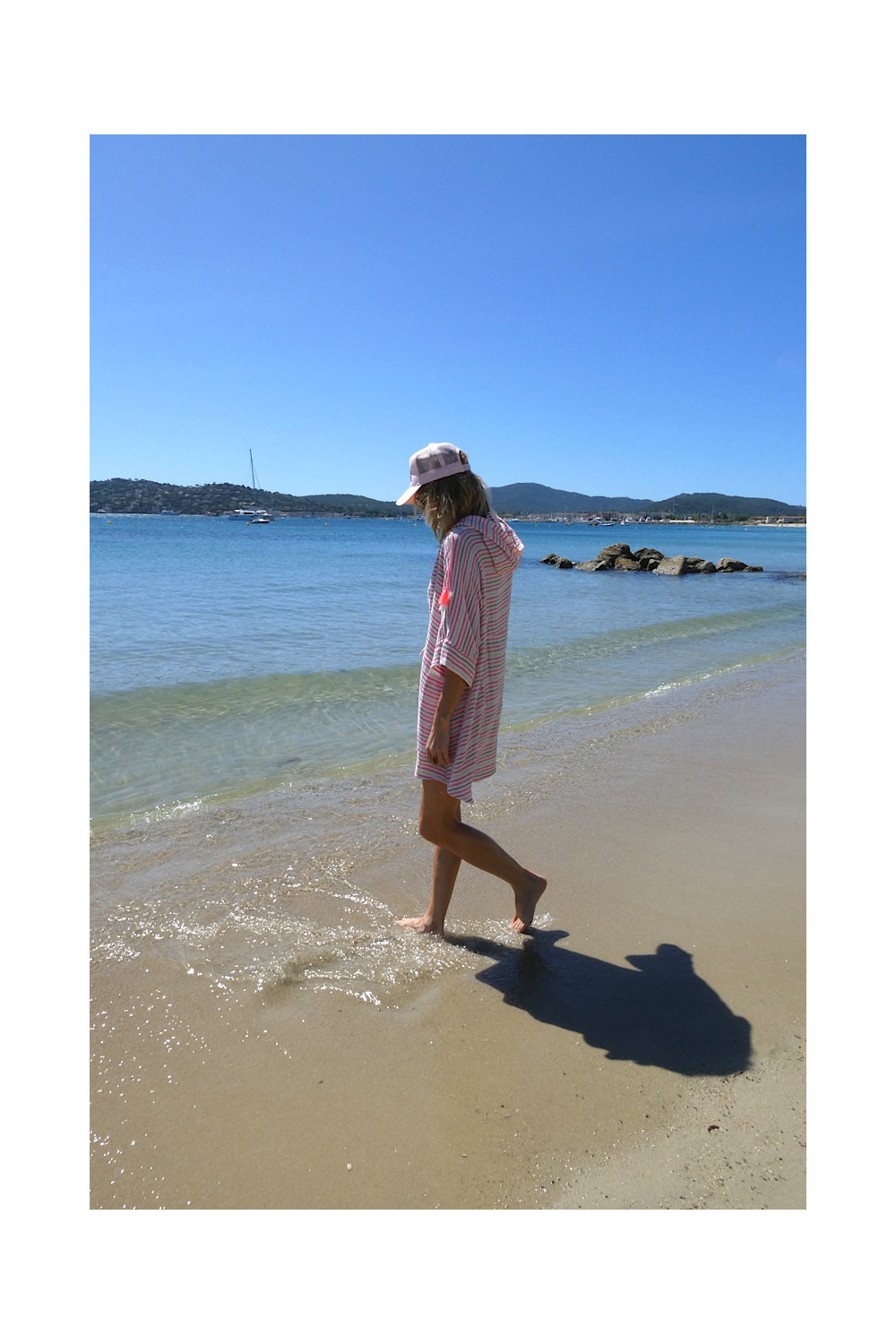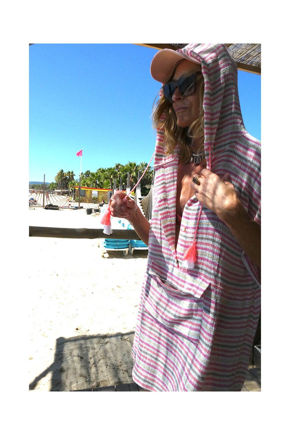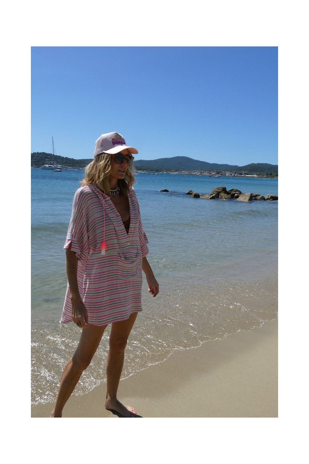 Caractéristiques : poncho à rayures colorées rose, marron, rouge, jaune... , 4 boutons, une poche à l'avant manches courtes, large, 2 pompons, capuche.