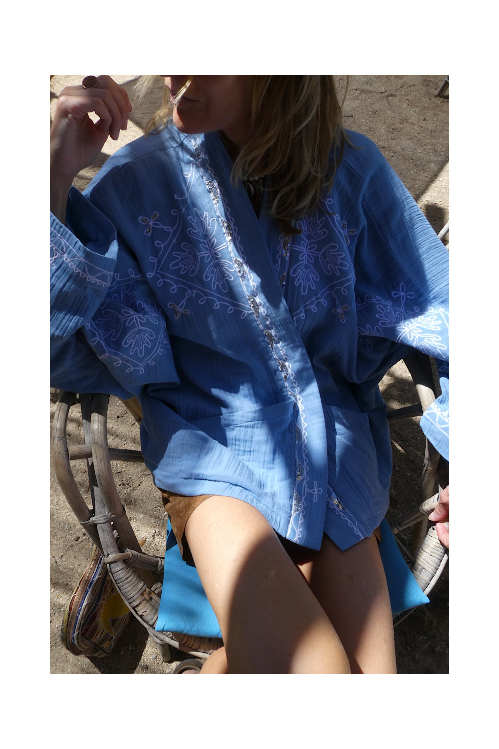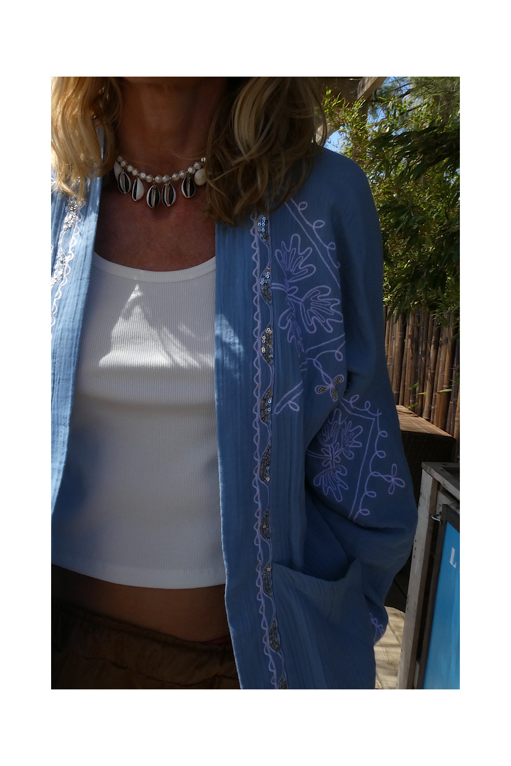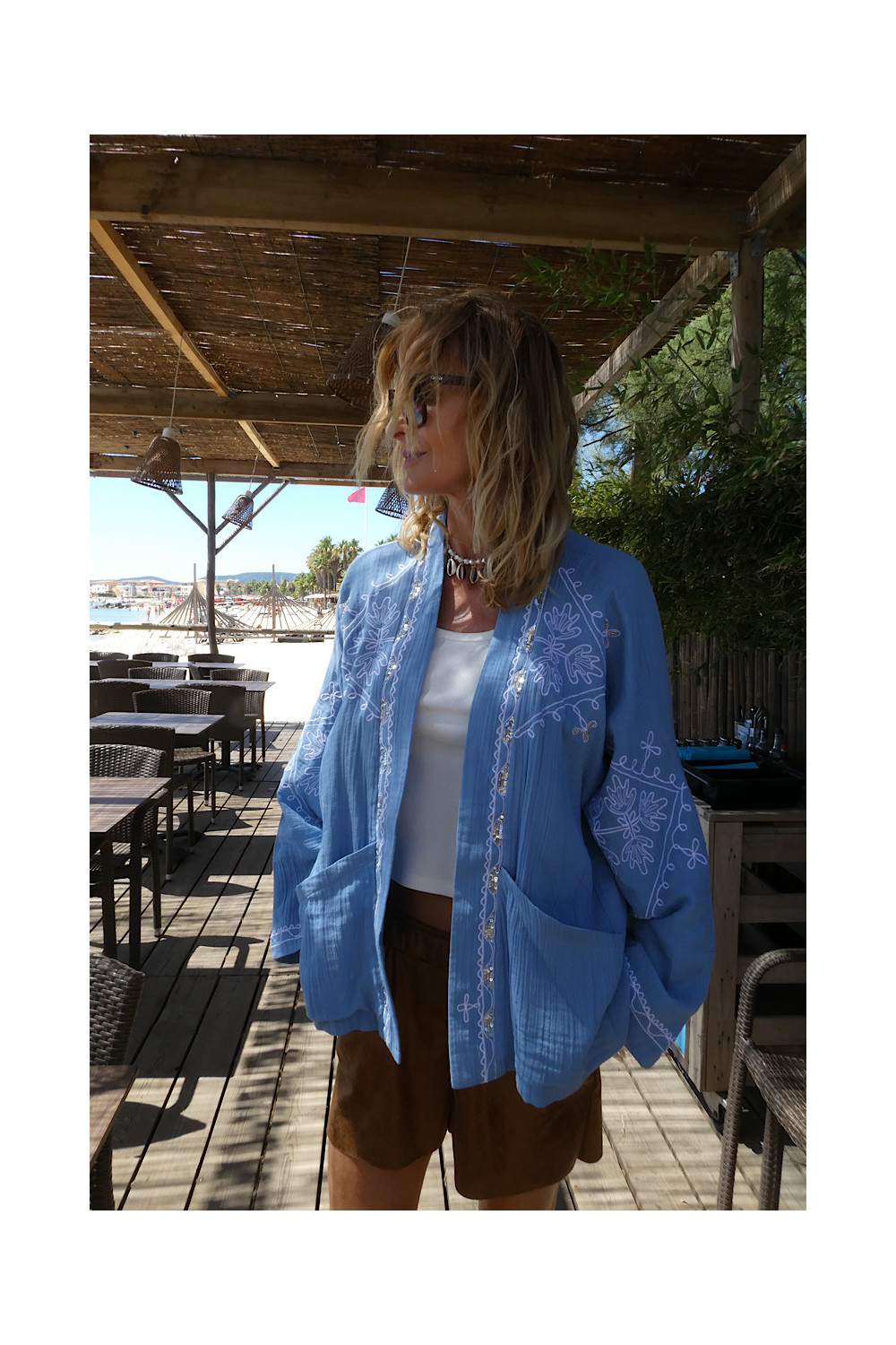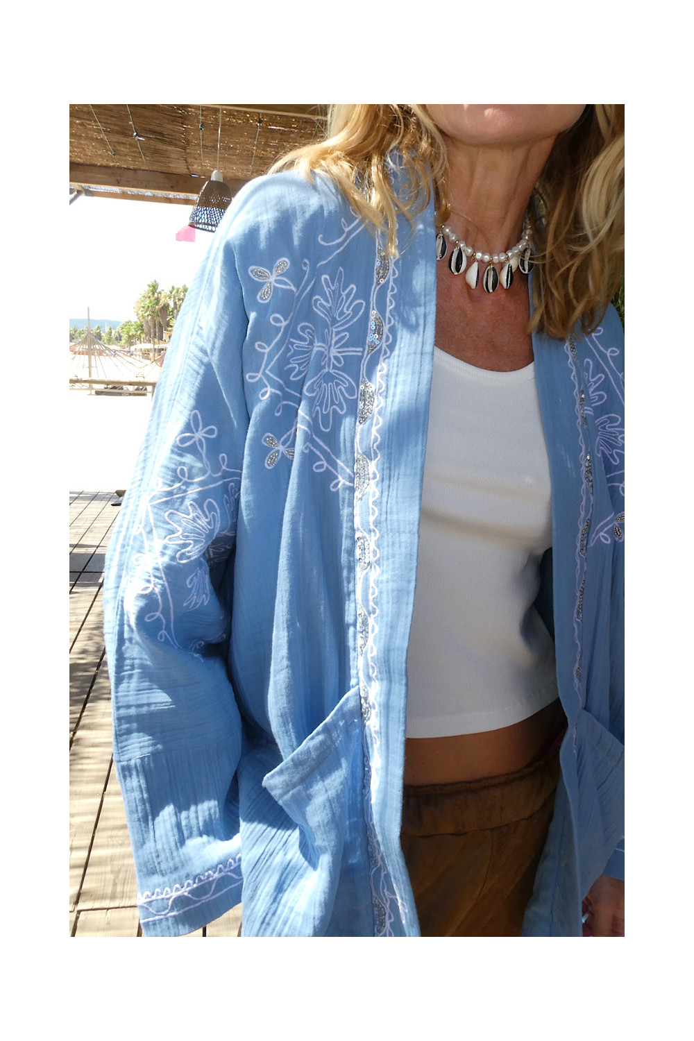 Caractéristiques : kimono bleu ciel, broderie blanche avec des détails argentés, manches longues, coupe des manches chauve-souris, 2 poches devant.