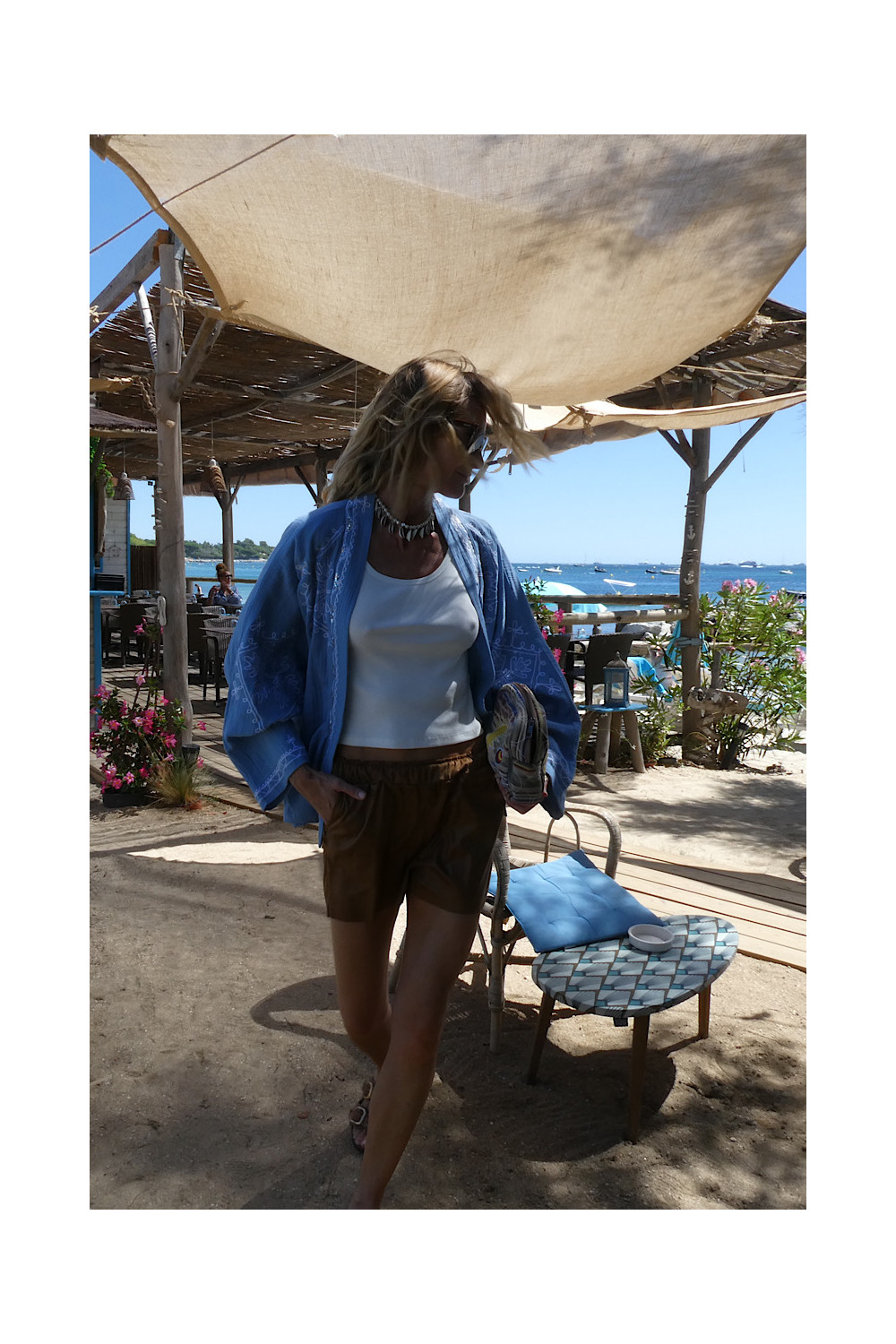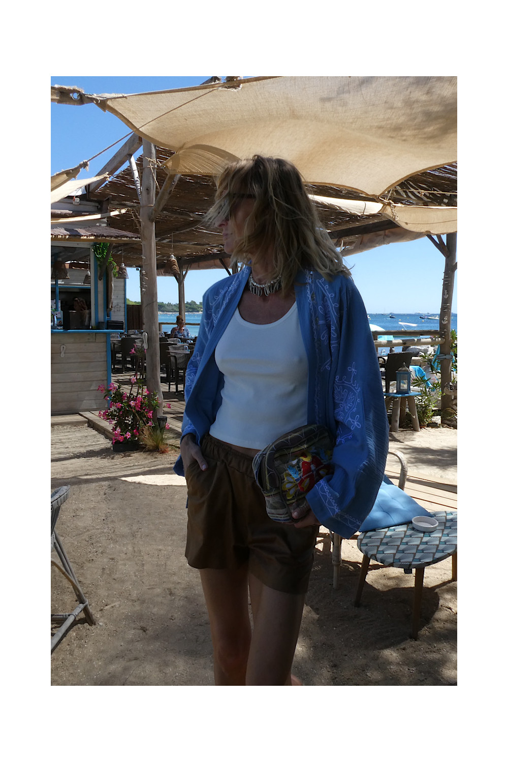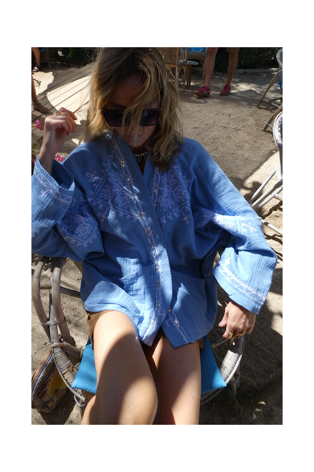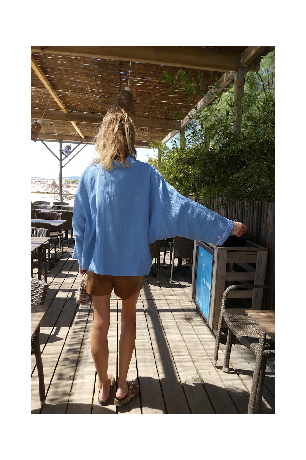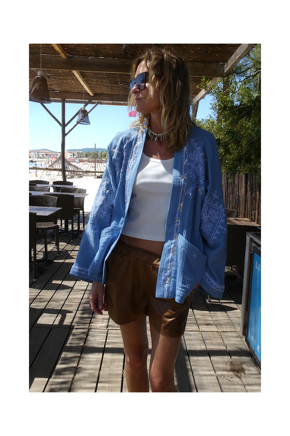 Caractéristiques : kimono bleu ciel, broderie blanche avec des détails argentés, manches longues, coupe des manches chauve-souris, 2 poches devant.
