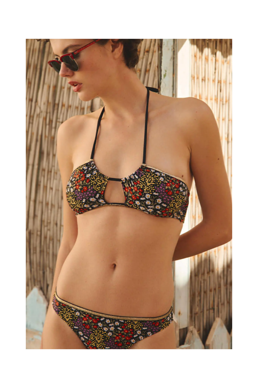 Haut de maillot forme bandeau avec mousses amovibles. Detail charms en piment, liens a nouer autour du cou.