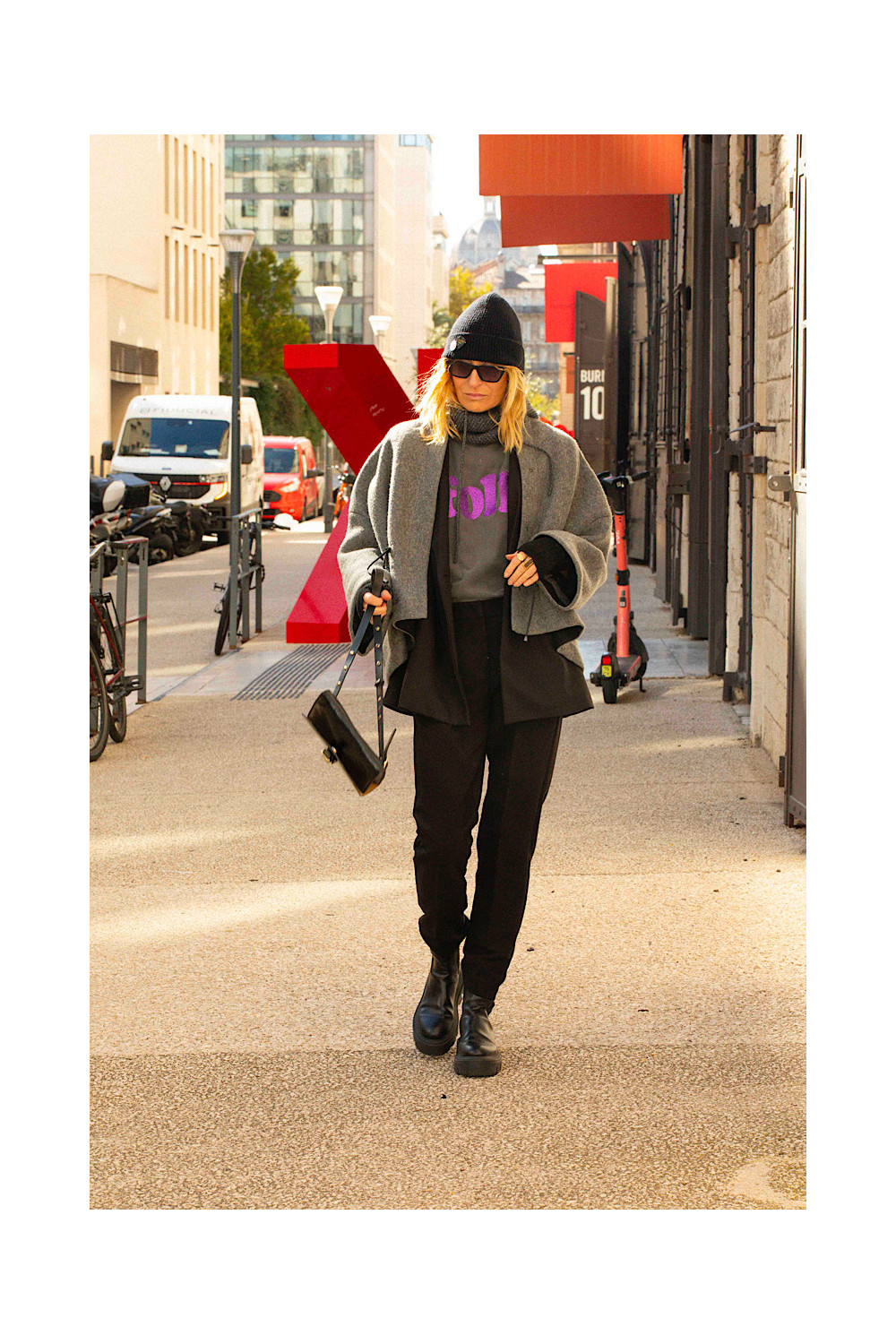 Caractéristiques : manteau gris, manches oversize, 4 boutons, se ressert à la taille, moumoute court, col carré