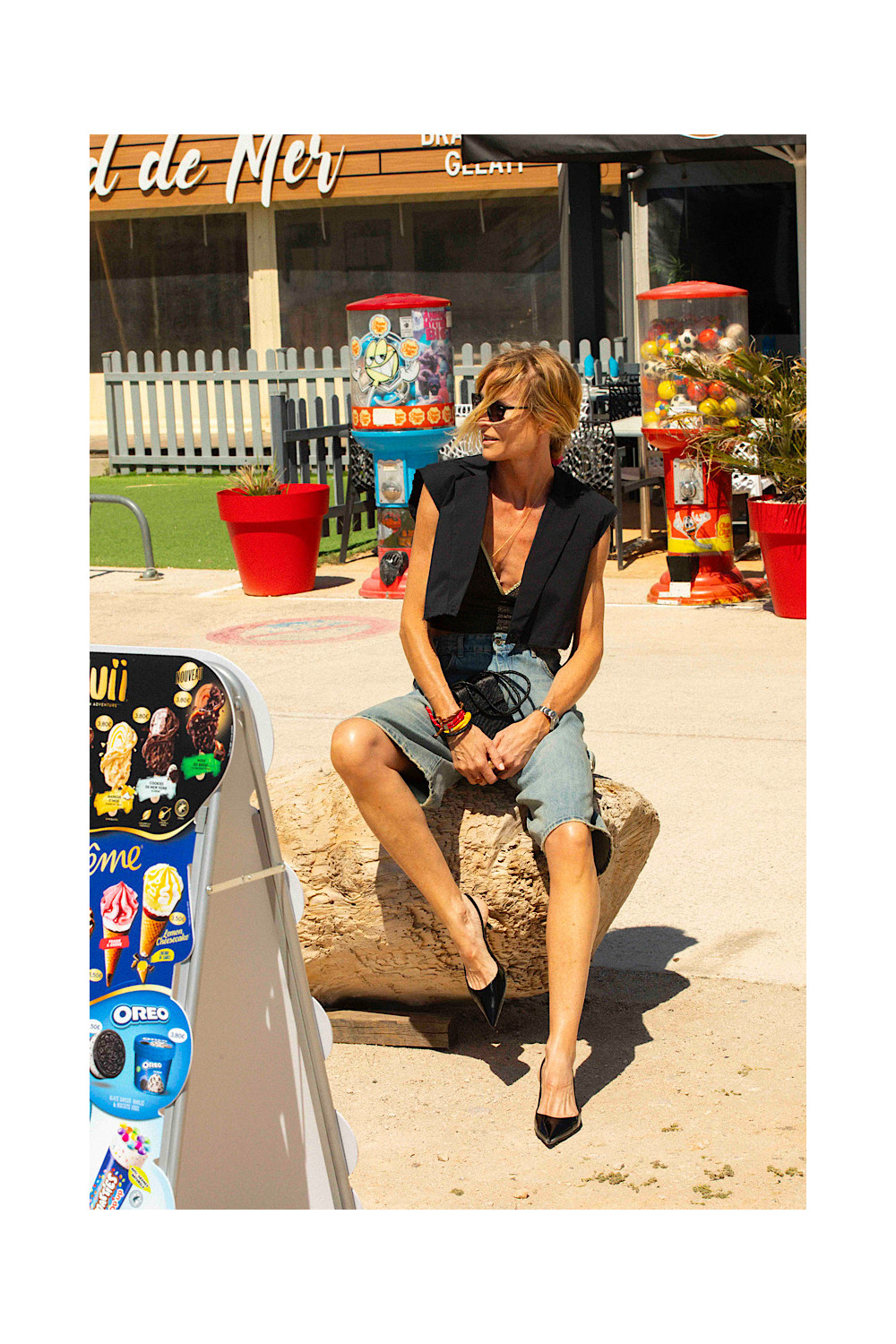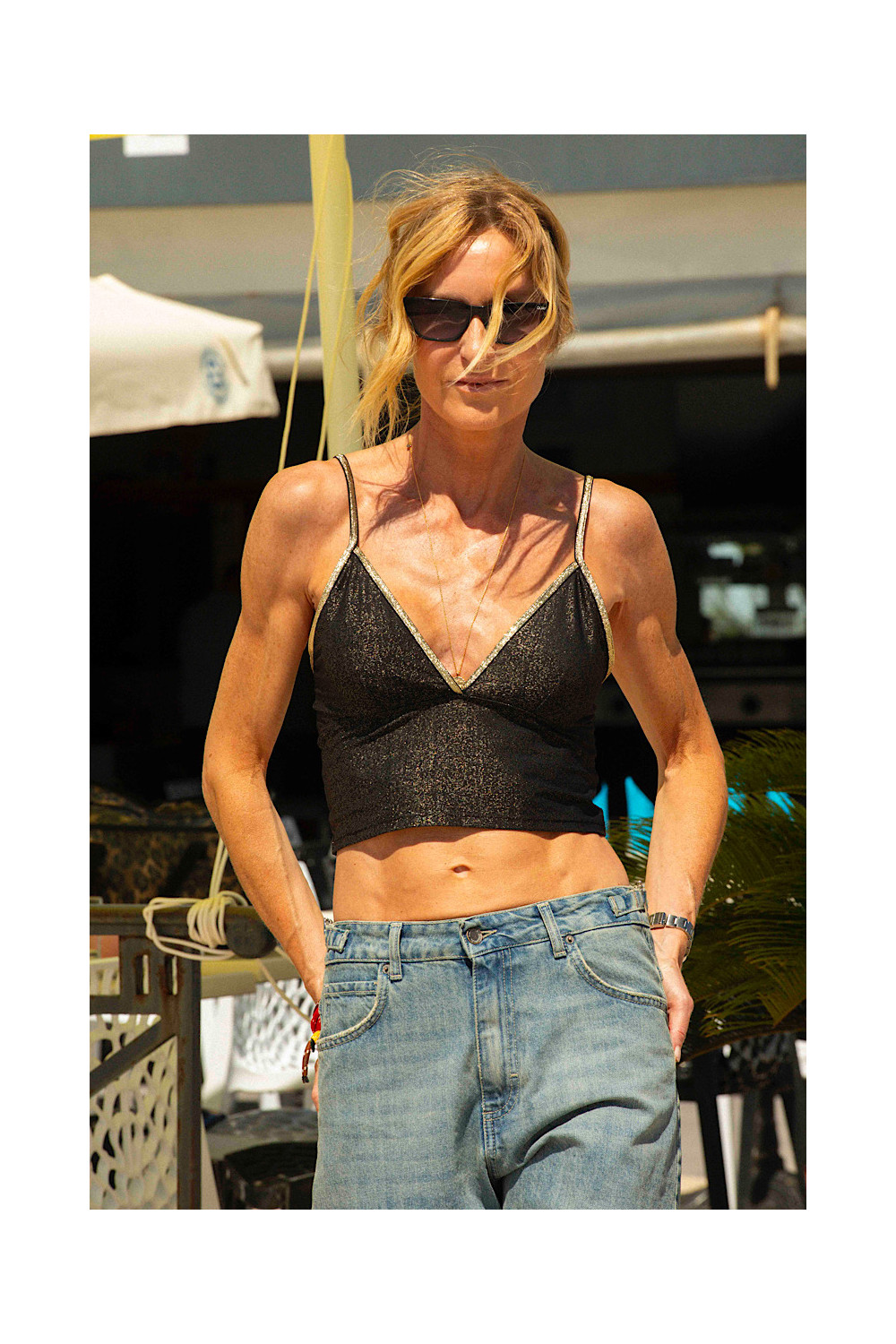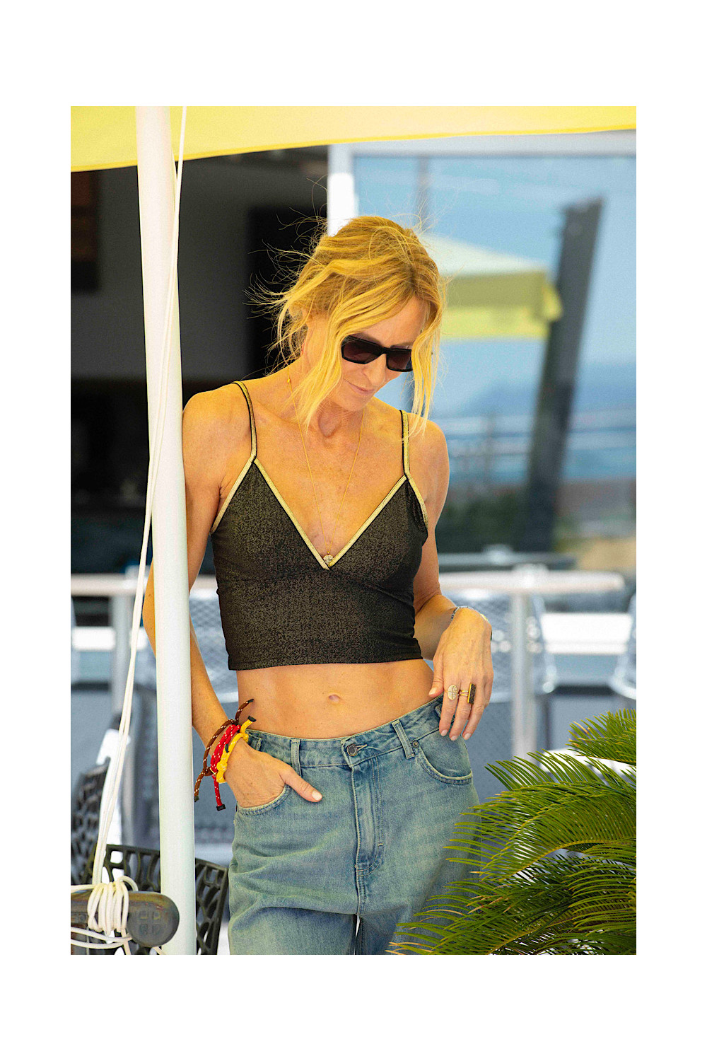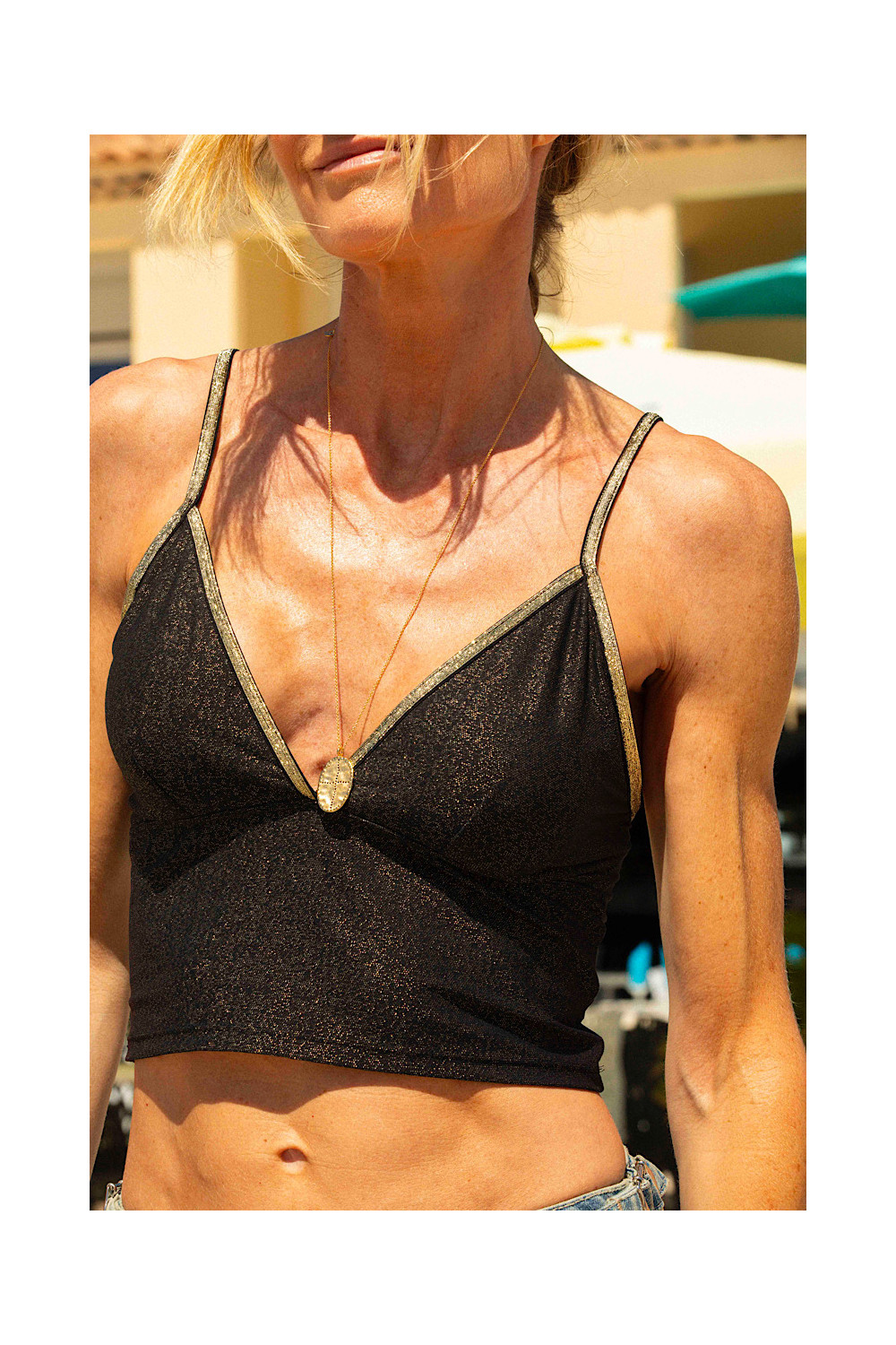 Caractéristiques : top à bretelles crop-top sans armatures, coupe triangle, décolleté plongeant, bretelles ajustables, peut se porter avec les bretelles droites ou croisées dans le dos, tissu souple, noir pailleté opaque.