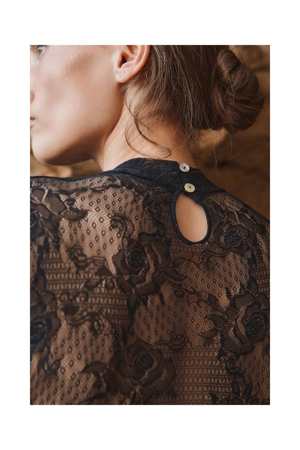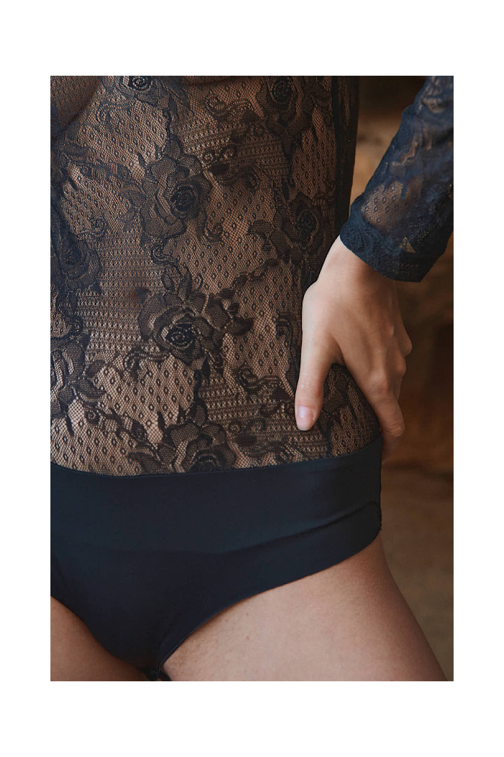 Caractéristiques : Body en dentelle transparente, Manches longues, Col cheminée, Bas culotte, Boutons en nacre dans le dos du col avec une ouverture en forme de goutte, Boutons pression au niveau de la culotte.