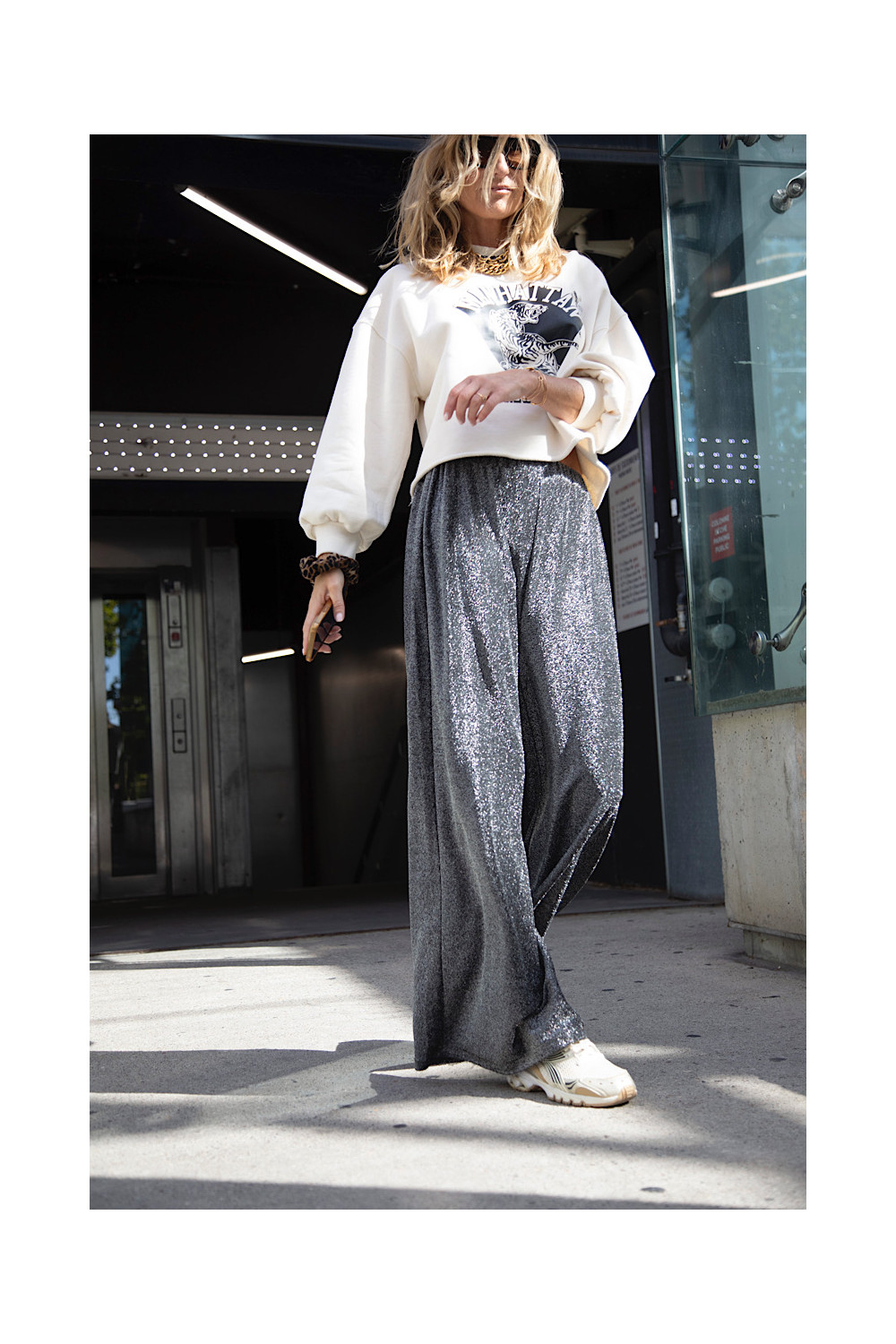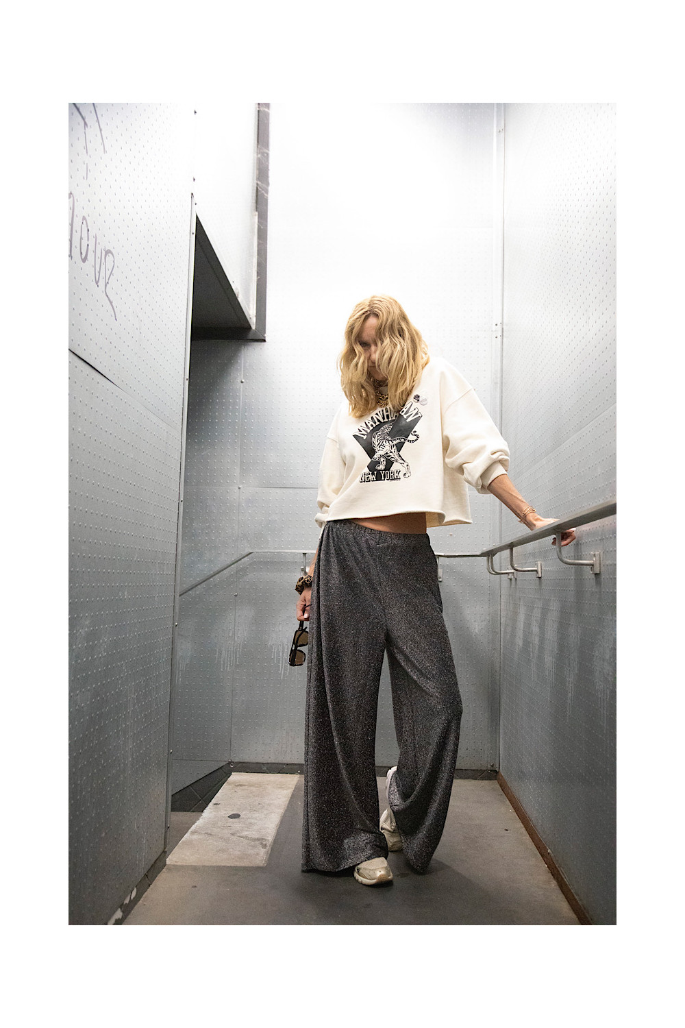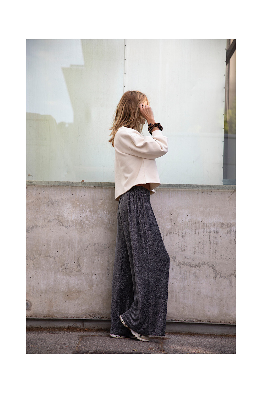 Caractéristique : pantalon fluide en lurex, coupe ample, taille haute, ceinture élastiquée