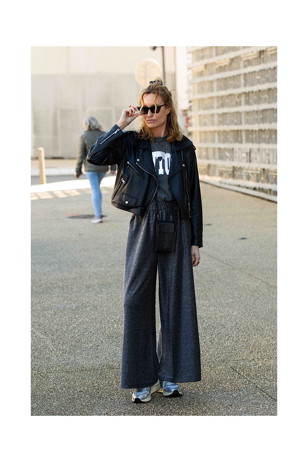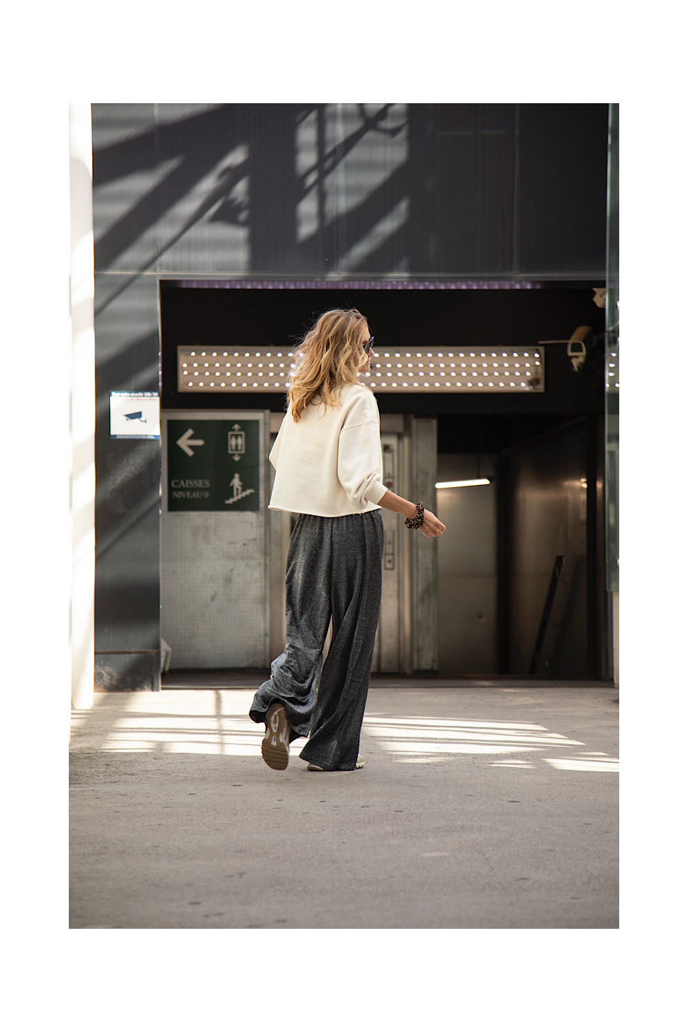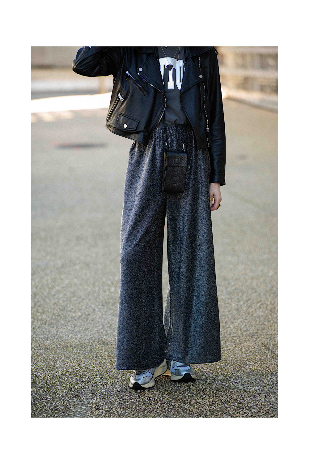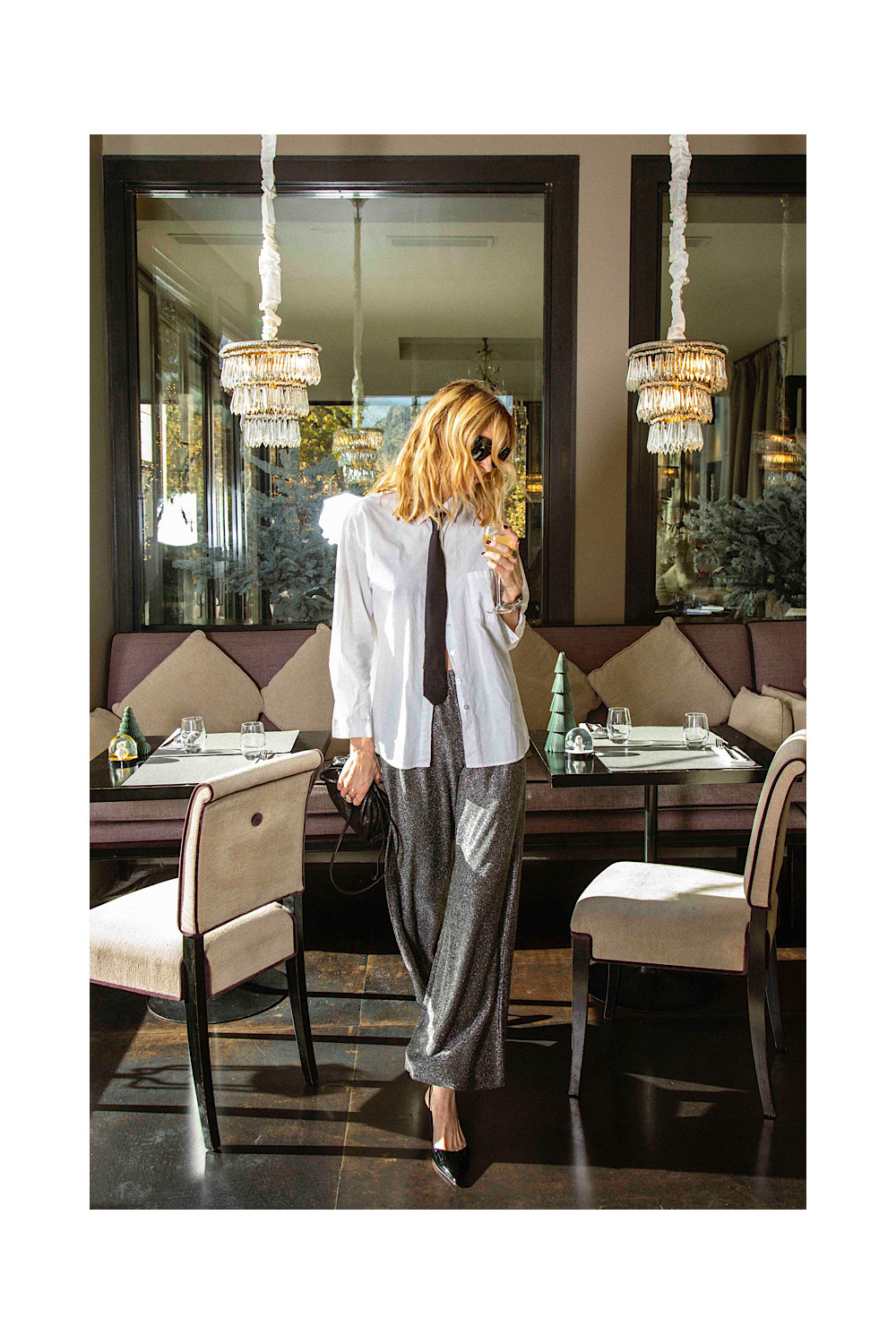 Caractéristique : pantalon fluide en lurex, coupe ample, taille haute, ceinture élastiquée