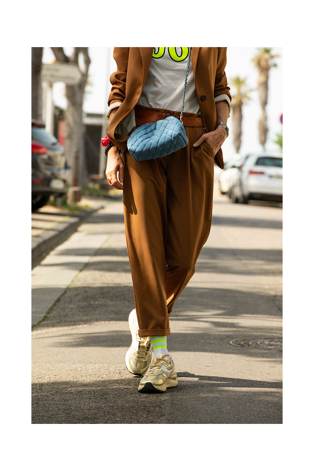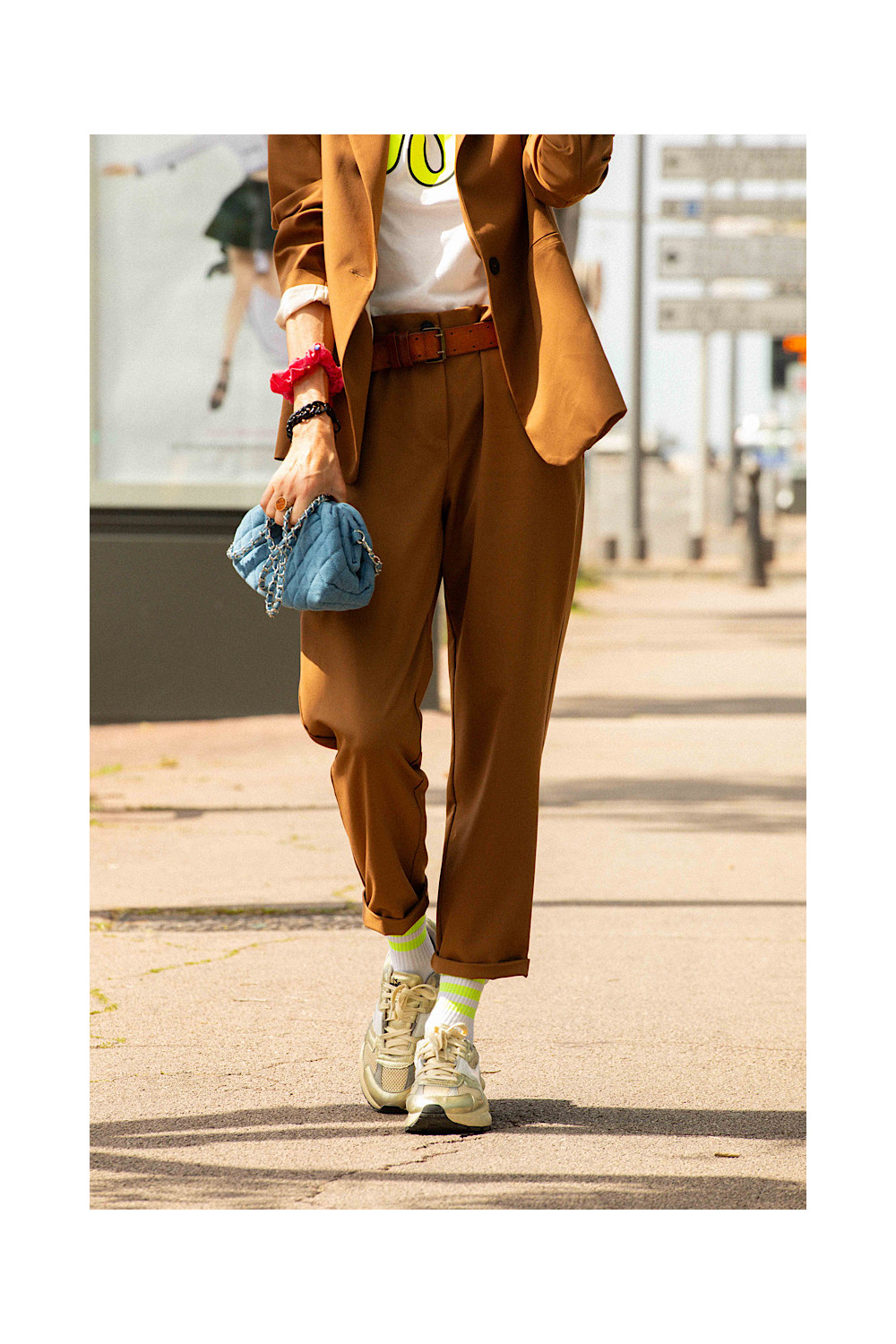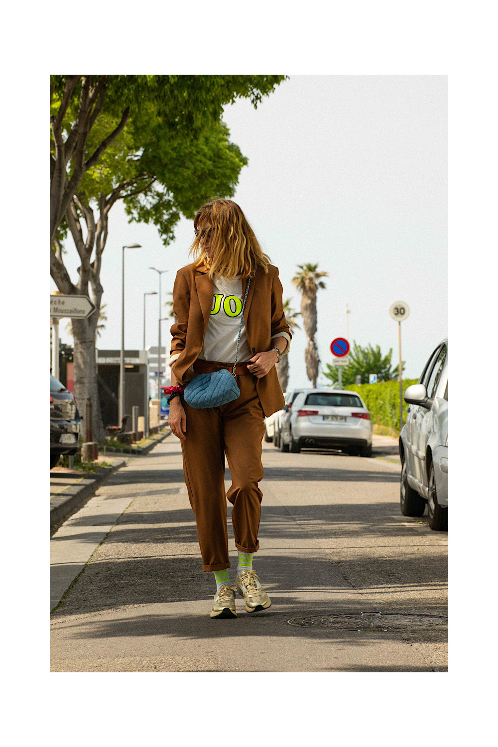 Caractéristiques : pantalon droit marron, 2 poches, petit ourlet, 1 bouton, 1 fermeture éclair, élastique à la taille