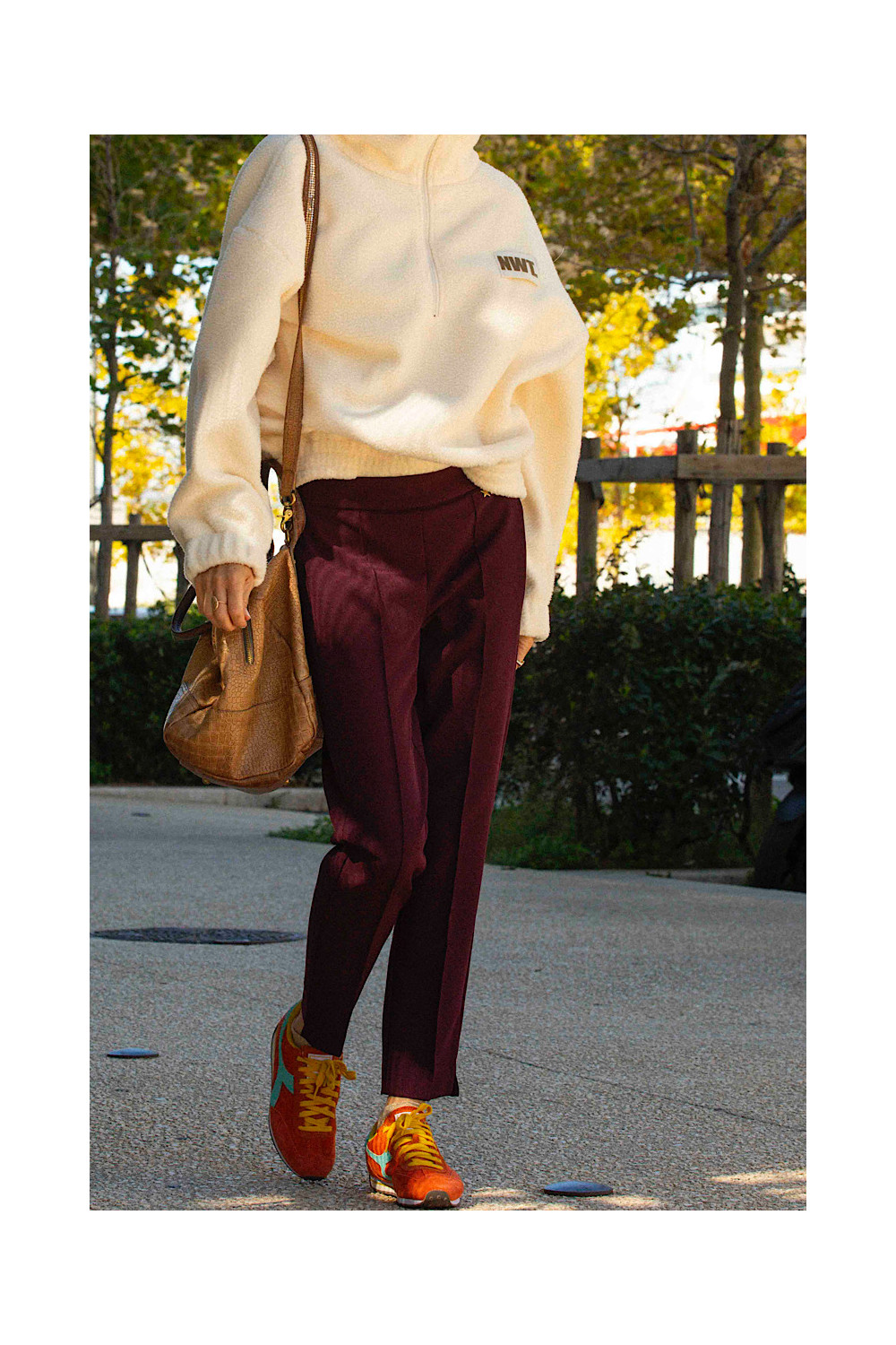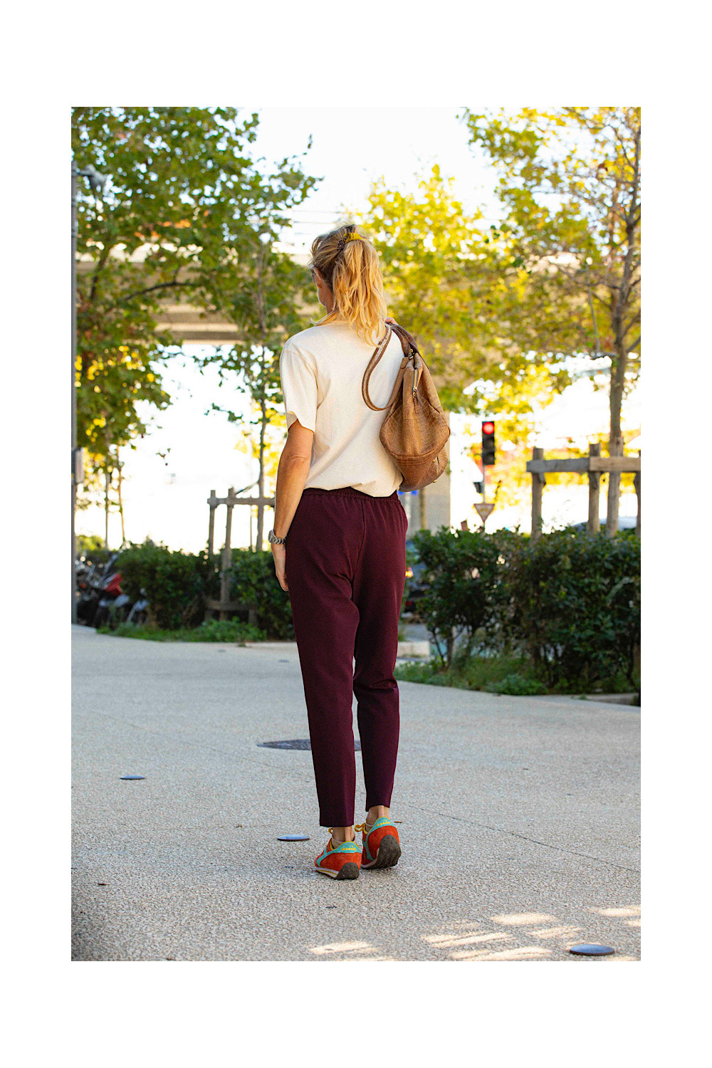 Caractéristiques : pantalon droit bordeaux, élastique à la taille, pas de boutons ni de fermeture éclair, pas de poches