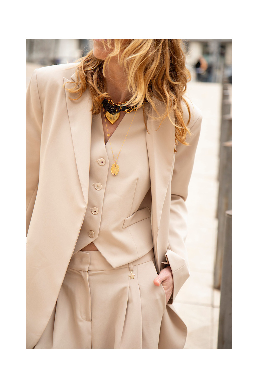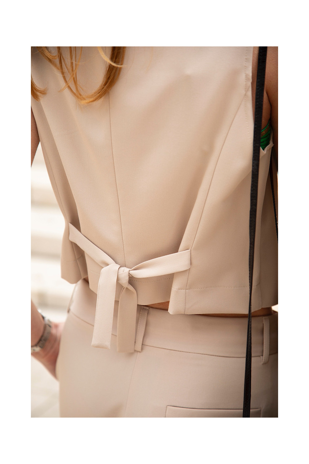 Caractéristiques : gilet sans manche, boutons, noeud à l'arrière