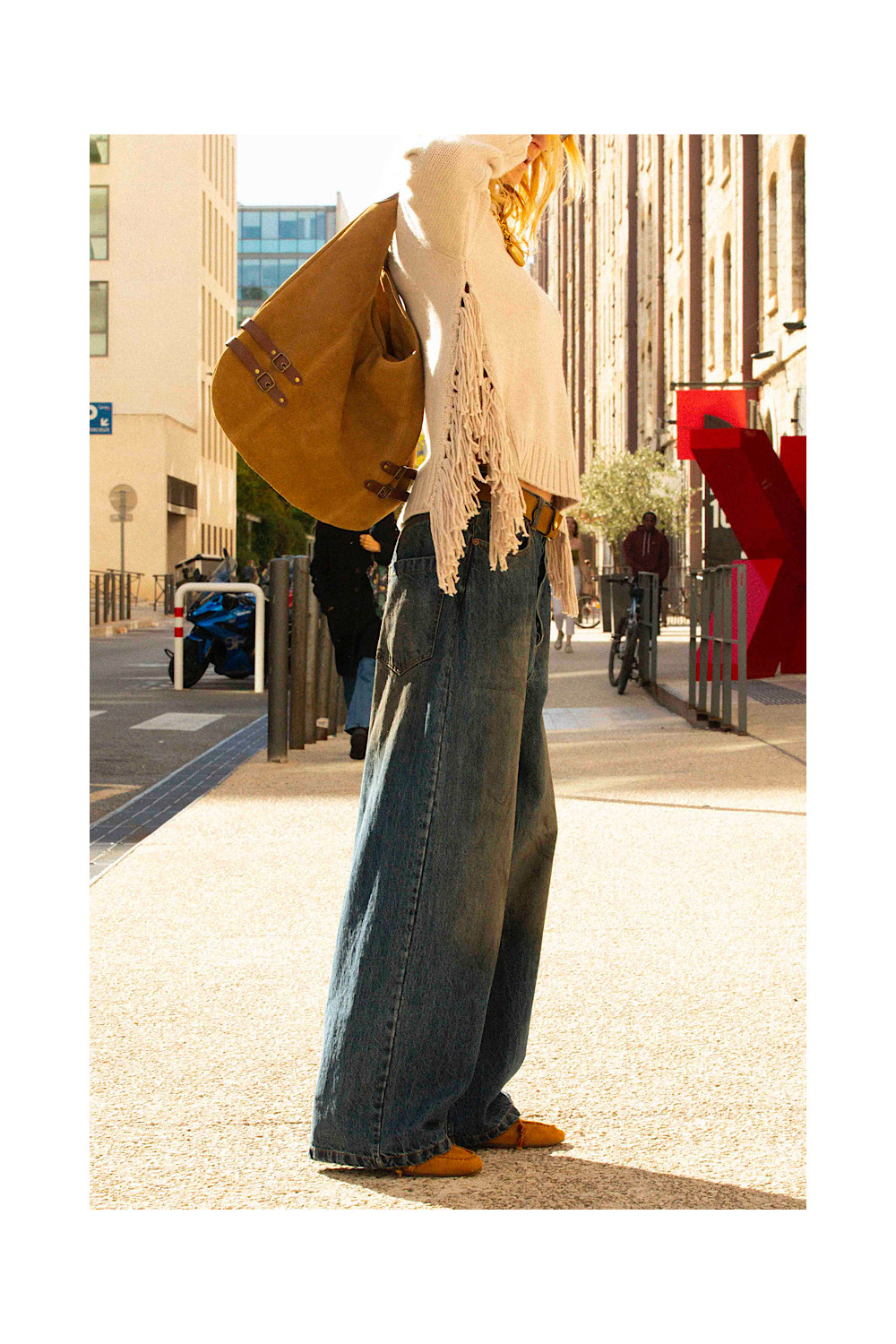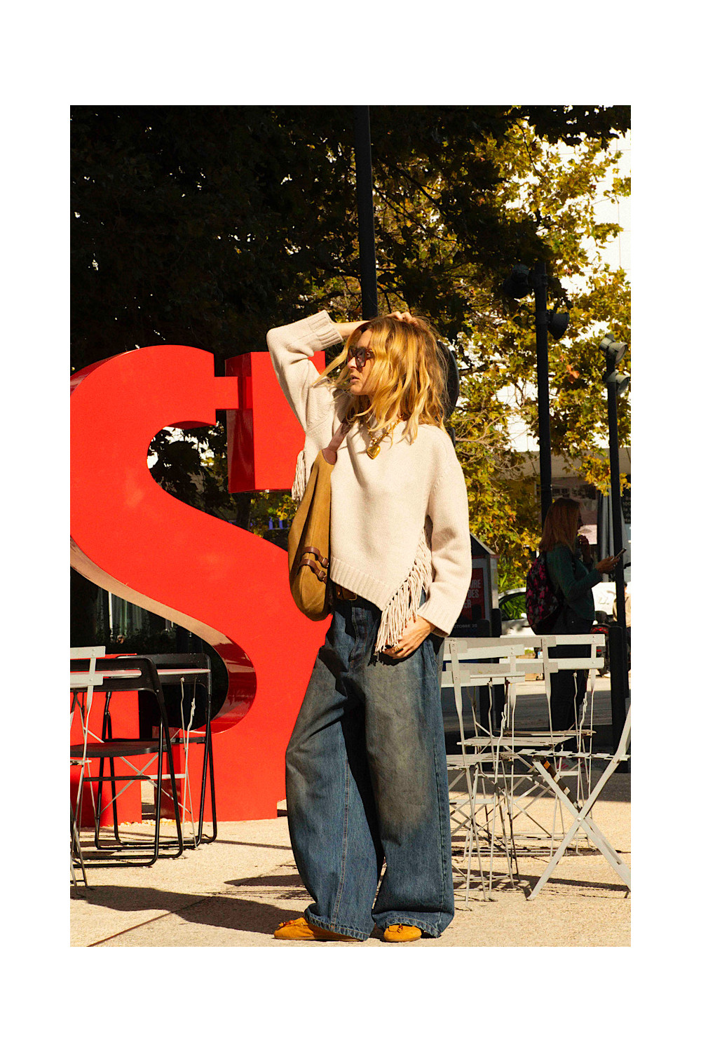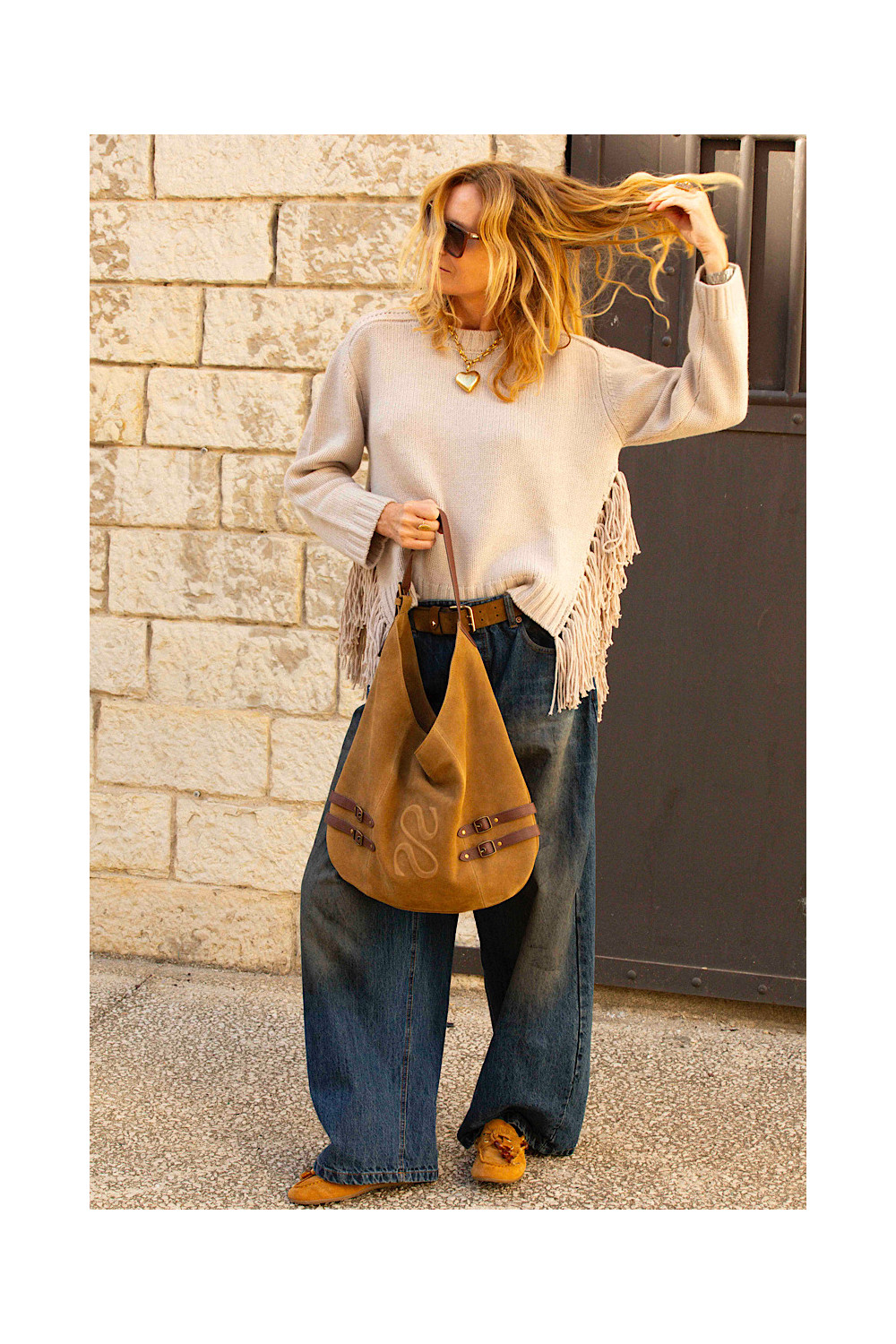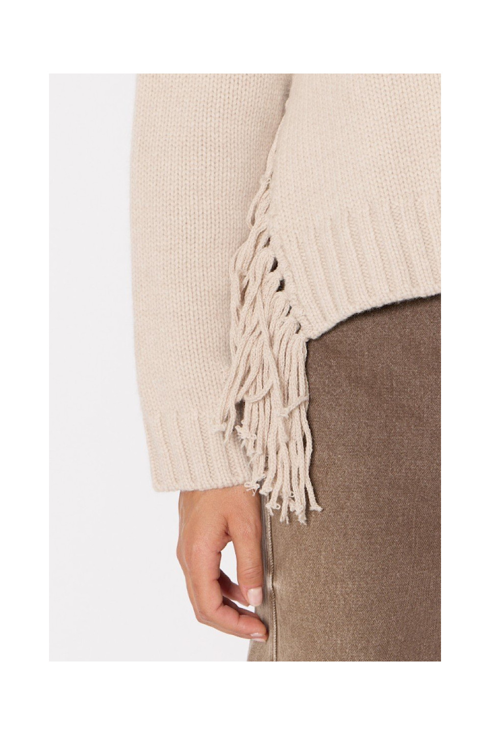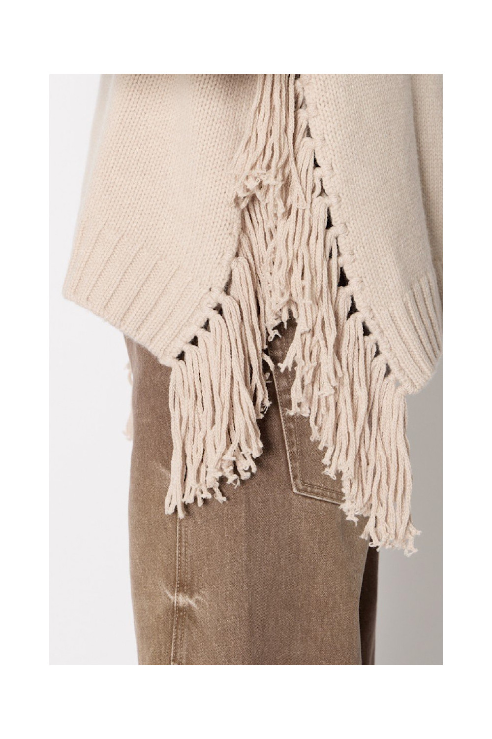 Caractéristiques : pull beige, manches longues, col rond, fentes sur le bas, détails de franges, pull en laine